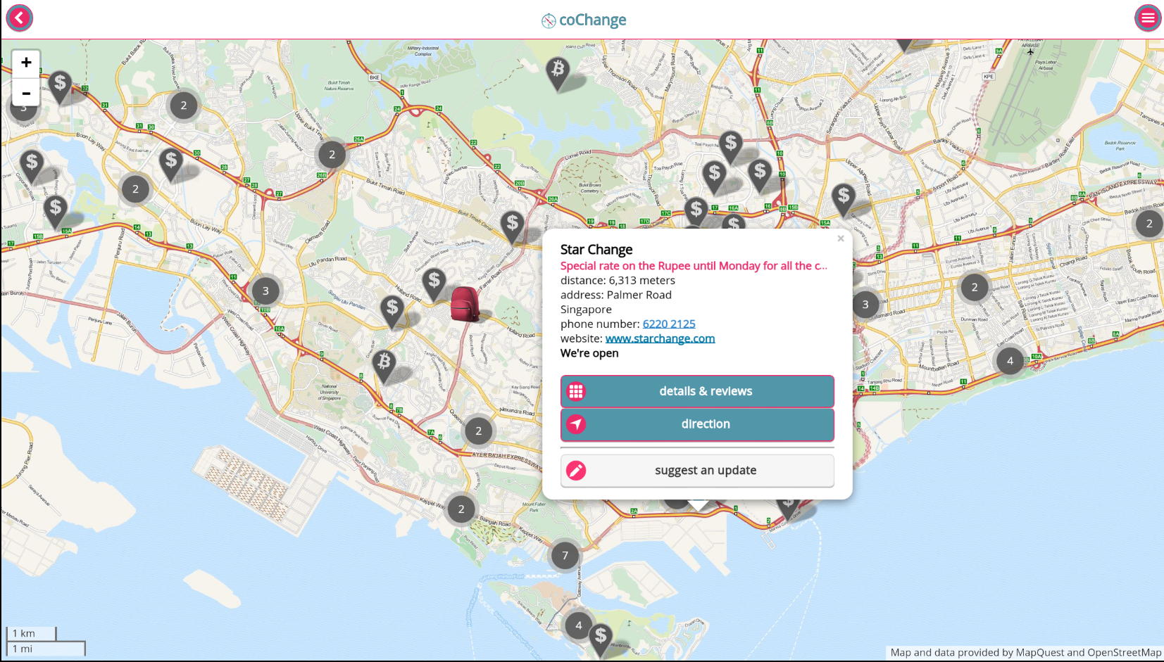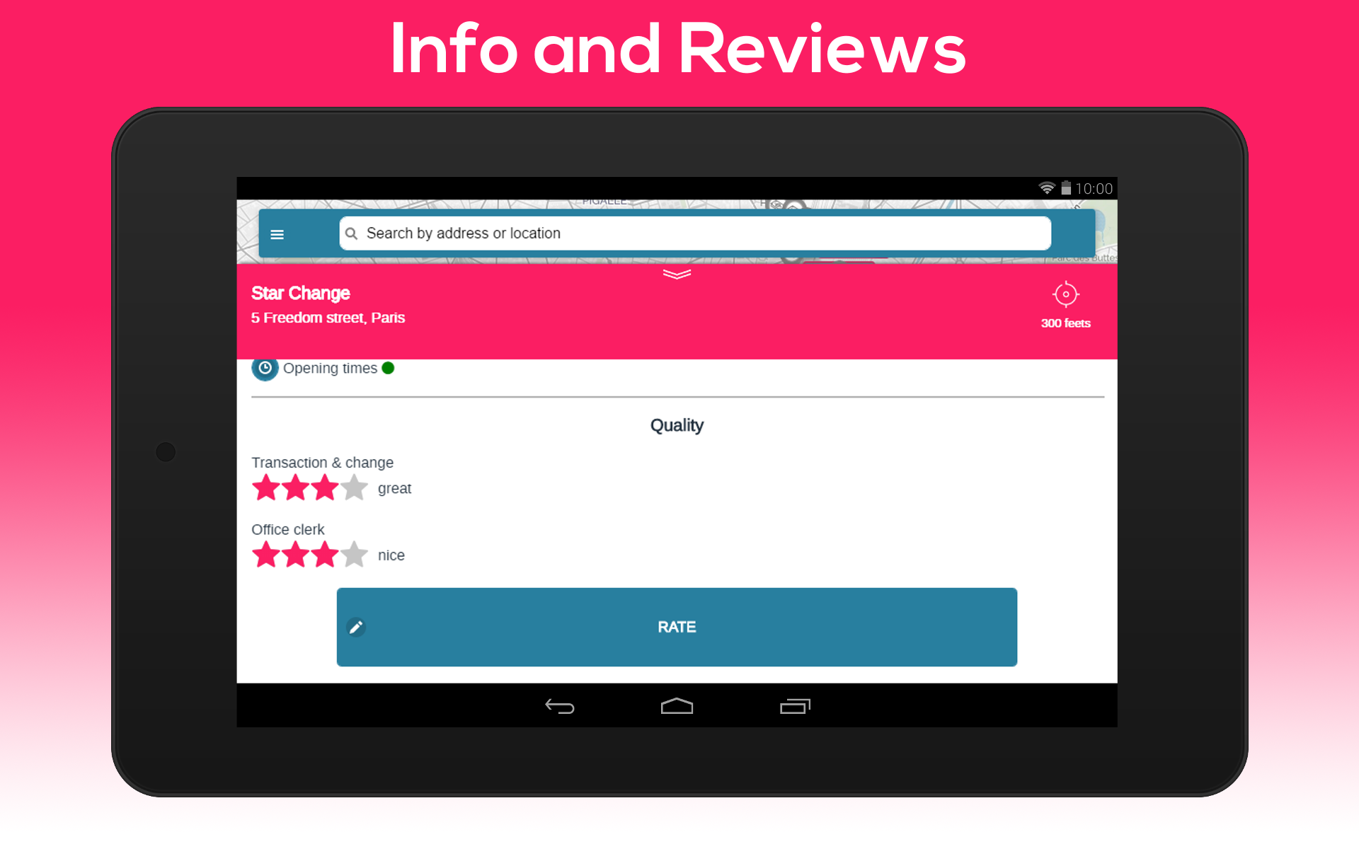 - Show the exchange offices on a map and get its details (address, phone number, website, opening hours, etc.)