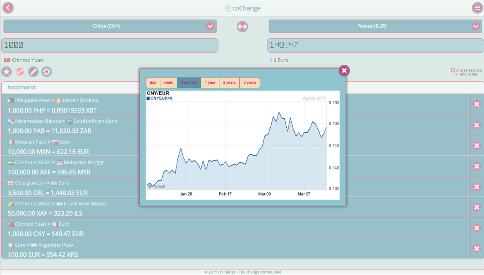 Are you going to travel abroad or did you just arrive in a foreign country without having local currencies? You don’t have the time to run around to visit all the currency exchange offices of the town or be outsmarted with exorbitant fees... In a business trip or a leisure trip, The coChange mobile application is for you!