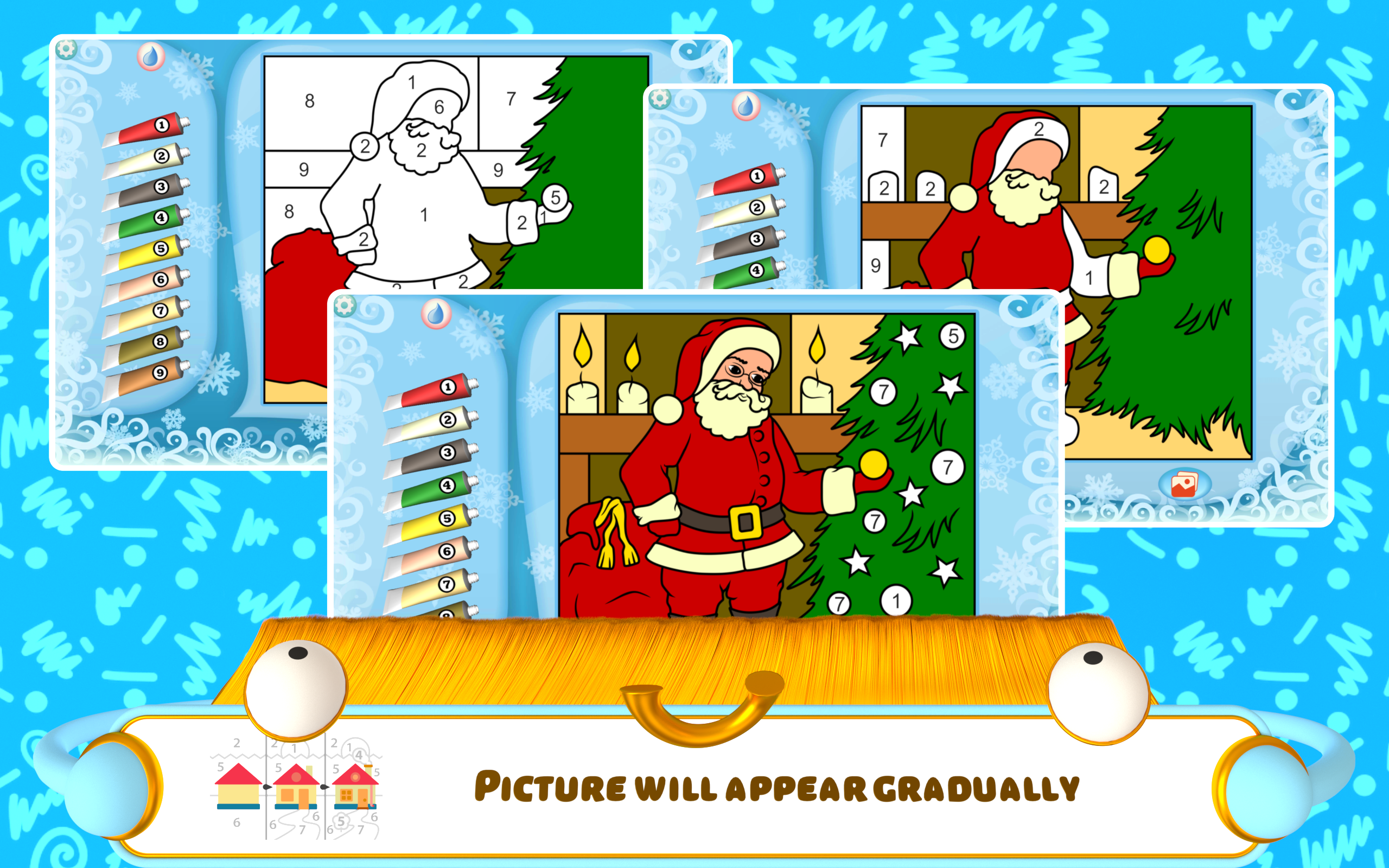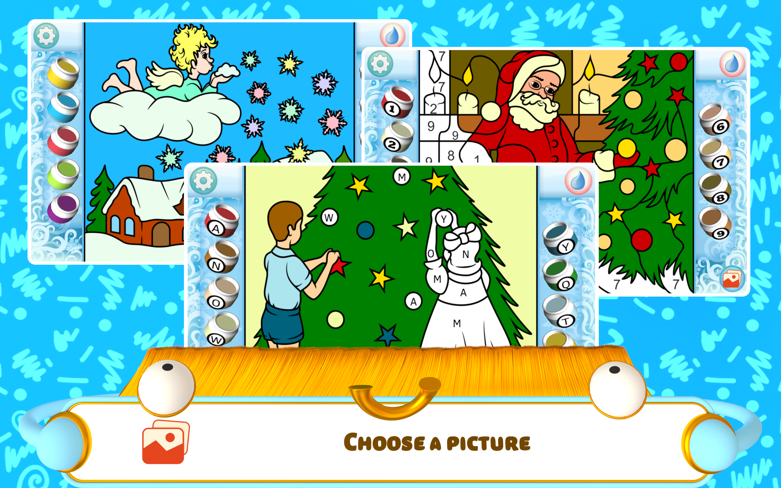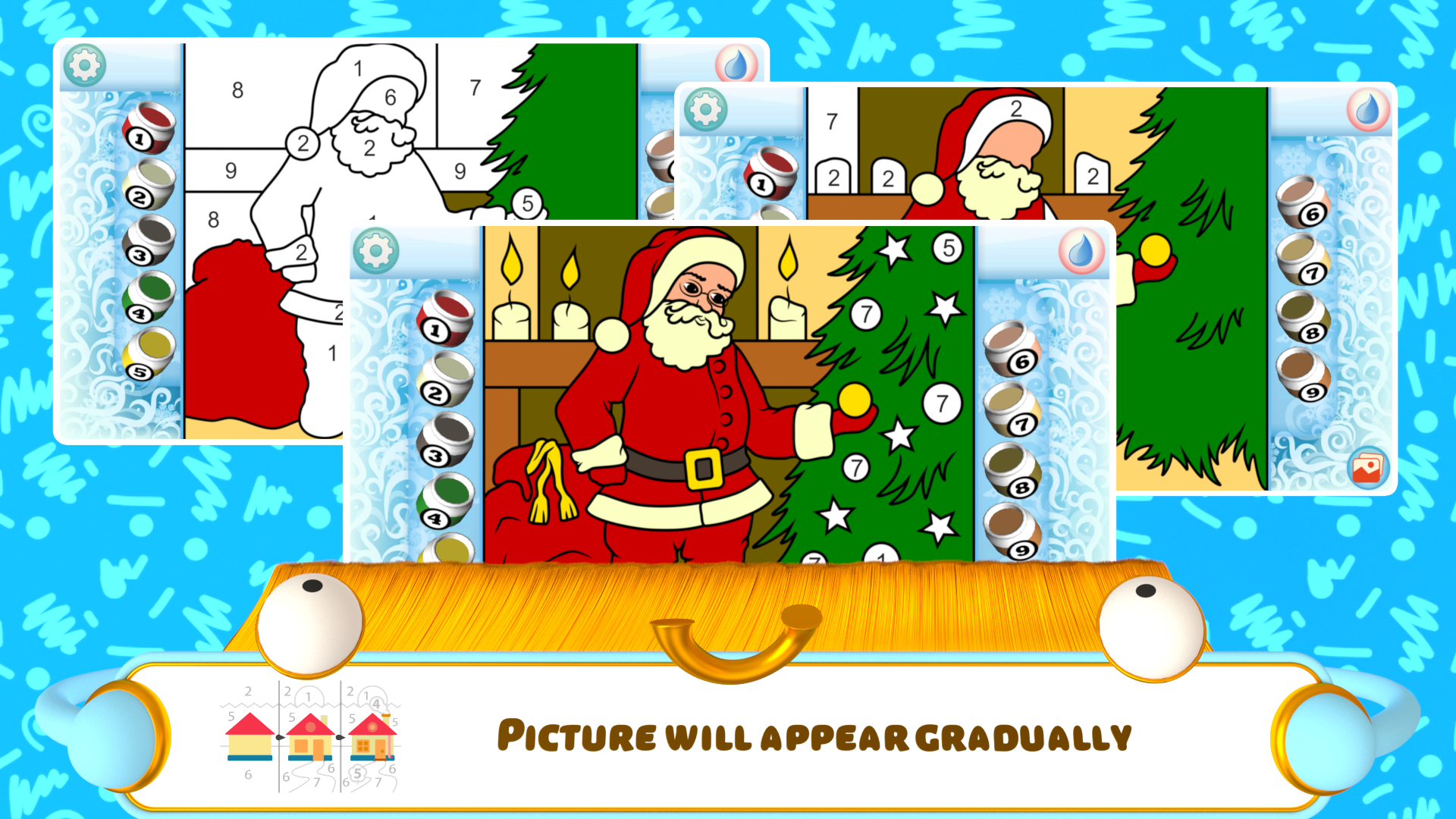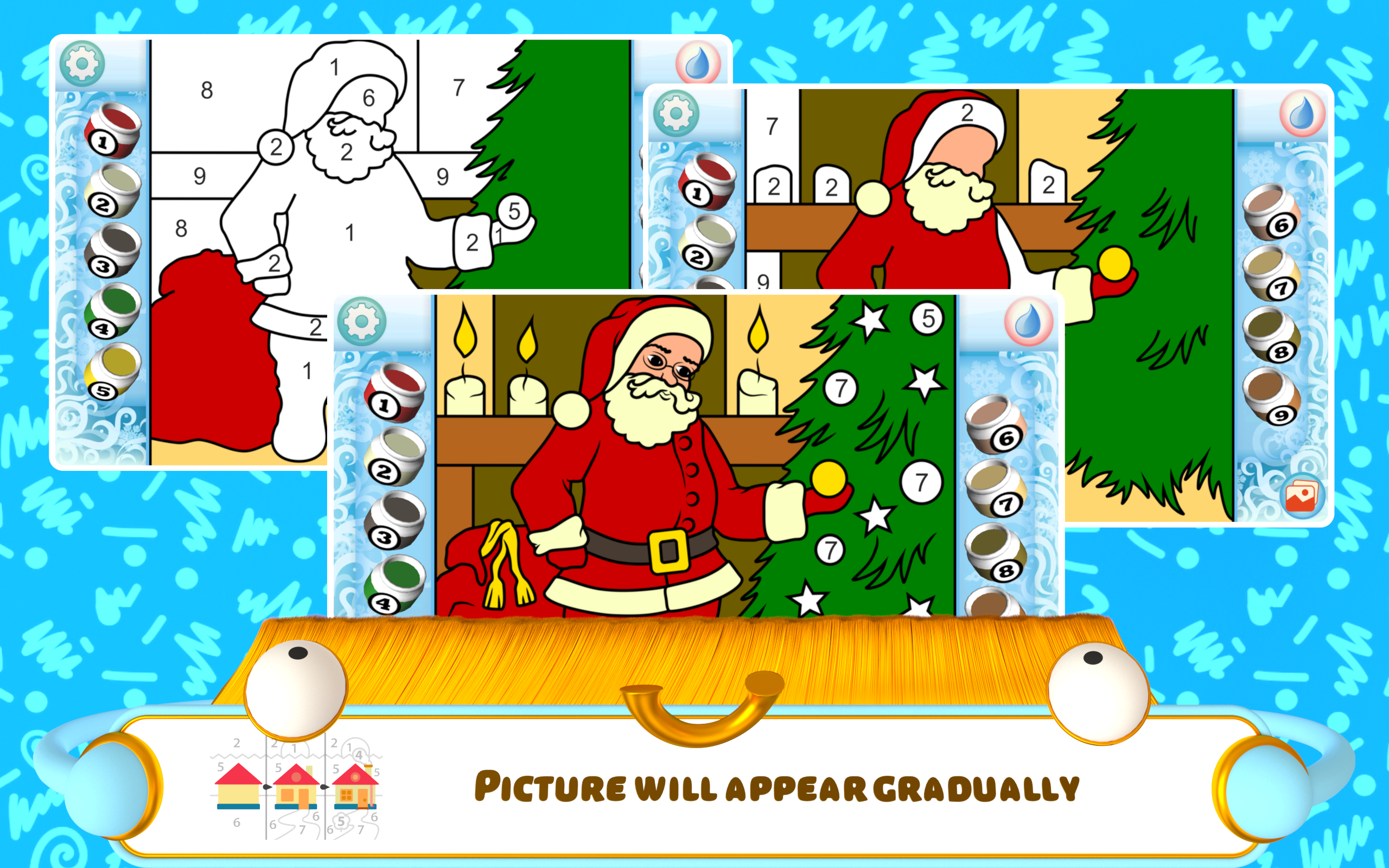 Color the Magic of Christmas: A Festive Coloring Adventure! Unleash your inner artist and dive into the enchanting world of Christmas with our captivating coloring app! Designed for children of all ages, "Color the Magic of Christmas" offers a delightful way to celebrate the holiday season while fostering creativity and developing essential skills. From Santa Claus and his reindeer to cozy Christmas fireplaces and twinkling Christmas trees, explore a winter wonderland of festive illustrations waiting to be brought to life with your vibrant touch. Whether you're a toddler taking their first artistic steps or a seasoned coloring enthusiast, our app provides a relaxing and engaging experience for everyone. Whether you're snuggled up by the fire on a snowy evening or enjoying a festive family gathering, our Christmas Coloring Book app offers a fun and engaging activity for all ages. Perfect for long car rides or quiet afternoons at home, "Color the Magic of Christmas" is a delightful way to spread holiday cheer and embrace the magic of the season, regardless of your lifestyle. - Multiple Coloring Modes: Choose from Easy, Hard, Layered, and Free Draw modes for a tailored coloring experience. Christmas Color by Number for Kids provides hours of fun. - Age-Appropriate Options: Two special modes cater to different age groups, ensuring an enjoyable experience for toddlers and older children alike. Easy Christmas Coloring Pages for the youngest artists, and more challenging options for older kids. - Customizable Palette & Learning Tools: Personalize your color palettes and even replace numbers with letters, shapes, or simple math problems to enhance learning! Christmas Coloring for Toddlers becomes an educational adventure. - Festive Christmas Themes: Immerse yourself in the holiday spirit with a wide array of Christmas-themed illustrations, including Santa Claus Coloring Pages, Christmas Tree Coloring, and Reindeer Coloring Sheets. - Engaging and Educational: Develop fine motor skills, color recognition, and problem-solving abilities while enjoying the festive fun. Holiday Coloring Book and Winter Coloring Book pages offer a fun way to learn. Rediscover the joy of coloring with our extensive collection of Christmas illustrations! From charming Christmas Houses and cheerful Snowmen to jingling Christmas Bells and overflowing Christmas Stockings, every page captures the magic of the season. You'll find classic images like Christmas Gifts Coloring, Christmas Fireplace Coloring, and Christmas Wreath Coloring, along with unique designs to spark your imagination. This Christmas Paint by Number app is the perfect festive activity! Our Christmas Coloring Book app isn't just about fun; it's also a valuable educational tool! Younger children can develop essential pre-writing skills and improve hand-eye coordination while older kids can explore more complex designs and even practice basic math with our number replacement feature. This Festive Coloring Pages app provides a fun and effective way to enhance learning during the holiday season. Experience the joy and wonder of Christmas with "Color the Magic of Christmas"! Our app offers a creative outlet for children of all ages, combining festive fun with educational benefits. Download now and let the coloring adventure begin!