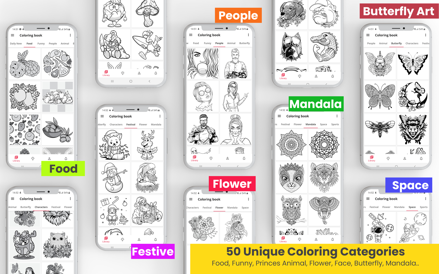 Coloring book for all is divided into smart categories, a few of them are mentioned below