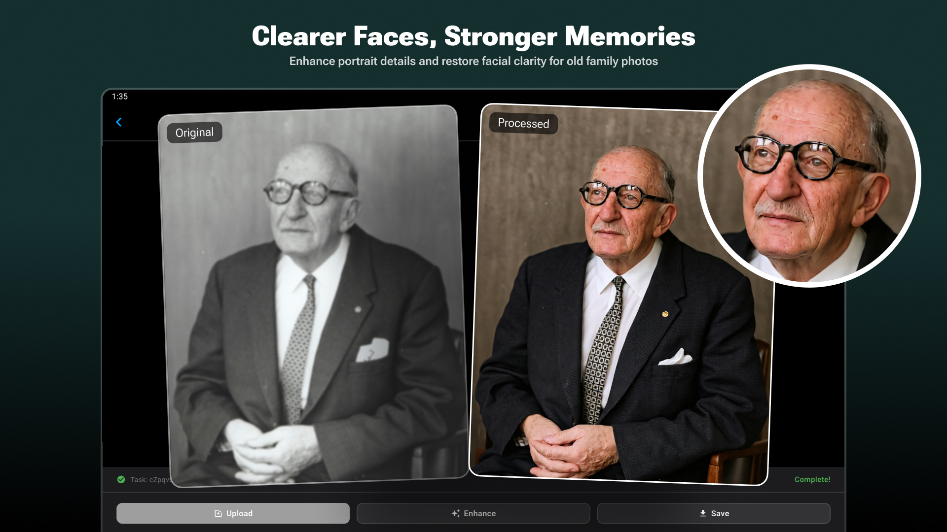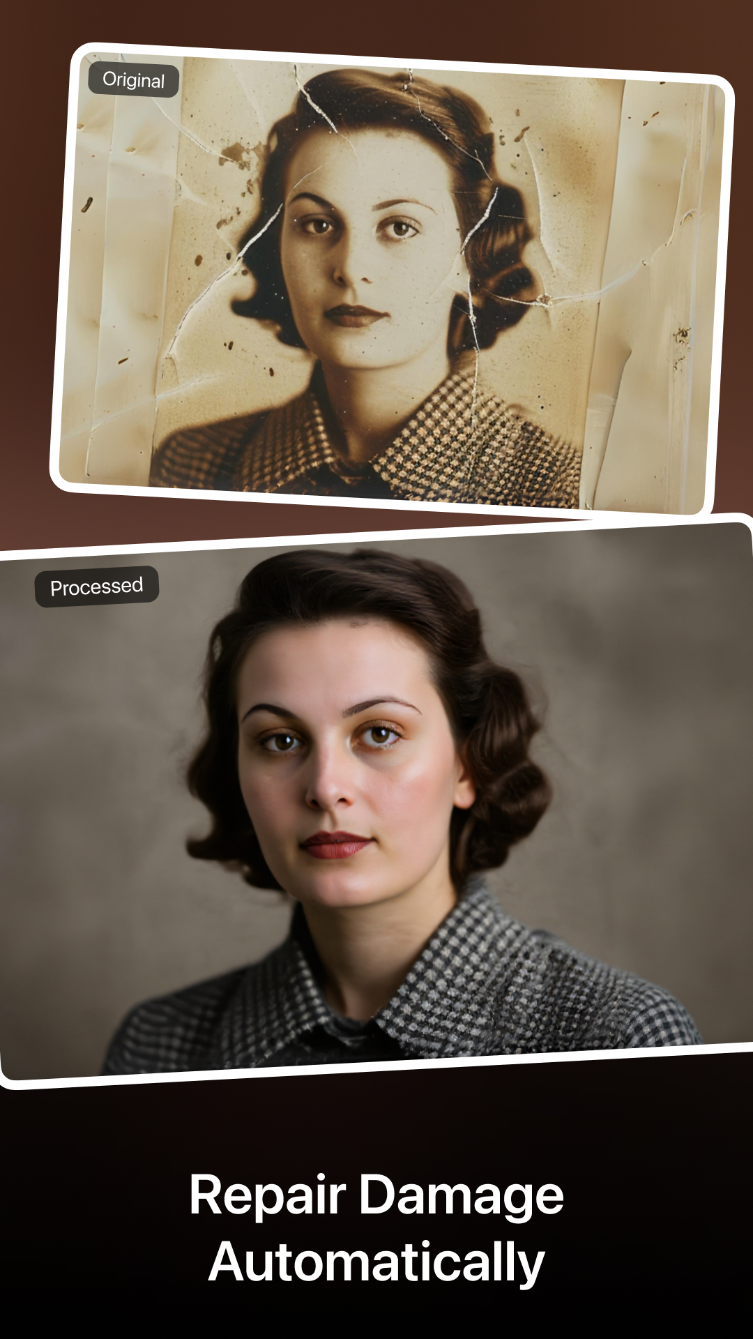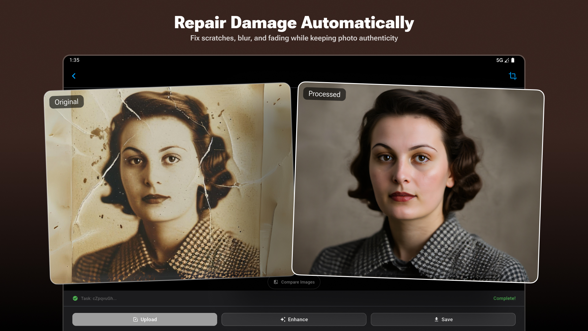 Restore family portraits, repair scratched photos, fix blurry faces, or enhance vintage photos — all in one tap.