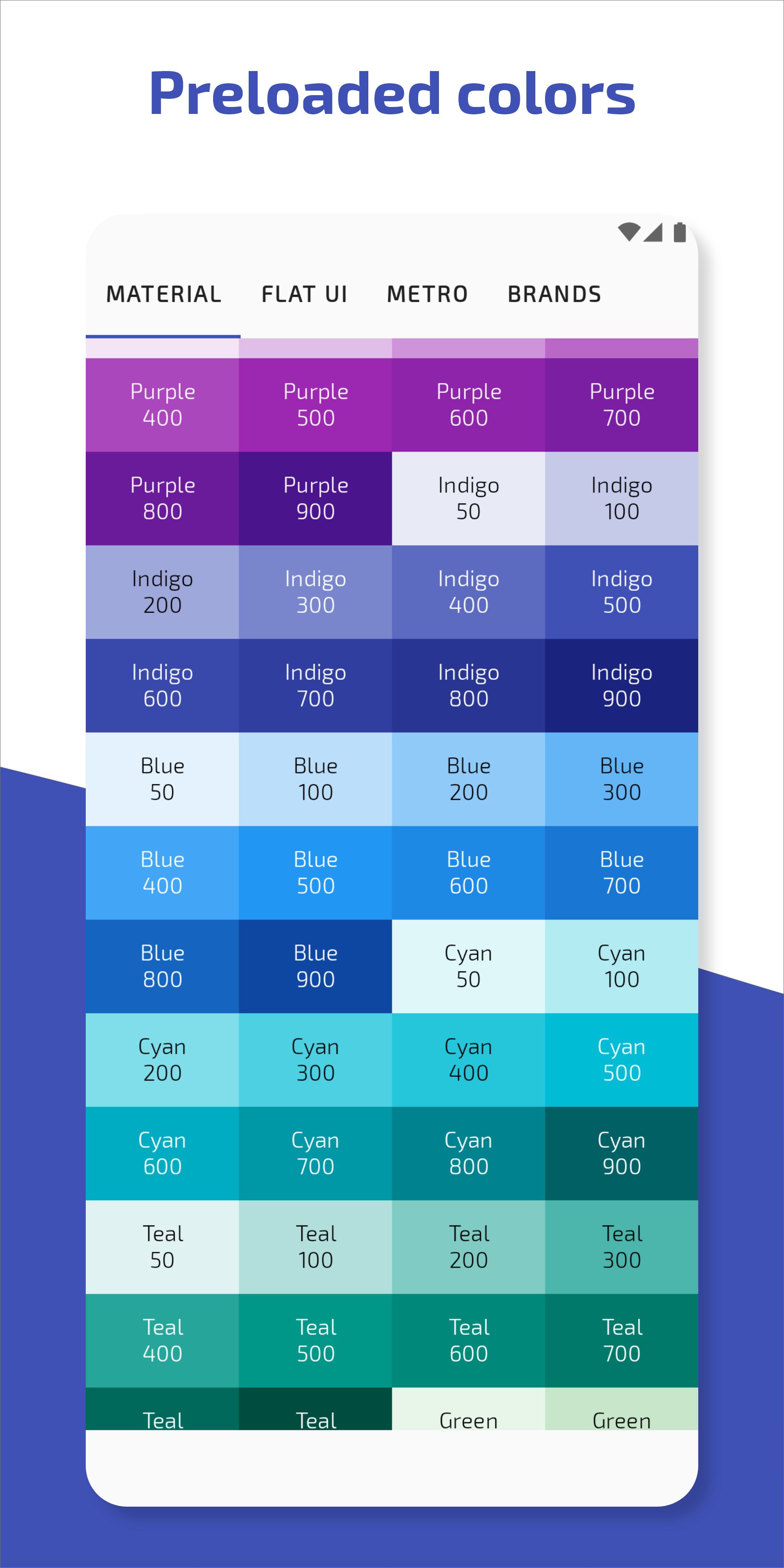 • Preloaded colors: A large list of Material colors, Flat UI, Metro, and brand colors.
