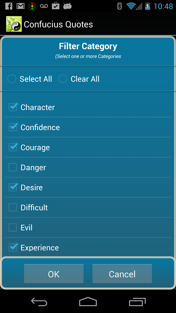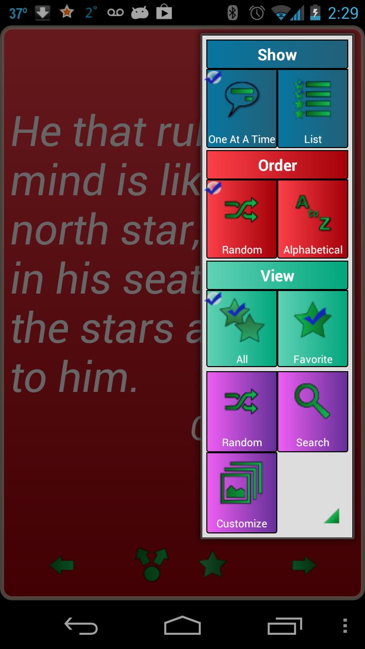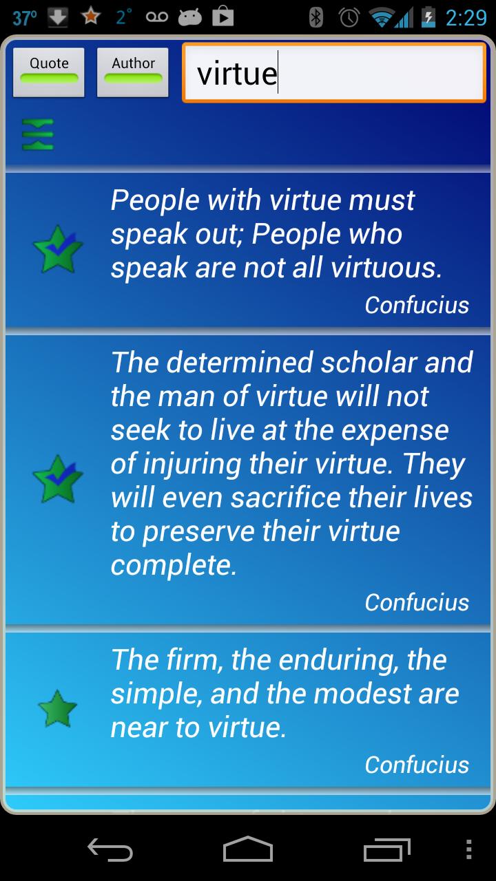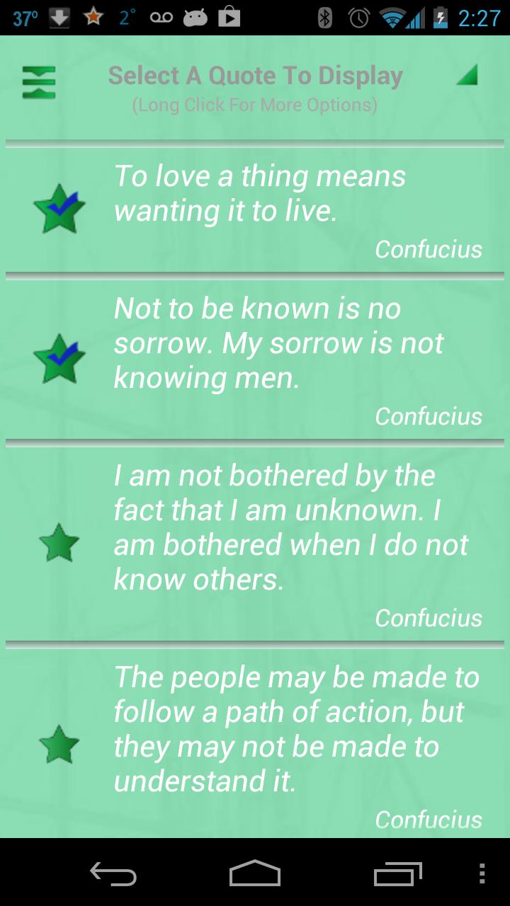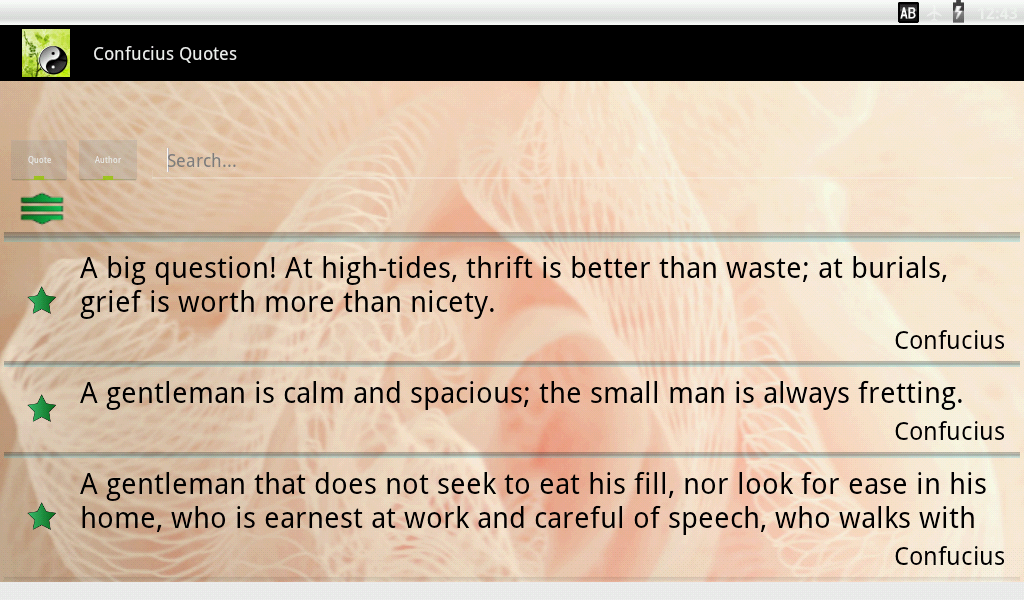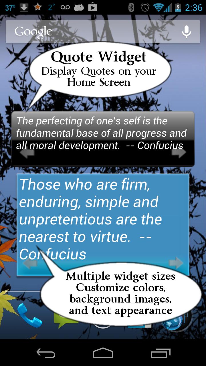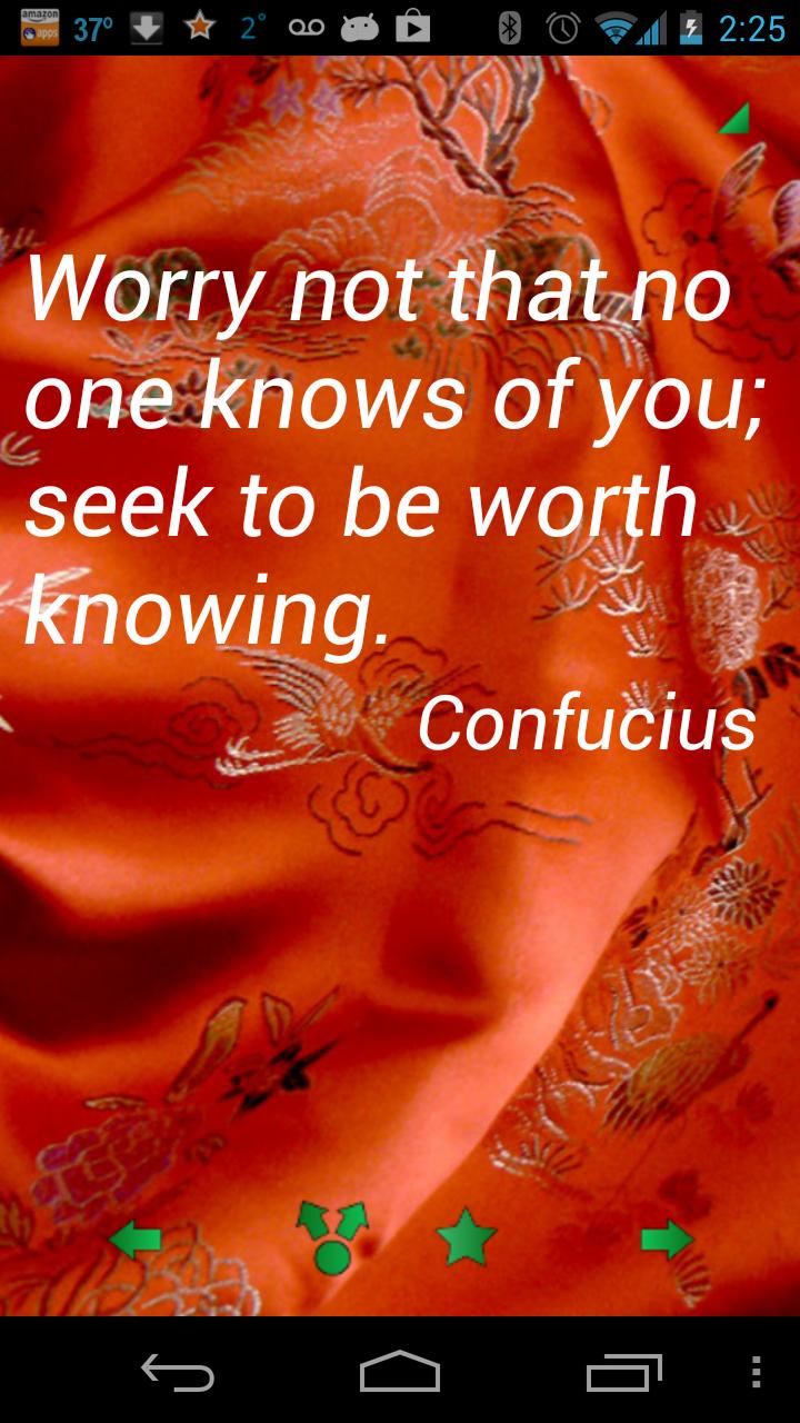 Confucius was one of the greatest ancient Chinese philosophers. His sayings and teachings are geared toward strong morals and personal growth. These quotes from Confucius will inspire and motivate you. This application includes quotes about life, happiness, attitude, opportunities, dreams, relationships, leadership, achievement, success, etc.. - Large number of quotes - Share via Facebook, Twitter, SMS, email and all your social apps - Great search feature, search by quotes and authors - Use author and category filters to personalize your view - Save your favorite quotes for later viewing - Widgets allow you to display a new quote every day on your homescreen - Personalize - Fully control the look of your application. Customize background image, font colors, size and appearance, and even control transparency - Set how often quotes are displayed on widgets (e.g., hourly, daily, etc.) - Choose order of quotes - alphabetical or random - Copy Quote and paste into all your applications Contact me directly from application with your great ideas to make application better, or with any gripes!