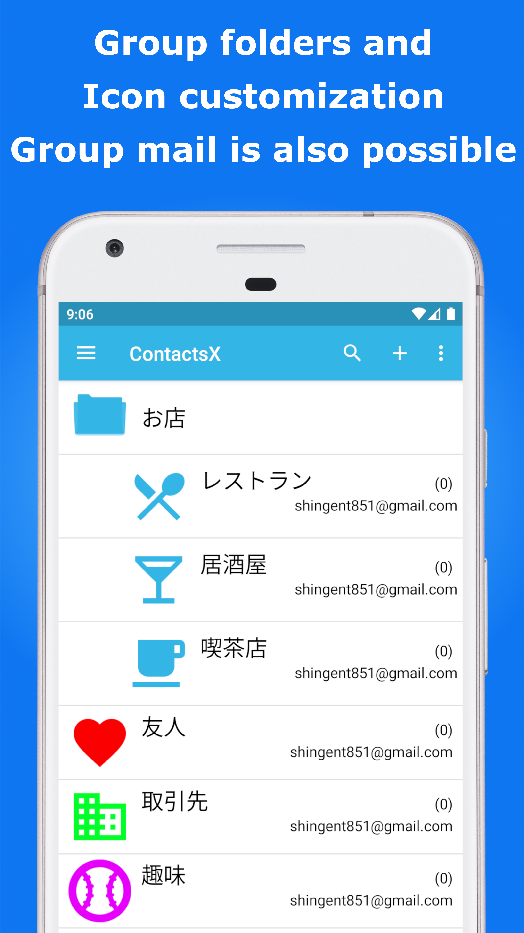 ● Multiple groups can be grouped together using the group folder function. (You can also send emails and SMS to all group members in the group folder)