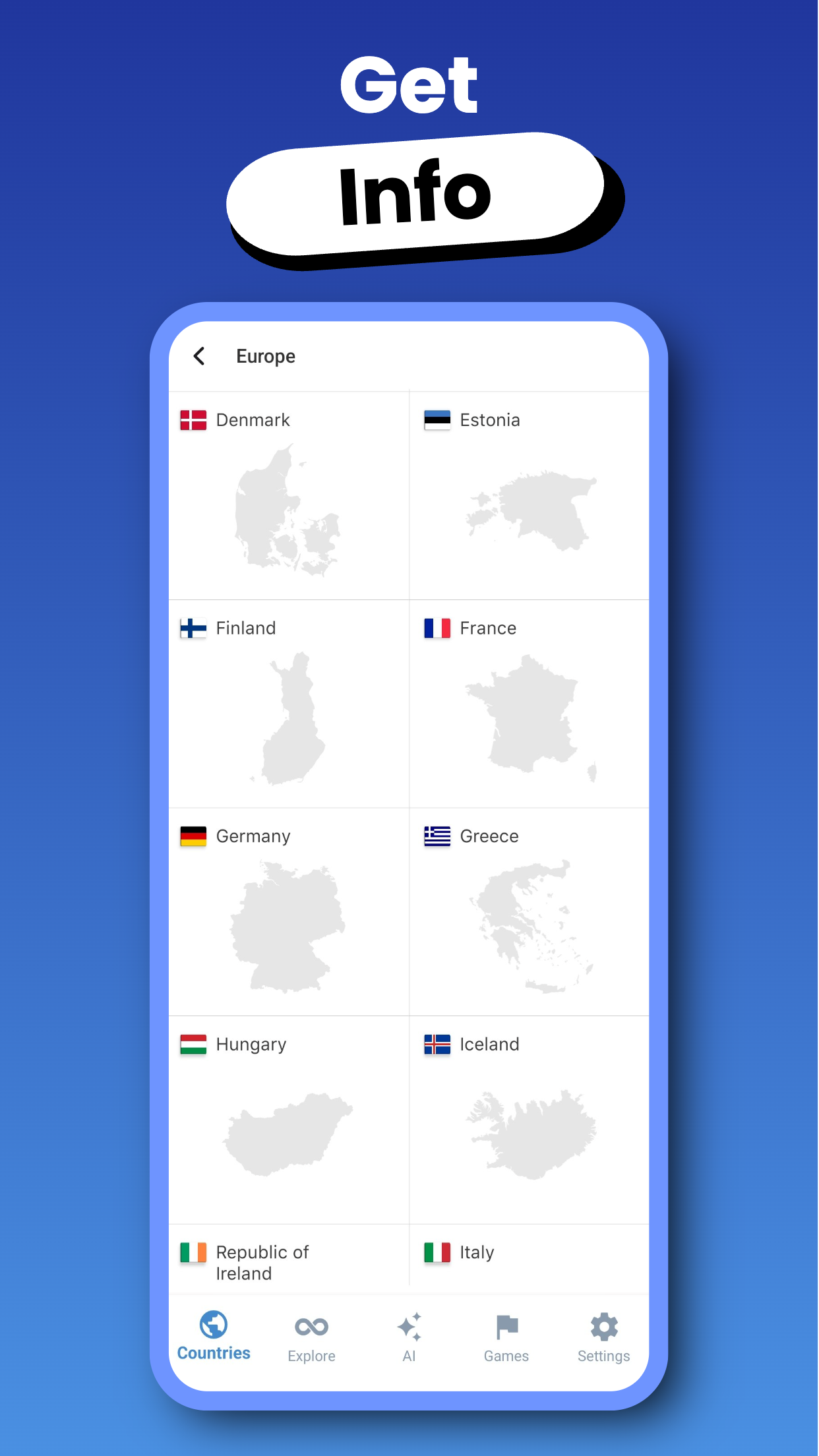 The best way to learn about countries! Explore the continents of Europe, Asia, Africa, North America, South America, and Oceania, and discover information about the countries within them. This app allows you to quickly research countries. By downloading the app: - You can chat with AI about the country of your choice and do online research. - You can better understand the world and the locations of countries with modern maps. - You can take notes about countries—perfect for planning trips. - You can mark the countries you’ve researched, want to visit, or have already visited. - You can read articles about countries, history, economy, geography, culture, and art. Ask the AI anything you’re curious about regarding world countries, cities, historical events, capitals, and tourist attractions, and get answers instantly. Improve your geography knowledge with AI-powered games: the Capital Game and the Country Guessing Game. Perfect for travelers, students, geography enthusiasts, or anyone who wants to gain in-depth knowledge about countries. With a vast knowledge base, world map, and AI support, it’s a comprehensive information platform. Enhance your general knowledge with this app. Start exploring the world right now by downloading the app! With just one tap, access in-depth information about countries and strengthen your knowledge with geography games. Broaden your horizons by discovering cultures, languages, flags, and geographical features from all around the world. Enjoy the pleasure of learning. This app will guide you in getting to know countries!