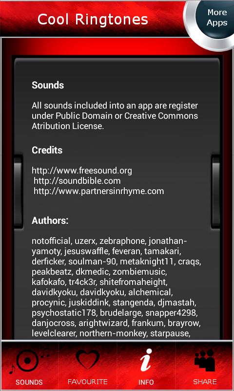 Want some cool ringtones for smartphone? Ok, it is not a problem. We made for you the best ringtones application with only cool ringtones, top sounds and most popular melodies. And your job is only to download free Cool Ringtones app and enjoy your newest ringtones and latest relaxing sounds. It is fantastic. In this cool app you will find best guitar songs, summer remix ringtones, funny horns and sirens sounds, baby melodies, and many other interesting top ringtones. Also, our cool app collected for Android™ mobile phones latest strong rock ringtones, top techno sounds as well as disco music tones. Try to imagine as you are in discotheque while you are listening popular club music melodies or techno sounds. Enjoy our hip hop rhythms beats and inevitable and always popular funny ringtones, cartoon sounds, fart sound effects to make best pranks with friends, or maybe horror ringtones to scare you little bit. The best cool ringtones are played on the popular music instruments such as piano, cool violin, flute, drums and amazing guitar, which gives incredible and always trendy top songs. These powerful instruments can give various but always hot music hits. And because of that there is around us lot of beautiful romantic melodies, love music, many nature relaxing sounds. Enjoy in acoustic guitar cool ringtones. Here, in this coolest app you can hear and classical music sounds and popular ringtones made by amazing and very respectable composers - Mozart, Bach, Vivaldi, Beethoven. Relax for a while with xmas music during new year, or during summer, why not? Set shaking bells as sms tone and you can wait for Santa. Do you know what you can do with these cool sounds? Lot of things. You can listen latest music melodies whenever you want for free. You will have plenty of magnificent cool sounds to set as contact ringtone then big collection of the best message tones, to set as sms or notification sounds. And every morning you can set different cool alarm sounds and you will wake up with a smile. Also some of you will certainly download baby sounds or lullabies to entertain child. Cheer up with coolest funny baby ringtones. If you love nature enjoy fantastic animal ringtones and picefull bird sounds. The application features: - set as ringtone or contact ringtone - set as sms, notification - set as alarm - set as favorite Download free ringtones app and enjoy cool ringtones, top sounds and latest melodies. This is best soundboard with the most popular ringtones. Latest melodies, great tunes and lot of fun, all of these in this amazing app for free. Everyone likes to listen music, and everyone has favorite songs. We are completely sure you will absolutely love this new app.These popular ringtones are for everybody. Pick your favorite free ringtones and enjoy. The application is designed for android phones and android tablets, and it is tested on many android devices to ensure the best user experience. All ringtones in this app are under public domain or creative commons license. If you have a question or suggestion, just email us.