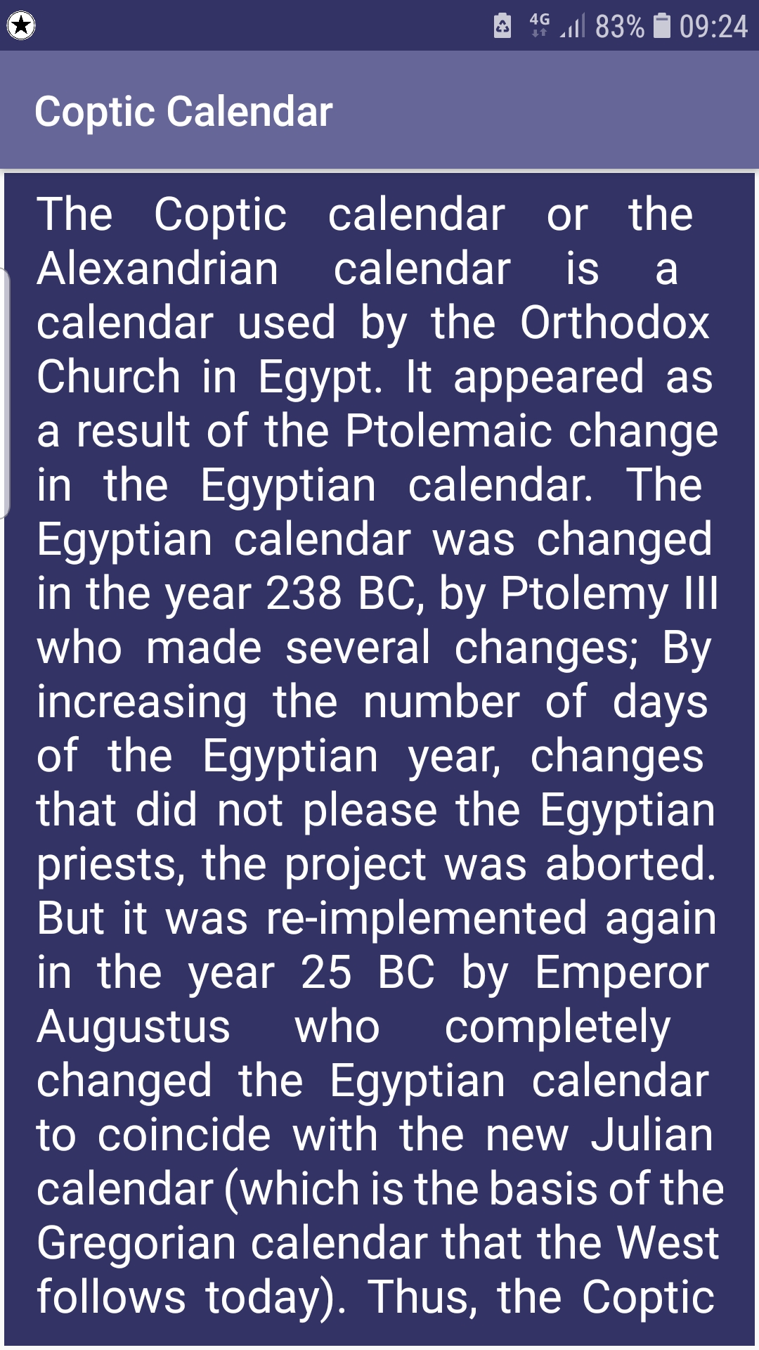 The Coptic calendar or the Alexandrian calendar is a calendar used by the Orthodox Church in Egypt. It appeared as a result of the Ptolemaic change in the Egyptian calendar. The Egyptian calendar was changed in the year 238 BC, by Ptolemy III who made several changes; By increasing the number of days of the Egyptian year, changes that did not please the Egyptian priests, the project was aborted. But it was re-implemented again in the year 25 BC by Emperor Augustus who completely changed the Egyptian calendar to coincide with the new Julian calendar (which is the basis of the Gregorian calendar that the West follows today). Thus, the Coptic calendar, which the Egyptian Orthodox Church operates in until today, came into existence, which differs from the Egyptian Pharaonic calendar. However, the Egyptian calendar remained in use by some astronomers until the Middle Ages, so the Ethiopian calendar was affected by the Egyptian calendar in terms of the number of months of the year, with different names for the months. The Coptic calendar originated in the year 4241 BC, that is, in the forty-third century BC, when the ancient Egyptians observed the Yamani poetic star, and put this calendar by observing three natural phenomena together, namely: “the burning sunrise of the star” with the “sunrise” with the advent of The Nile Flood.” Then they calculated the period between each two apparitions until they reached the number of days of the year. They divided the year into three great seasons, namely: flood, seed and harvest. Then into twelve months, each month of which is thirty days, and they added the remaining period, which is five and a quarter days, and made it A month they called the small month, and the Coptic year became 365 days in a simple year and 366 days in a leap year. The Egyptian farmer respected this calendar due to its conformity with the agricultural seasons and still follows it today. The first month of the Coptic year is the month of Tut, in reference to the astronomer who set the ancient Egyptian calendar and invented the letters. Tut was born in the village of Mantoot, which still exists, and belongs to the Abu Qurqas Center, Minya Governorate, Upper Egypt, with the same old name. The Egyptologist "Breasted" wrote that this great calendar was carried by "Julius Caesar" to Rome and was used there as the best calendar. It is mentioned by Dr. Isaac Obeid, in his book "The Wisdom of the Egyptians": This calendar is the first scientific calendar "solar calendar" followed by all the peoples of the civilized world. And that the global Gregorian calendar is taken from the Gregorian calendar, which is taken from the Roman calendar, which is taken from the Egyptian calendar. The meaning of the Coptic calendar is a solar calendar, because it is related to agriculture - as we have also mentioned here in the Anba Takla Haymanot website in other sections - where it is not possible to organize the beginning of sowing and harvesting according to the Hebrew lunar calendar - bearing in mind that the Hebrews and Arabs depend on grazing and not agriculture. It is a fact that is now ignored by the prevailing culture in Egypt, which insists that we Egyptians are Arabs. Adapted from: https://www.marefa.org/التقويم_القبطي Translated by Google