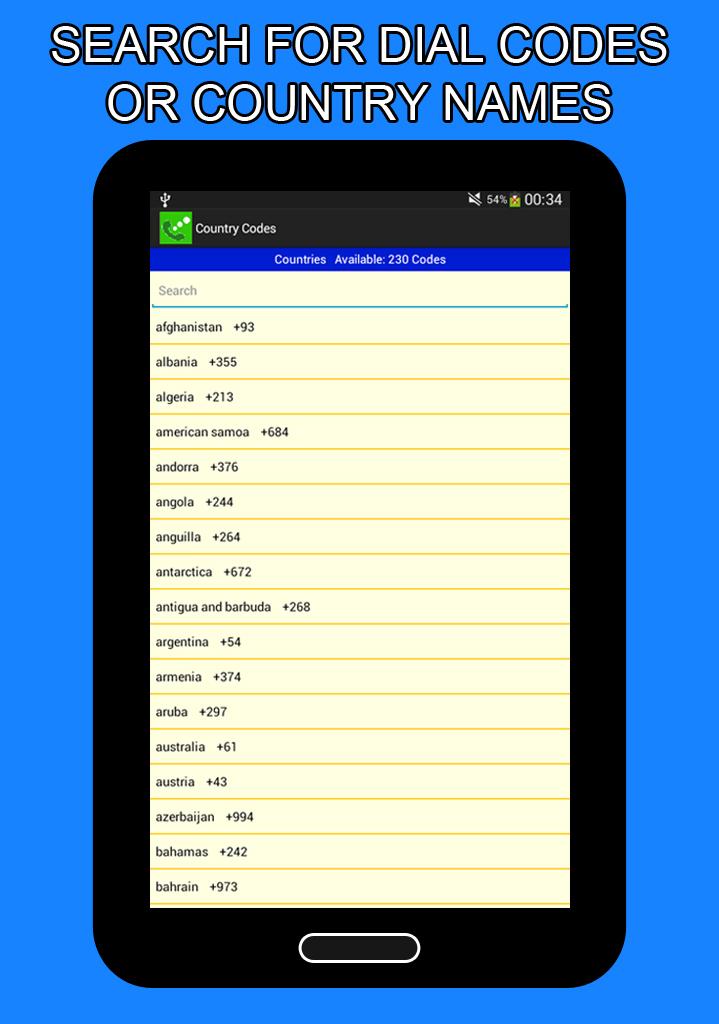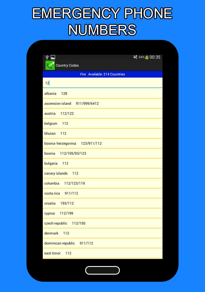 Country codes - international is an application for dial codes of countries, areas and cities, mobile phone operator codes, emergency phone codes such as police, ambulance and fire from all countries around the world.
