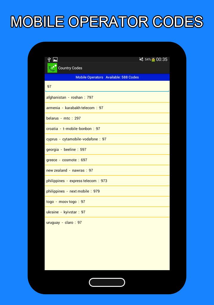 ★With Country codes - international you can search for over 500 mobile phone operator codes in different countries.