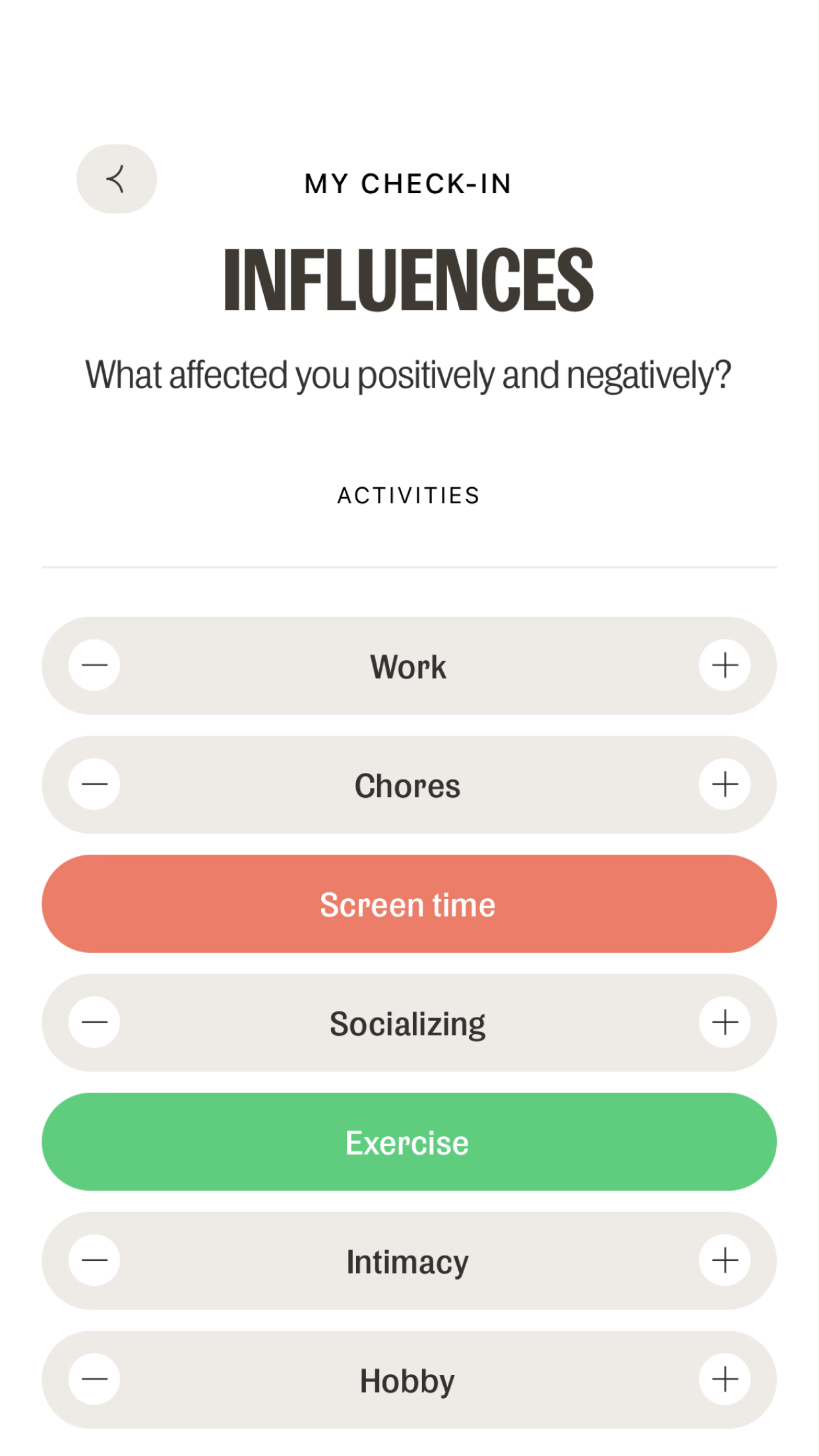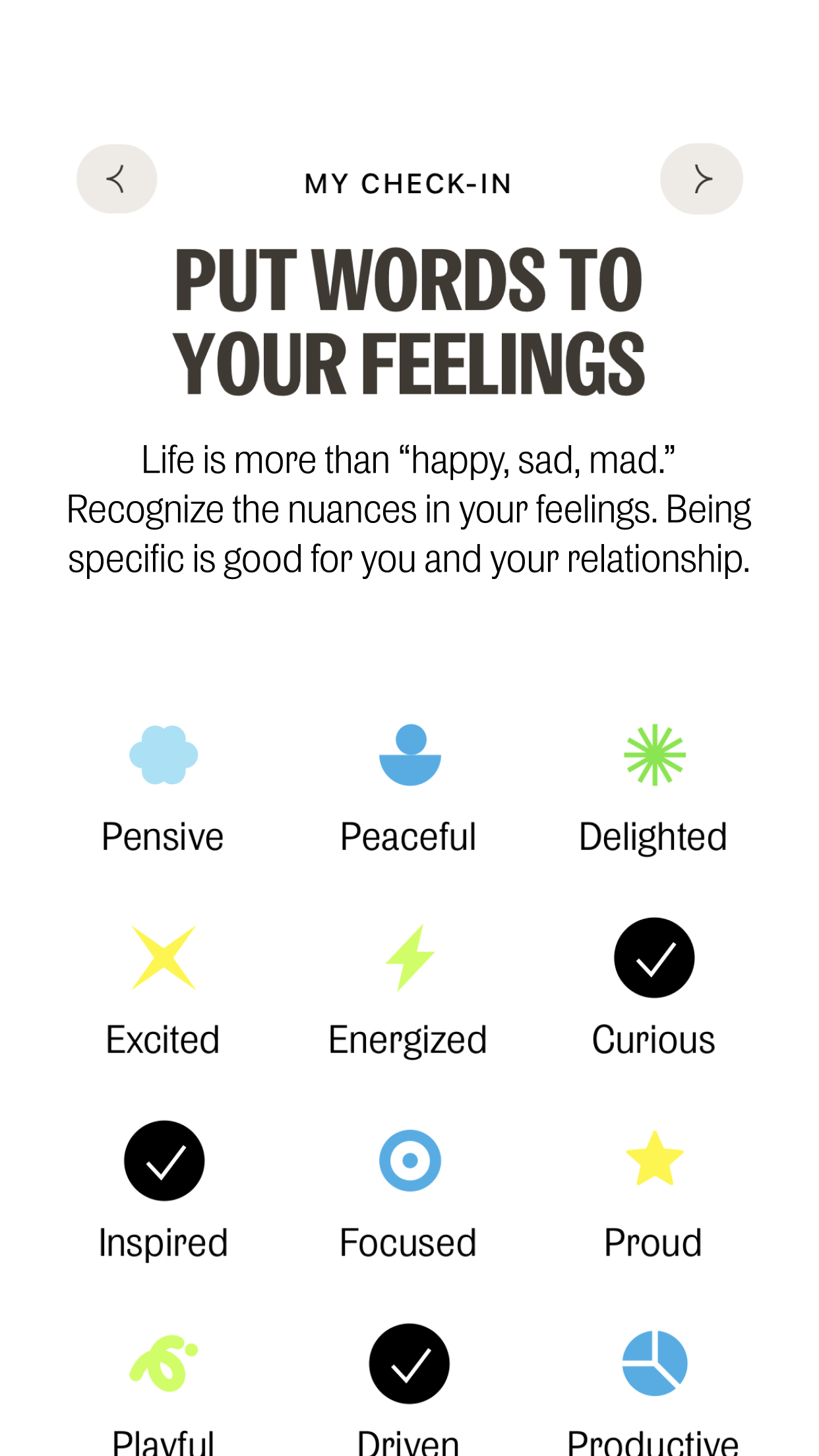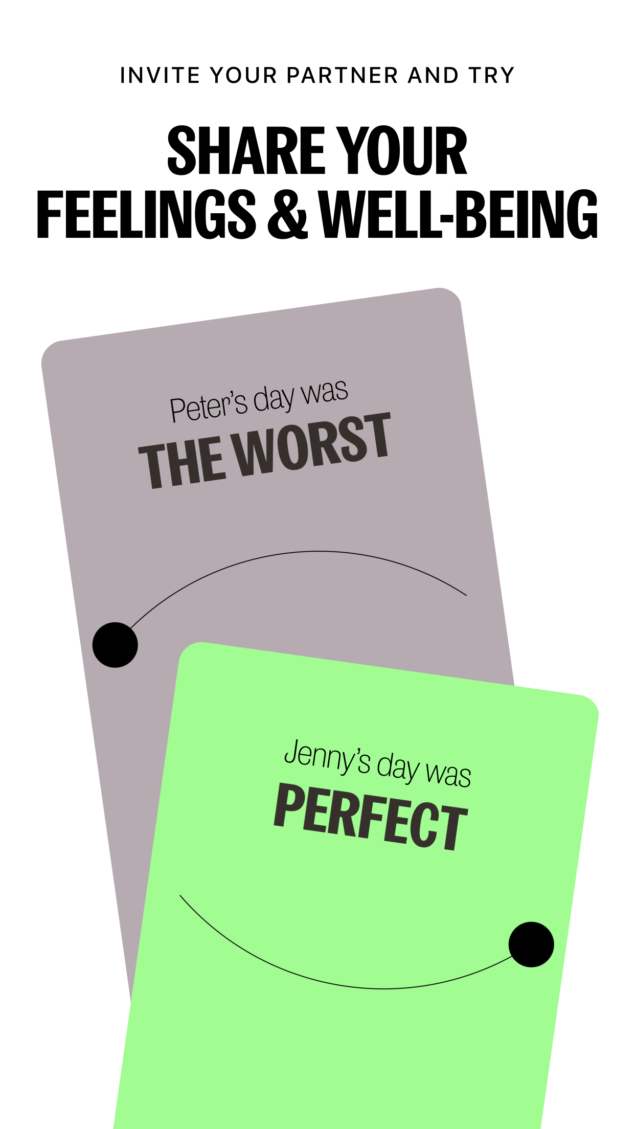 Increased insight into how you feel and what affects you, both in the present moment and over time. Our emojis make it easy for everyone to communicate how they feel and why. With a better understanding of each other, you and your partner can avoid misunderstandings and feel closer to each other.
