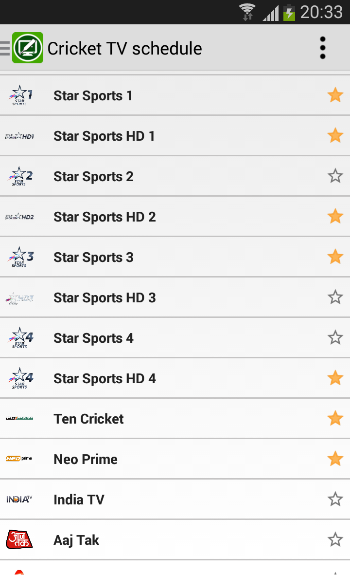 With Cricket TV schedule, get the cricket TV schedule in a nice and user friendly interface. Advantages of our cricket TV schedule : - the schedule allows users to get all the cricket match and broadcasts day after day, - get quickly all the live match thanks to the "Live" logo, - New ! ==> Follow last cricket News, - you can filter the TV schedule with your favorite teams (India, Afghanistan, Bangladesh, Pakistan, Sri Lanka, Zimbabwe, West Indies ...) - you can filter the TV schedule with your favorite channels (Star Sports 1, Star Sports HD 1, Neo Prime, India TV, Aaj Tak, Akash Bangla, Asianet Plus, Romedy Now, ...), - you can filter the TV schedule with your favorite competitions (IPL Premier League, ICC World Cup), - you can filter the TV schedule with your language (English, Hindi, Bengali, Tamil, ...). Do not miss a cricket competition or match. Follow India, Pakistan, Sri Lanka, Bangladesh and much more and do not miss their TV broadcastings. With your filters, you can see quickly your week cricket schedule.