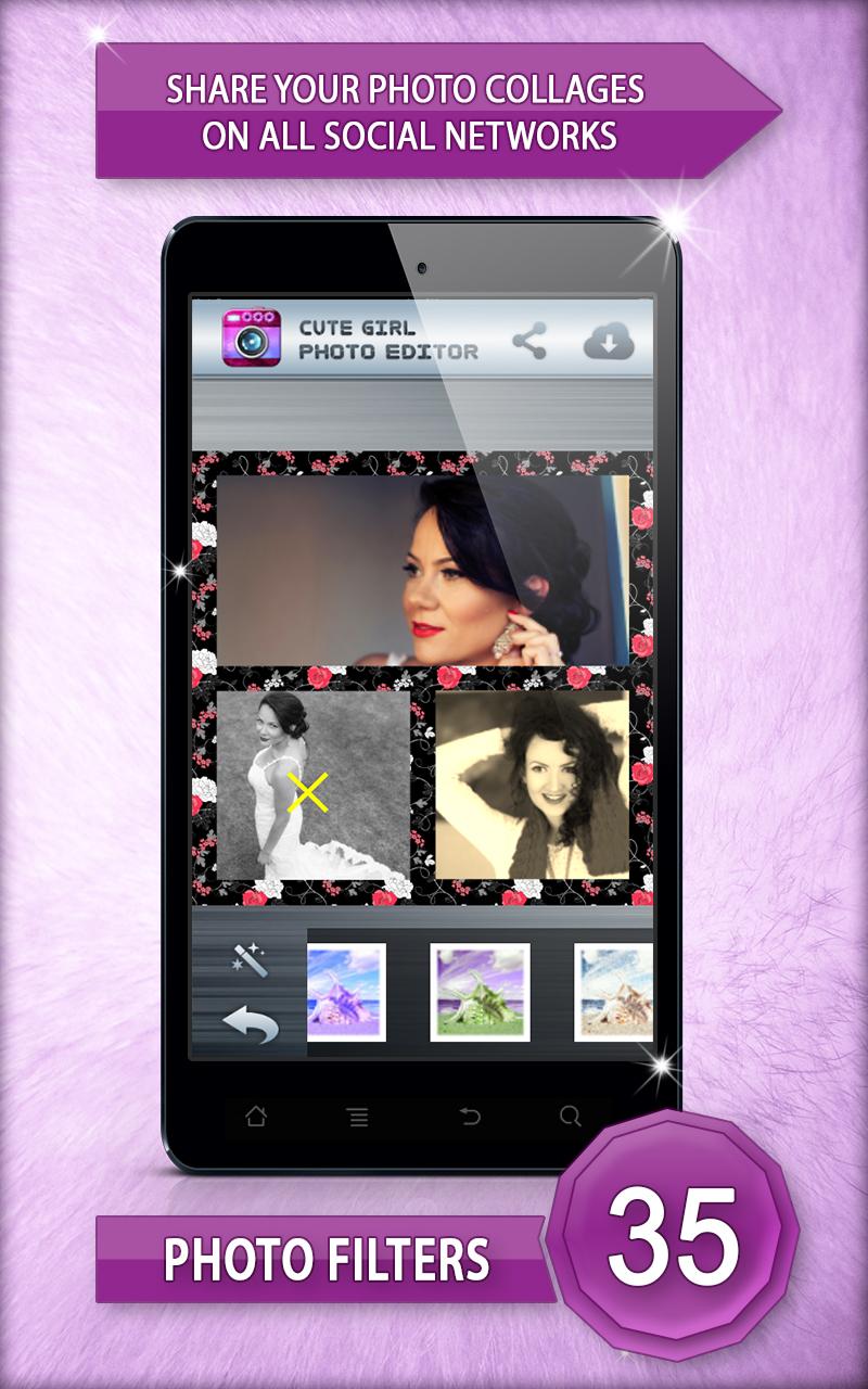 Girls, want to have some photo fun? Want to create photo collages with your photos? Here you will find funny photo effects, collage templates and photo frames. Decorate your photos with colourful flowers, little hearts and shining pink backgrounds. Have fun with this sweet girly photo editor! It has many interesting functions and it is very easy to use. Save your creation to your phone gallery or share it across major social networks! Download 👧 Cute Girl Photo Editor 👧 as soon as possible and have fun. Features: 🎀 Easy to use interface 💜 Select photo from your phone gallery 🍨 Drag and drop photos and easily move around within collages 🍸 Zoom, rotate, scale and crop images to fit the collage layout 🌺 Choose your favorite photo frame and background templates 💄 Save high resolution picture collage to your phone gallery Sweet photo collage maker is designed for all the girls who like photo editing. Download photo editor and start image editing right now. Until now you could put only one picture in photo frame, but now you can put several pictures and make awesome photo collage. Capture perfect photos of you and your girlfriends and group lots of photos into one photo and make awesome picture collage. Free sweet girl photo editor is waiting for you. This is the best photo editing software. For all fans of photography! For girls who likes taking pictures! Download 👧 Cute Girl Photo Editor 👧 and enjoy in making collages. Take photos of your little girls and create sweet photo collage. Sweet photo collage offers an easy way to design marvelous photo collages. A wide range of interesting templates, colorful backgrounds and shiny frames is waiting for you. Create sweet photos by using black and white photo effects, pop art, sepia, silver, ivory, seashell, quartz, jade, aquamarine, amber or opal photo effect. You will have a perfect girly photo collage on your phone. Pick your favorite photo frame and favorite colorful background and have fun with sweet photo editing. Perfect image editing software is a click away from you. 👧 Cute Girl Photo Editor 👧 picture editing software lets you add photos from your phone gallery or directly from your camera. Girls, take selfies and quickly combine multiple sized photos into one beautifully framed picture! Use beautiful shiny photo effects to decorate your pictures. Beautify your photos with awesome colorful hearts. Set perfect pink or purple background and create stunning collage. You can print your picture collage, frame it and put it on the wall. All your friends will be jealous when they see this fabulous picture grid. Get one of the best photo editing apps for Android™ device and start free picture editing! This free photo editor offers you square templates, polygon templates, circle templates, heart templates, star templates and more photo templates of different sizes and shapes. You can move, stretch and zoom your photos around until they fit photo collage template. Brand new collage maker, free photo editing software is waiting for you. Picture Collage app allows you to create sweet collages using your photos, stickers, text and frames. Use these funny photo effects for sweet girl photo editing. Use your photo collages as backgrounds. 👧 Cute Girl Photo Editor 👧 allows you to share collages with your friends.