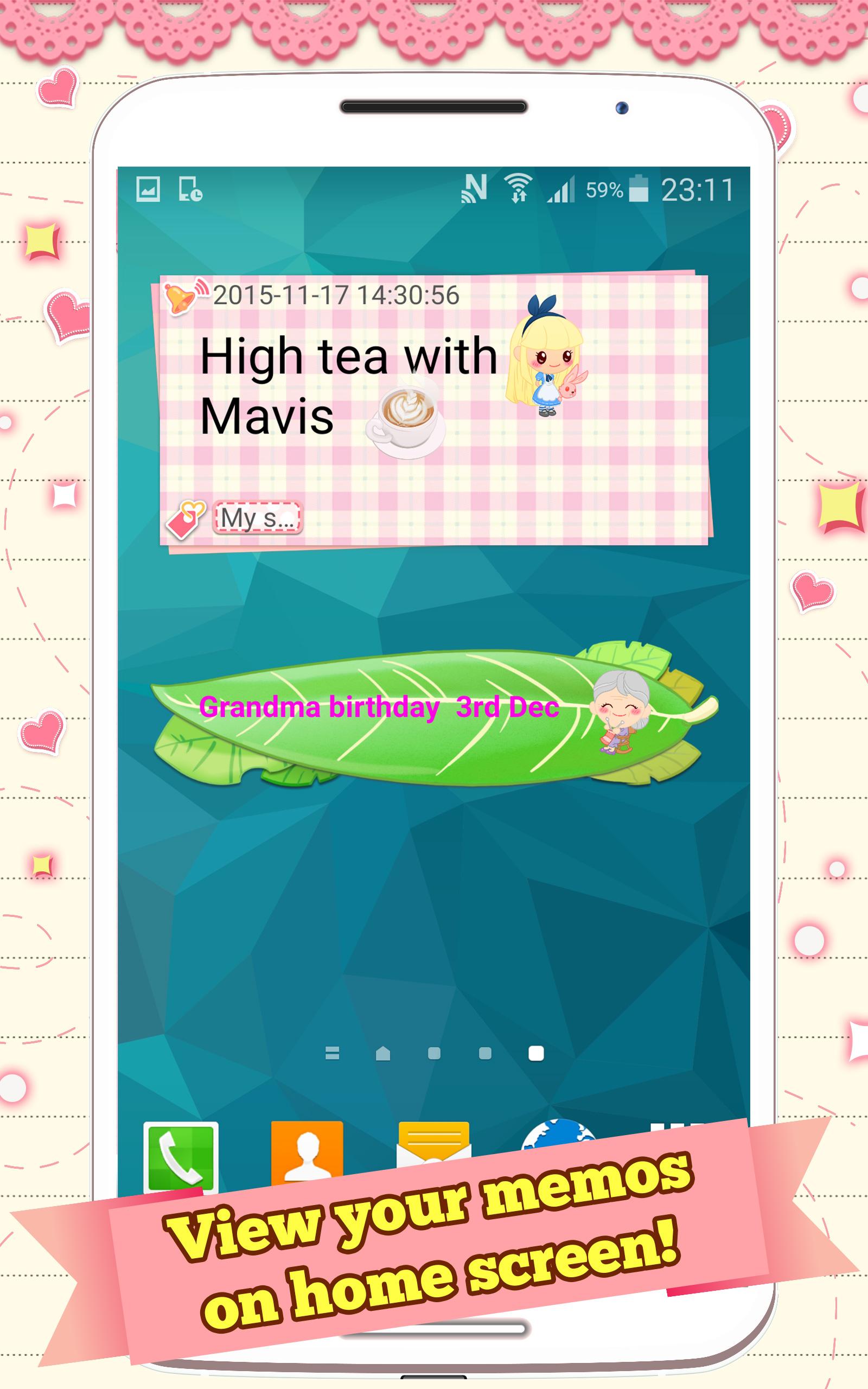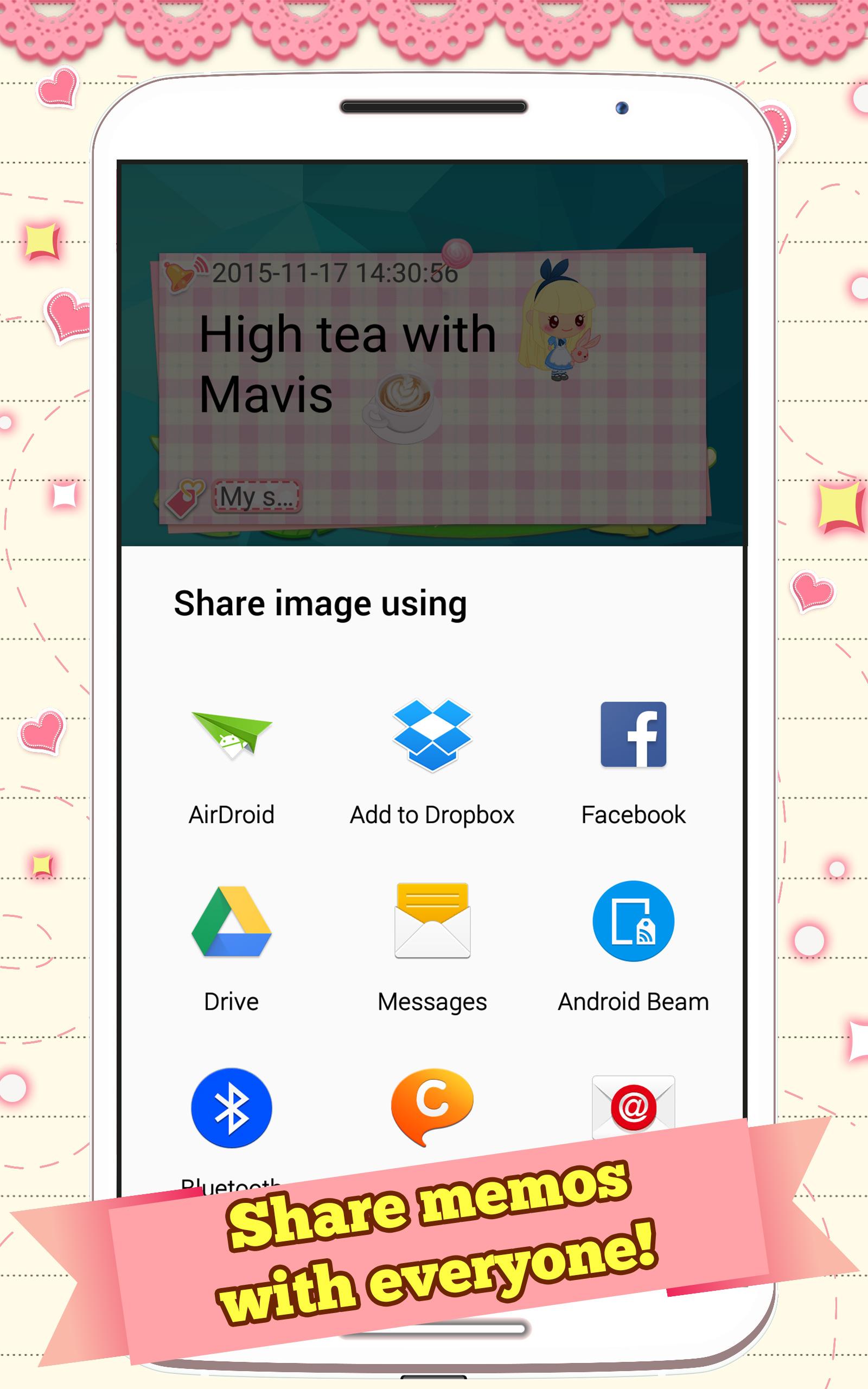 Keeping track of your notes and memos have never been this cute and convenient! This simple app lets you organize your notes and place them anywhere on your home screen, where you can easily view and access them. Use this app to create to-do lists, shopping lists, and reminders, or jot down notes with ease! Personalize your notes by changing background themes, add some adorable stickers, or even use your own photos as your memo's background! Use the app to alert you of deadlines or important dates by setting an alarm to a memo. What's more, this memo widget app is unique that you can sync it with Google Task and Evernote. Now, you will no longer have to forget or miss anything important! Key Features: ⭐ With but a few taps, you can easily create cute memos on your home screen! ⭐ Features synchronization with Google Task, which means it's also visible on Google Calendar and any service integrated with Google Task ⭐ Sync with your Evernote account! Evernote tags can be added to your memos! ⭐ Turn any photo from your device into a memo background, or take a photo instantly and apply it as your background with just a few taps. ⭐ Get alerted of deadlines or important dates by setting an alarm to a note. The app will ring you when the time is due! ⭐ Share your memos with anyone, any time like a label or a sticker! Greet your loved ones with a birthday note! ⭐ Features dropbox backup and restore. ⭐ Very cute! you may use this app as: stickies,sticky notes,notes,memo pad,widget,desktop memo,floating notes, photo memo or home screen memo