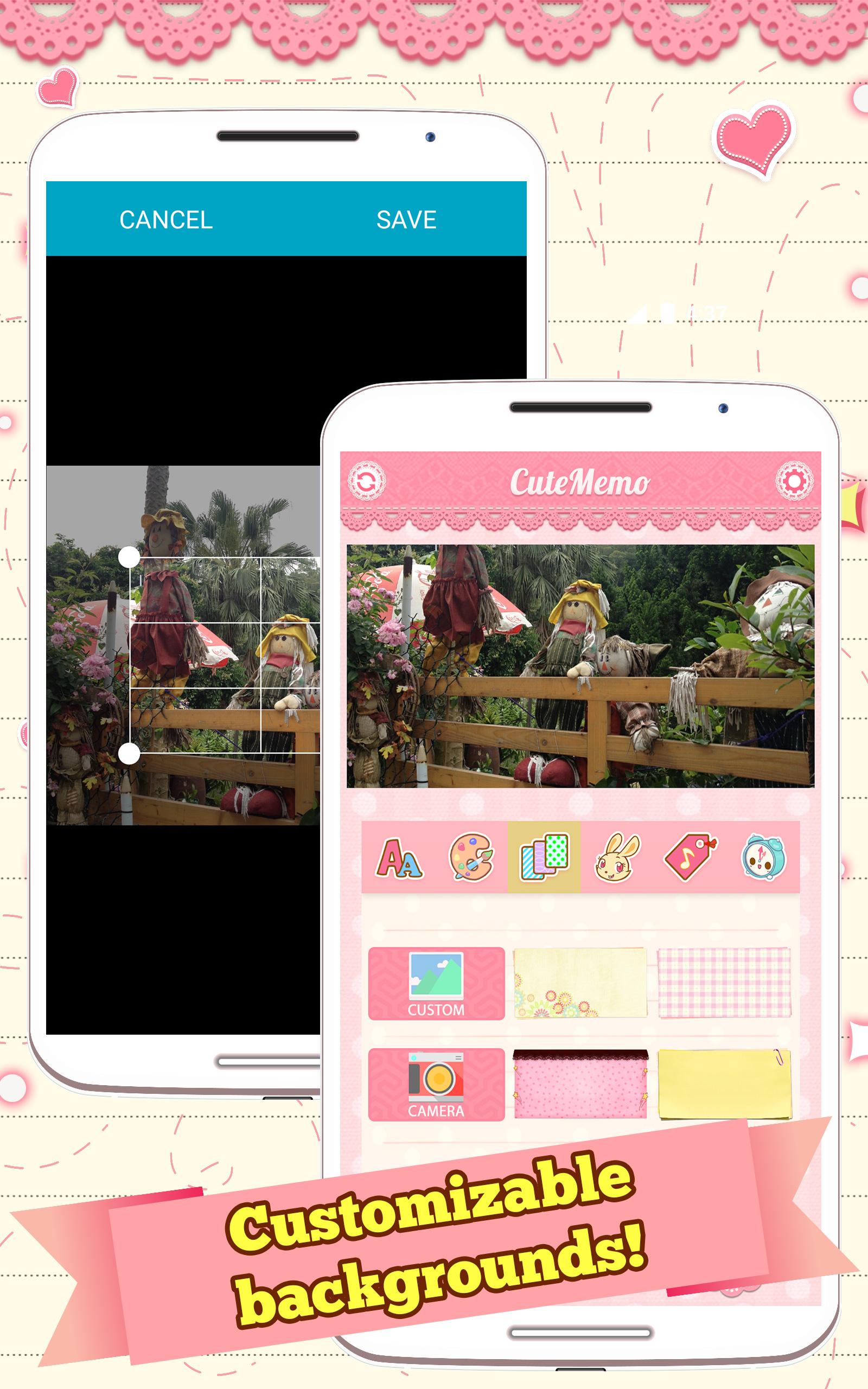 Thanks for your valuable feedback! 🌷We have been improving Cute Memo for you. In this update we have: 🍄 🌻 🍄 🍄 🎍 🍄 🌸 ✨ Fixed custom background failing to apply on some device models 🌟 Enhanced image cropping experience. It is now possible to rotate an image while cropping it for custom background