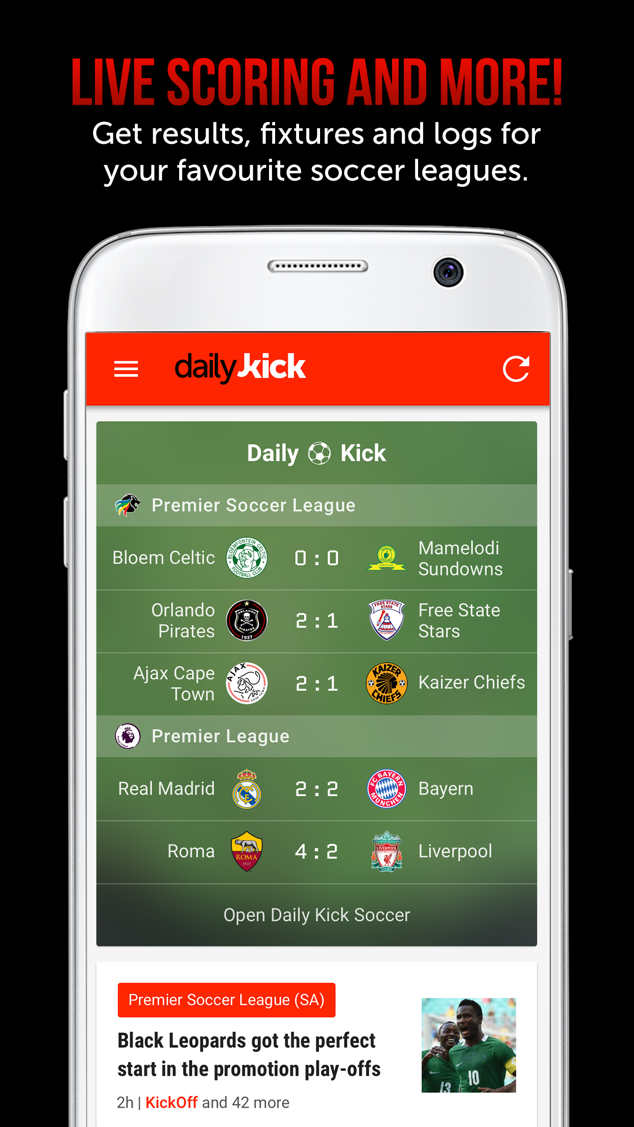 New and improved live scoring, results, fixtures and logs. Now you can follow your favourite teams and leagues so you never miss out on the action! Get all of this in the Daily Kick update!