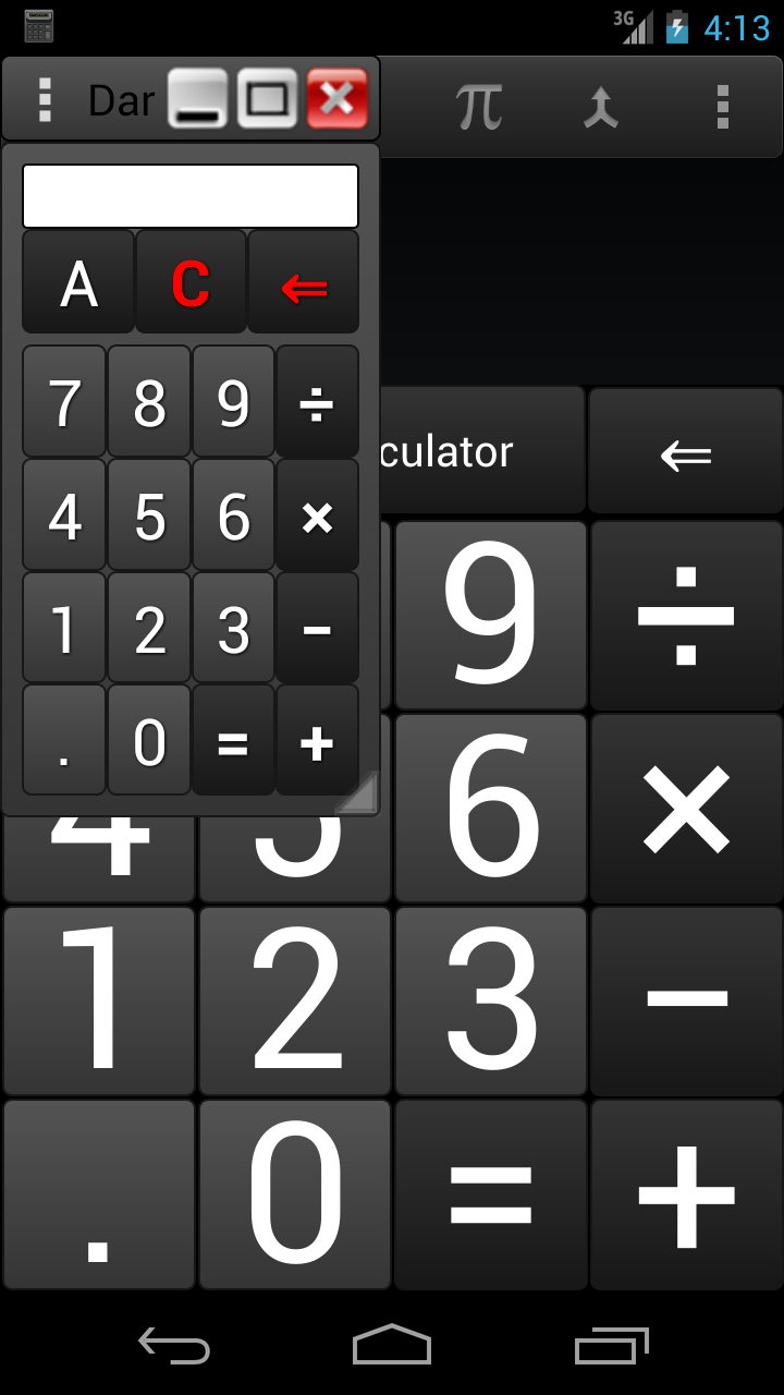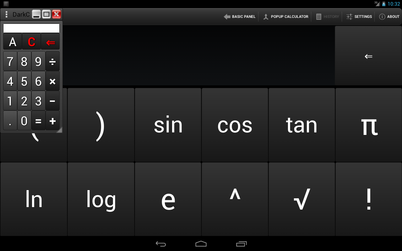 WHY HAVING 2 SEPARATE CALCULATORS INSTALLED WHEN YOU CAN HAVE ONLY 1? With this amazing DarkCalc you have 2 fully customizable calculators in 1 small package. One simple Calculator with basic and scientific functions and one floating-popup-onscreen calculator for calculating while you are viewing other programs. Move it anywhere from everywhere, not only from the top. Resize it from corner or with pinch to zoom gesture. Maximize it, minimize, hide, close and many more! Open as many popup DarkCalc as you like! Enjoy true desktop multitasking experience with DarkCalc and never switch between calculator and other programs again. Also you have the ability to customize your DarkCalc as you like! ★★ALL FOR FREE AND WITHOUT ADS!★★ Features : ✓1.Normal-fixed and floating support ✓2.Minimize/Maximize/Close support for popup DarkCalc ✓3.Move (from everywhere to anywhere, even outside from screen) support for popup DarkCalc ✓4.Resize (not only from cornet but with pinch to zoom gesture also) support for popup DarkCalc ✓5.Hide and Restore support for popup DarkCalc ✓6.Cut, Copy, Paste support for both calculators ✓7.Multiple for popup DarkCalc calculators support ✓8.Change background color for popup ✓9.Change background transparency for popup ✓10.Enable/Disable button vibration for both calculators ✓11.Change button vibration duration for both calculators ✓12.Basic and Scientific panels in both calculators ✓13.Optional History view and delete support for normal calculator. ✓14.Supporting switch between radians and degrees for cos, sin, tan for both calculators. ✓15.Ability to create shortcut for popup DarkCalc for easy access from everywhere Available in English and Greek Language for the moment. SPECIAL THANKS TO MARK WEI(pingpongboss) FOR THE AMAZING StandOut LIBRARY!!!! ★★FEATURED★★ ✓XDA DEVELOPERS http://www.xda-developers.com/android/darkcalc-the-floating-scientific-calculator/ ✓SAMSUNG APPS TOP 1 FREE APPLICATION IN FIRST RELEASED DAY ★KNOWN ISSUES★ -Popup`s Darkcalc buttons have no text in JellyBean-4.1+ (FIXED IN VERSION 1.3). ★PERMISSIONS ★ -For Pollfish surveys (for supporting development) android.permission.ACCESS_WIFI_STATE android.permission.INTERNET -History file android.permission.WRITE_EXTERNAL_STORAGE android.permission.READ_EXTERNAL_STORAGE -Popup DarkCalc android.permission.SYSTEM_ALERT_WINDOW -Button vibration android.permission.VIBRATE