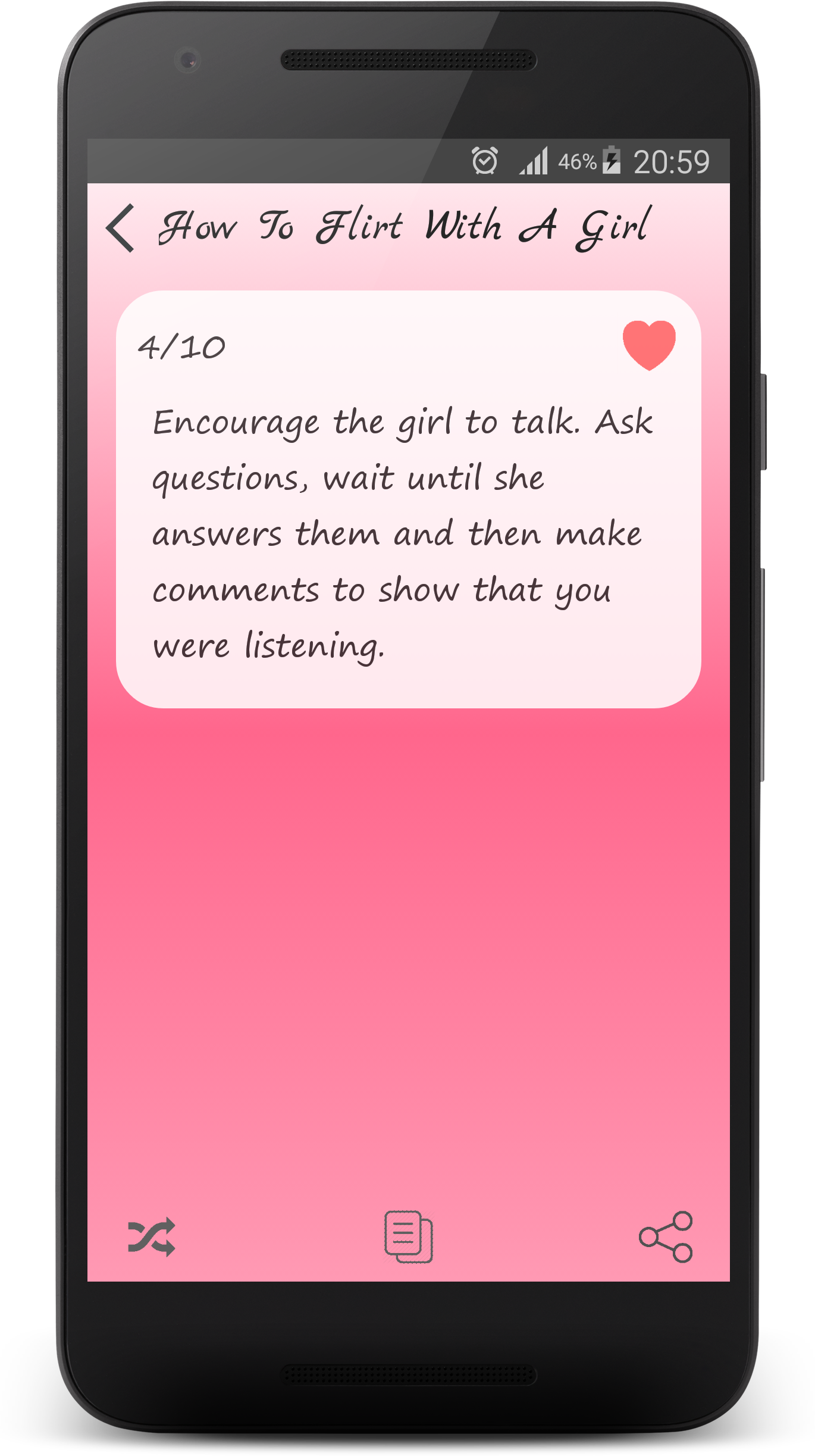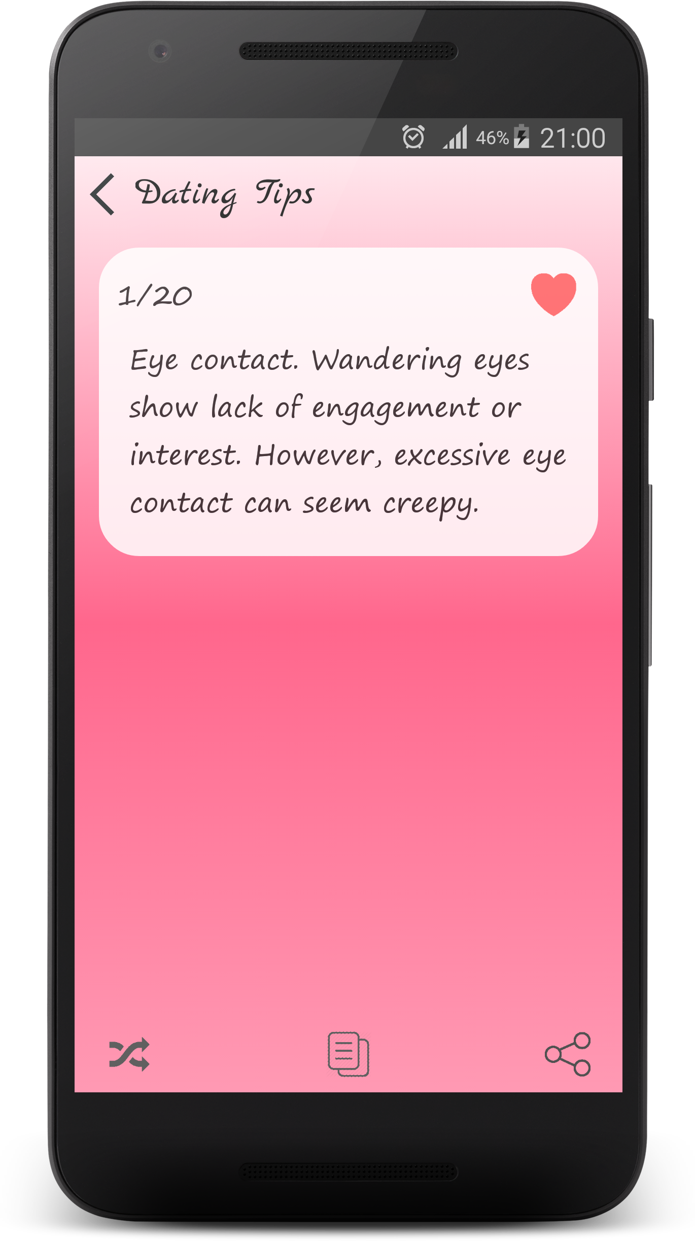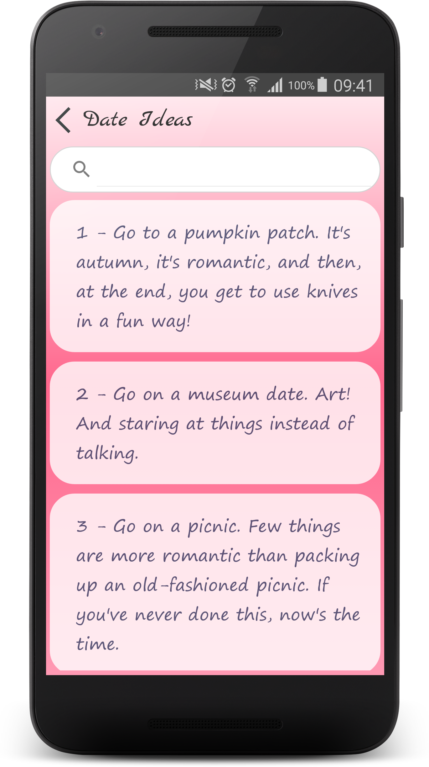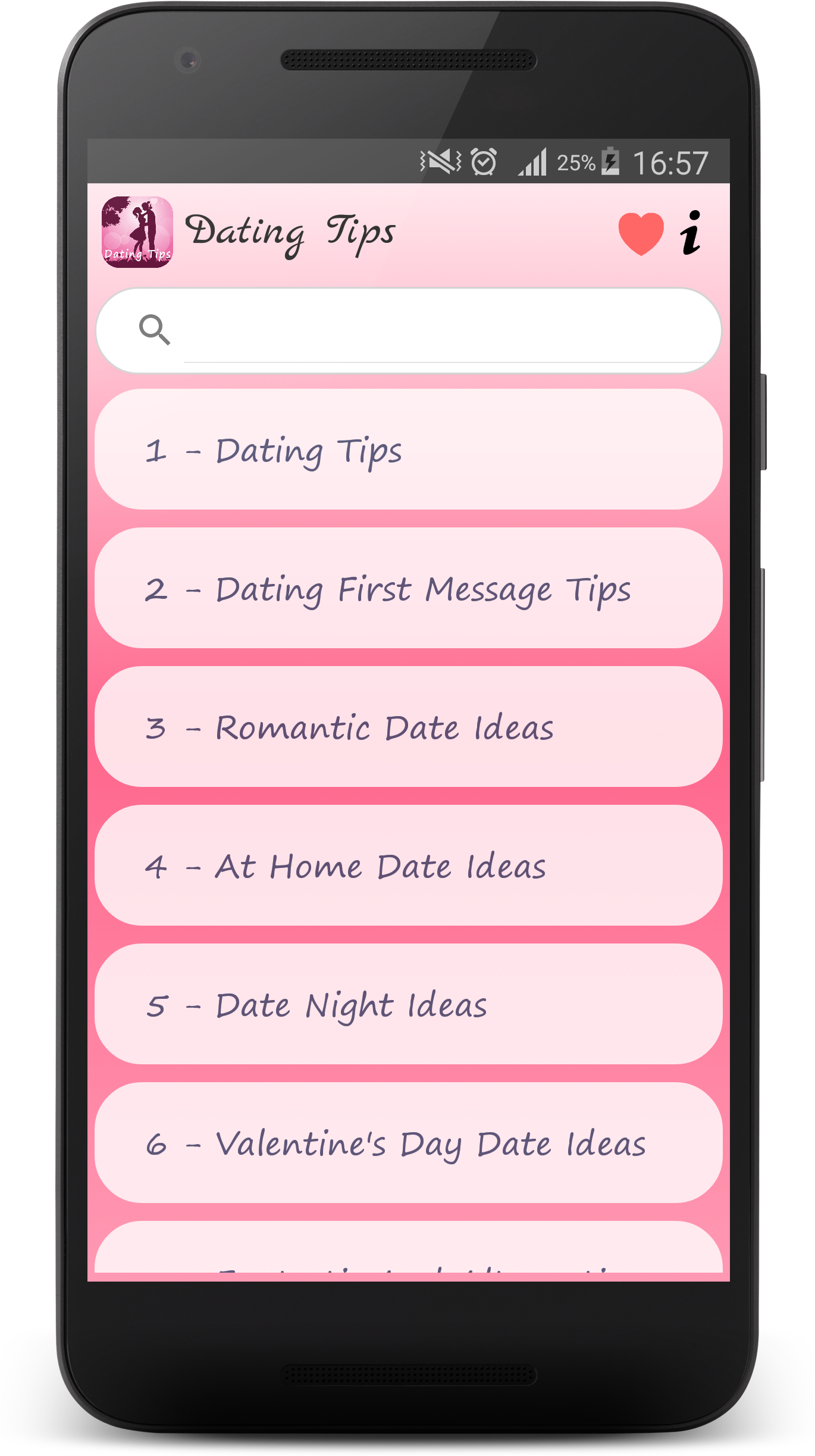 - Did you meet that special someone? - Are you looking for the best dating tips to help you get a second date? This app is filled with first date tips, a date guide to help you speed things along to be sure you follow all the basic rules of dating. One small mistake and you may never see a second date! This is the best collection of Date ideas & dating tips for men and women that will help guide you on your way to that special someone’s heart. It's easy to meet someone online, but getting coffee or going to see a movie can get you nervous and lead to a lack of conversation that could end your chances. ☆☆☆ Categories in this The Best Collection of Date Ideas and Dating Tips Application ☆☆☆ ♥ Dating Tips ♥ Dating First Message Tips ♥ Romantic Date Ideas ♥ At Home Date Ideas ♥ Date Night Ideas ♥ Valentine's Day Date Ideas ♥ Fantastic And Alternative Date Ideas ♥ Cheap Date Ideas ♥ Summer Date Ideas ♥ Fall Date Ideas ♥ Winter Date Ideas ♥ Spring Date Ideas ♥ Pick Up Lines ♥ How To Flirt With A Girl ♥ Flirty Tips ♥ Flirty Messages ♥ Romantic Love Messages ♥ I Miss You Messages ♥ The Best Compliments For singles, girls and boys, men and women... Download this free dating tips app to help increase your chances of success! If you like "The best collection of Date Ideas and Dating Tips" app, please rate it. Thank you! Disclaimer: In case if any of these messages, tips, Date Ideas violated your copyright/ IP right to remove the discrepancy. please send us an e-mail. We will respond this at earliest. - Life Hack Studio - TAG: Date Ideas, pick up lines, flirty messages, first date tips, dating tips for men, dating tips for women, love messages, compliments for girl, compliments for boy, Unique Date Night Ideas, Creative Second Date Ideas, Romantic, Unforgettable Date Ideas for Any Occasion, Teen Date Ideas, Bad First Date Ideas, Date Ideas for Married Couples