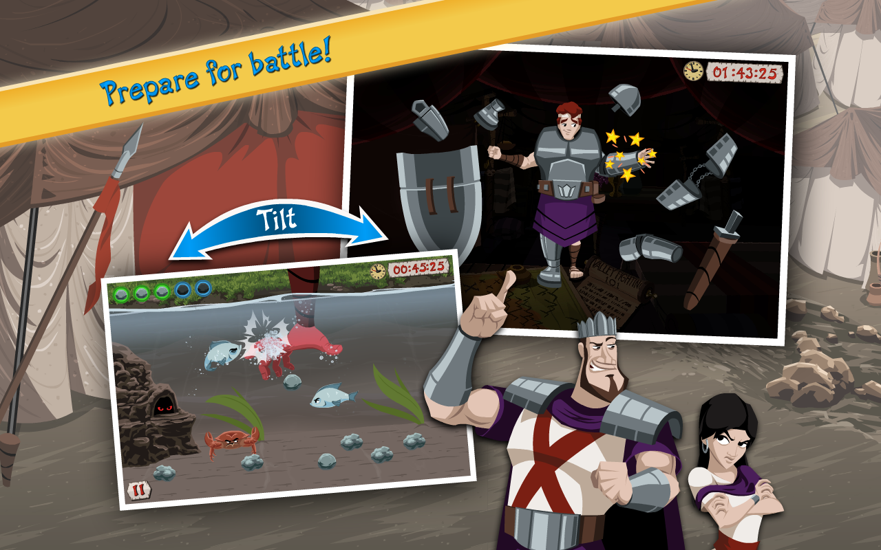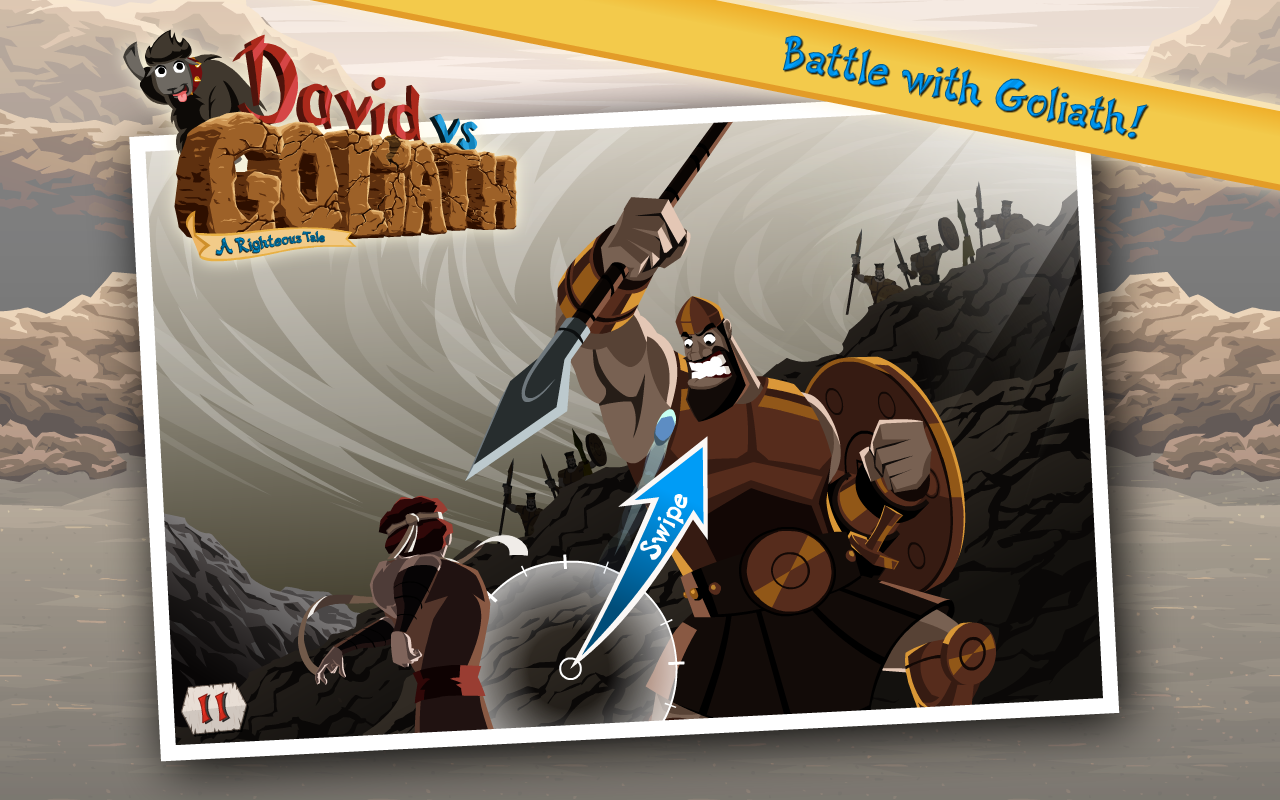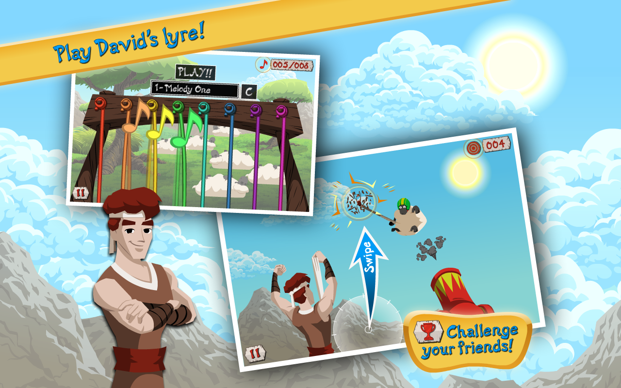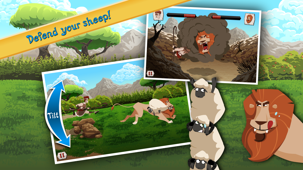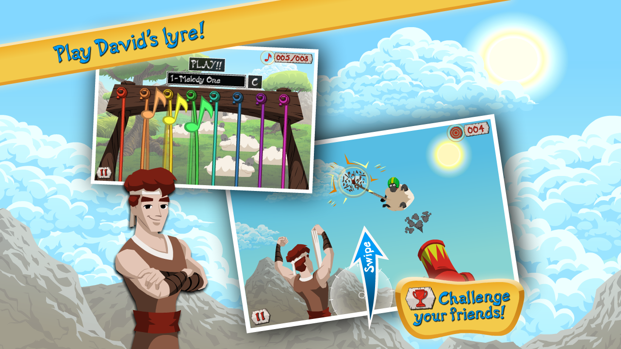 A MODERN RETELLING OF THE BIBLE STORY FOR TODAY'S KIDS! The epic bible story of David vs. Goliath! Help David go from shepherd to hero with tons of slinging, lion fighting and lyre practice along the way! Can you get him ready to face Goliath? You've read the story! Now tap, tilt and swipe through it with David in this interactive story combined with mini-games! Dozens of immersive story chapters including over 100 achievements and 7 mini-games along the way. Spend hours unlocking and mastering all the challenges! Walk with David as he demonstrates how to combine courage and preparation with God's destiny for our lives to overcome all odds - even when no one believes in us! Well, no one except your sheep! A new app combining great fun and Bible values in a modern way that both parents and kids will love! MINI-GAMES • Practice Needed! → Help David learn to use his sling! • Lion Chase! → Chase down that sheep-stealing Lion! • Lion Fight! → Fight the Lion to rescue your sheep! • Let's Get Lyre-ical! → Learn to play songs on David's Lyre! • Dressing For Battle! → Help David dress in the King's armor! • Five Smooth Stones! → Help David find stones for his sling! • Giant Fight! → Can you defeat Goliath in battle? • Sling Practice Pro! → Test your slinging accuracy! Compete with your friends using Game Center! Each game includes an EASY and a HARD mode for just the right level of challenge for all ages! FEATURES • Beautiful animation • Superb voice acting • Original music • Game Center CHARACTERS • David! • Spike the sheep (who thinks he's a dog)! • David's zany dad and jealous brothers! • Samuel the prophet (and his wife who shouldn't cook)! • Goliath and his over-empowered shield bearer! • King Saul and his spunky daughter, Merab! • Scared Israelites! • Mean Philistines! • Sneaky lion! • Talented sheep! • Dancing mice! Connect with Righteous Tales here: Website: http://righteoustales.com Facebook: http://facebook.com/righteoustales Twitter: http://twitter.com/righteoustales