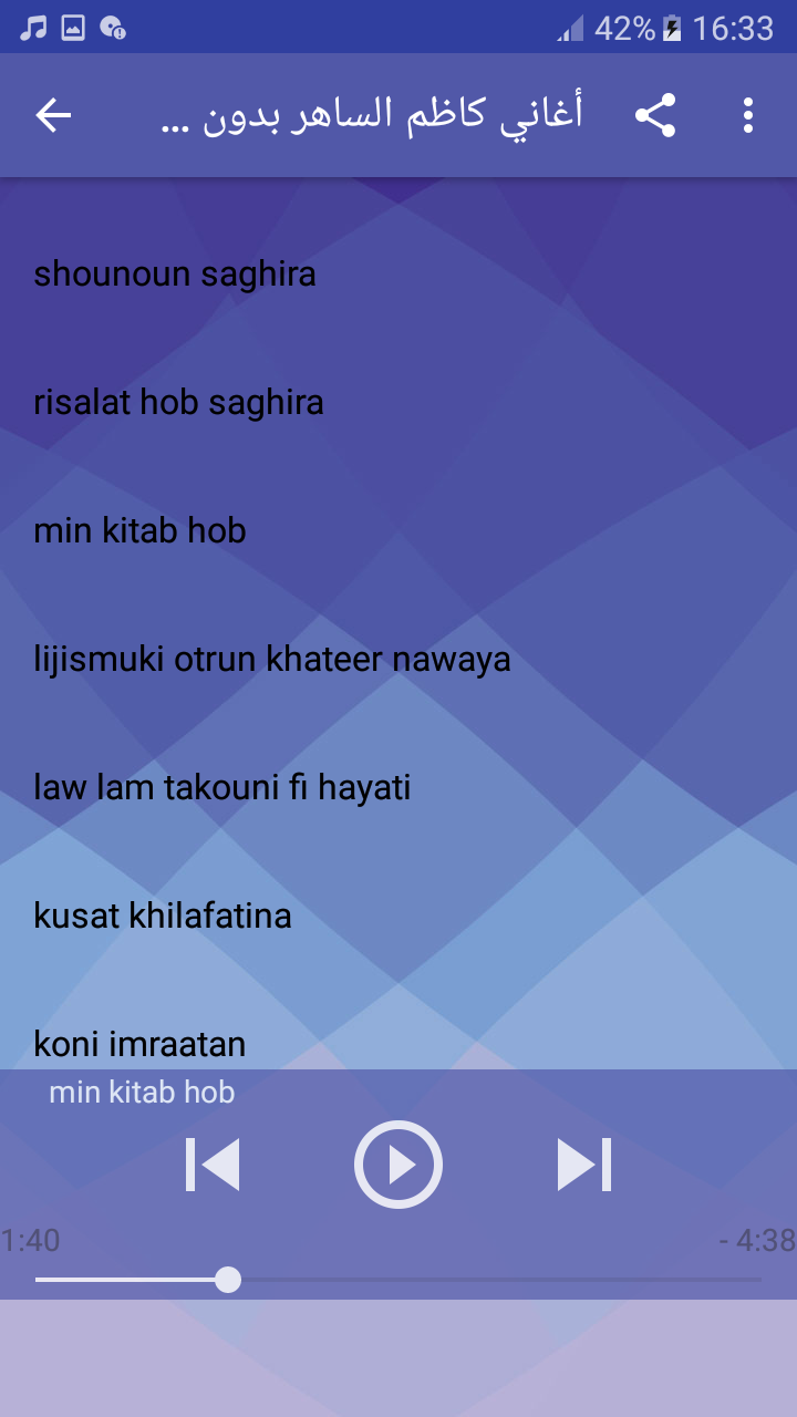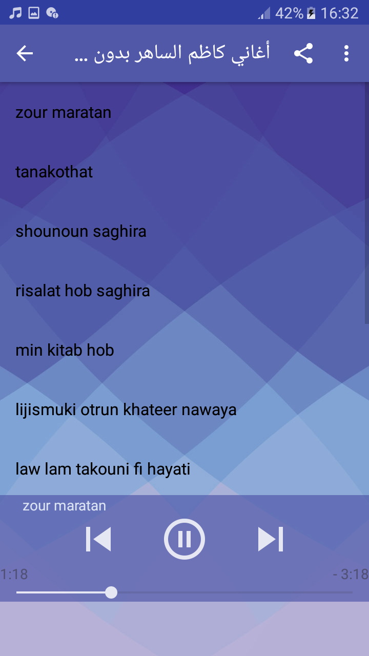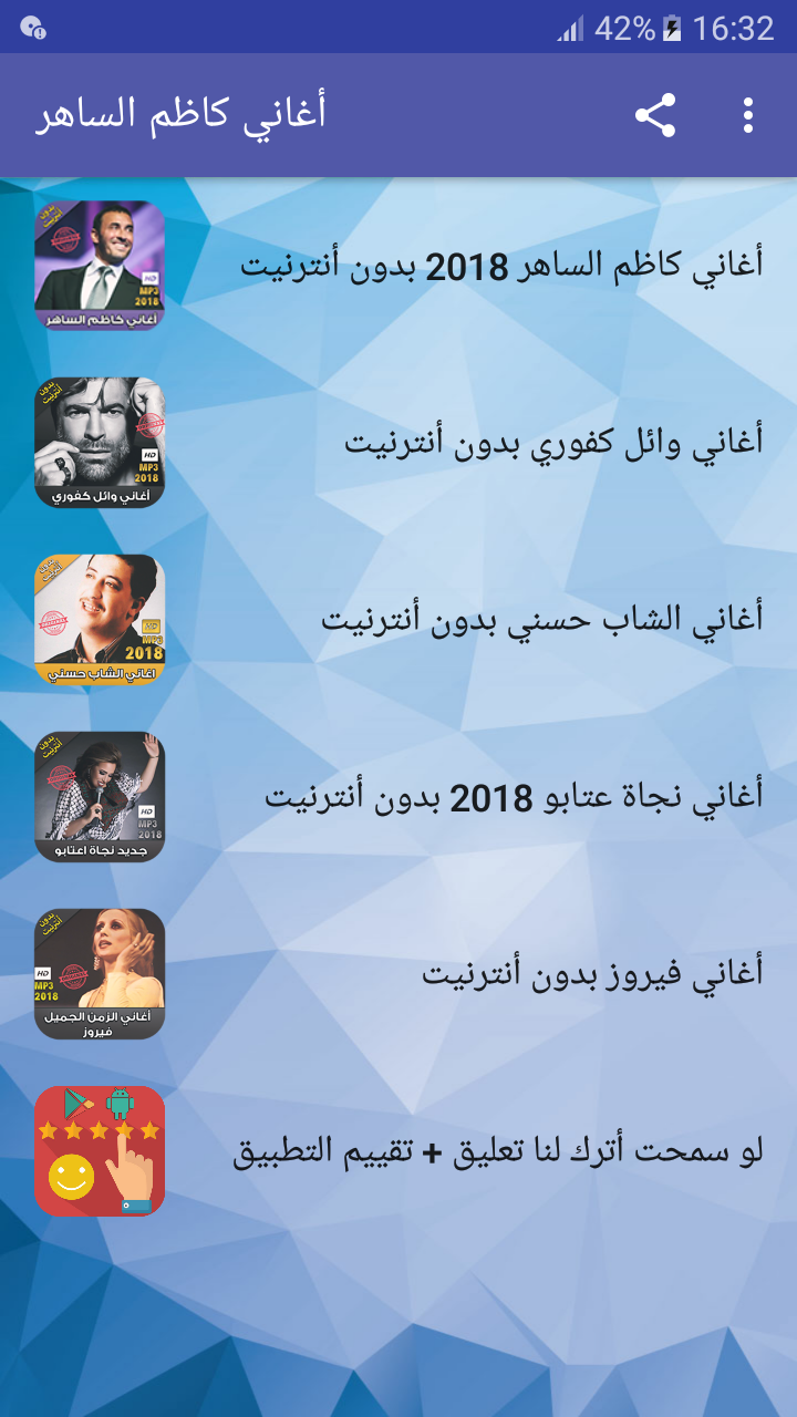 تطبيق يمكنكم من الإستماع على مجموعة من أجمل الأغاني و روائع كاظم الساهر 2018 الحصرية على الساحة الفنية لسنة 2018 ؛ حيت يحتوي البرنامج على منوعات غنائية عراقية و أخرى عربية . كاظم الساهر بدون انترنت 2018 - Kadem Saher كاظم الساهر بدون انترنت 2018 - Kadem Saher كاظم الساهر بدون انترنت الاغاني تالتي توجد في هذا البرنامج: =================== ضمني لصدرك domini-ala-saderk.mp3 عيد العشاق eid-al-ashaq.mp3 عبرت الشط 3abrt-chat.mp3 100 البارحة بالحلم el-bariha-bi-7olm.mp3 ها حبيبي ha-habibi.mp3 100 علمني حبك 3alamani-hoboki.mp3 أشهد ألا امرأة achahdo-ala-imraa.mp3 حافية القدمين hafiata-9adamayn.mp3 حب مستحيل hob-mosta7il.mp3 kolak-3ala-ba3dak-7ilw.mp3 دلع النساء dalaa-al-nisaa.mp3 كوني امرأة خطرة koni-imraatan.mp3 الليلة احساسي غريب laila-ihsasi-gharib.mp3 ماحبك بعد روح ma-ahibak-ba3da-roh.mp3 مالي خلق mali-khili9.mp3 100 قولي احبك qoulee-ouhibbouka.mp3 ونسيت دائي wa-nasito-dai.mp3 يا مستبدة ya-mostabida.mp3 زيديني عشقا zidini-3ich9an.mp3 حبك سيدتي hobak-saydanti.mp3 اشكيك لمين achkik-li-min.mp3 ابعد عني يابن الناس ib3id-3ani-ya-ibn-nas.mp3 احبيني بلا عقد ahebini-bila-3o9ad.mp3 إني خيرتك فاختاري in-khayartok-fa-khtari.mp3 اكرهها akrahoha.mp3 المحكمة al-ma7kama.mp3 كتاب الحب kitab-al-hobb.mp3 انا وليلى ana-wa-leila.mp3 كلك على بعضك حلو كاظم الساهر* جميع اغاني كاظم الساهر* اغاني كاظم االساهر* أغاني كاظم الساهر* أغاني* رنات كاظم الساهر* تحميل اغاني كاظم الساهر* اغنية كاظم الساهر* كاظم الساهر اغاني* كلمات كاظم الساهر* mp3 كاظم الساهر* كاظم الساهر 2017* غرناطة كاظم الساهر* أغاني عربية كلاسيكية* أغاني عراقية* - كاظم الساهر 2018 - كاظم الساهر بدون انترنت - جميع اغاني كاظم الساهر - اغاني كاظم الساهر - كاظم الساهر music - كاظم الساهر mp3 - مالي خلق - كاظم الساهر 2016 - غرناطة كاظم الساهر - اغنية مالي خلق - مالي خلق - كاظم الساهر والاطفال - aghani kadem saher - kadem saher mp3 - kadem saher sans internet - رنات كاظم الساهر - تحميل اغاني كاظم الساهر - اغنية كاظم الساهر - كاظم الساهر اغاني - اغاني كاظم - كلمات كاظم الساهر اغاني عراقية* aghani kadem saher* Kadem saher* kadem saher mp3* aghani* musique* Kathem Al Saher* mp3* ألبومات : لا تزيديه لوعة - 2011 الرسم بالكلمات - 2009 صور - 2008 يوميات رجل مهزوم - 2007 انتهى المشوار - 2005 إلى تلميذة - 2004 صعب عليا - 1996 بعد الحب - 1995 سلامتك من الآه - 1994 بانت الاعيبك - 1993 افرح - 1992 العزيز - 1991 لا يا صديقي - 1990 غزال - 1989 شجرة الزيتون - 1984 ملينا البعد - 2004 حافية القدمين - 2003 قصة حبيبين - 2002 أبحث عنك - 2001 الحب المستحيل - 2000 حبيبتي والمطر - 1999 أنا وليلى - 1998 مدرسة الحب - 1997 إغسلي بالبرد - 1996