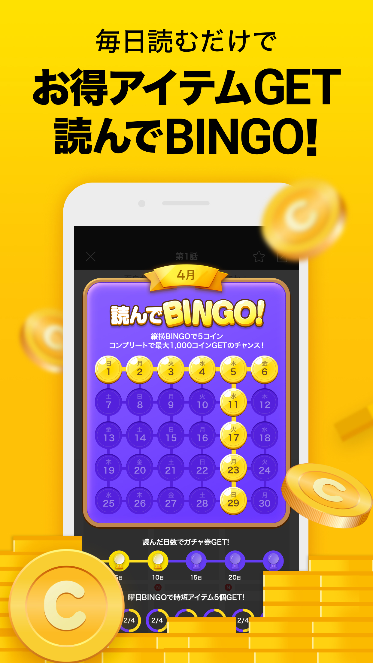 Wir veranstalten regelmäßig Events, bei denen Sie kostenlos Münzen gewinnen können, wie zum Beispiel „Lesen und Bingo!“, Quizze und Anwesenheitsveranstaltungen. Verdienen Sie bei diesen Events Münzen und nutzen Sie diese, um kostenpflichtige Titel zu lesen.