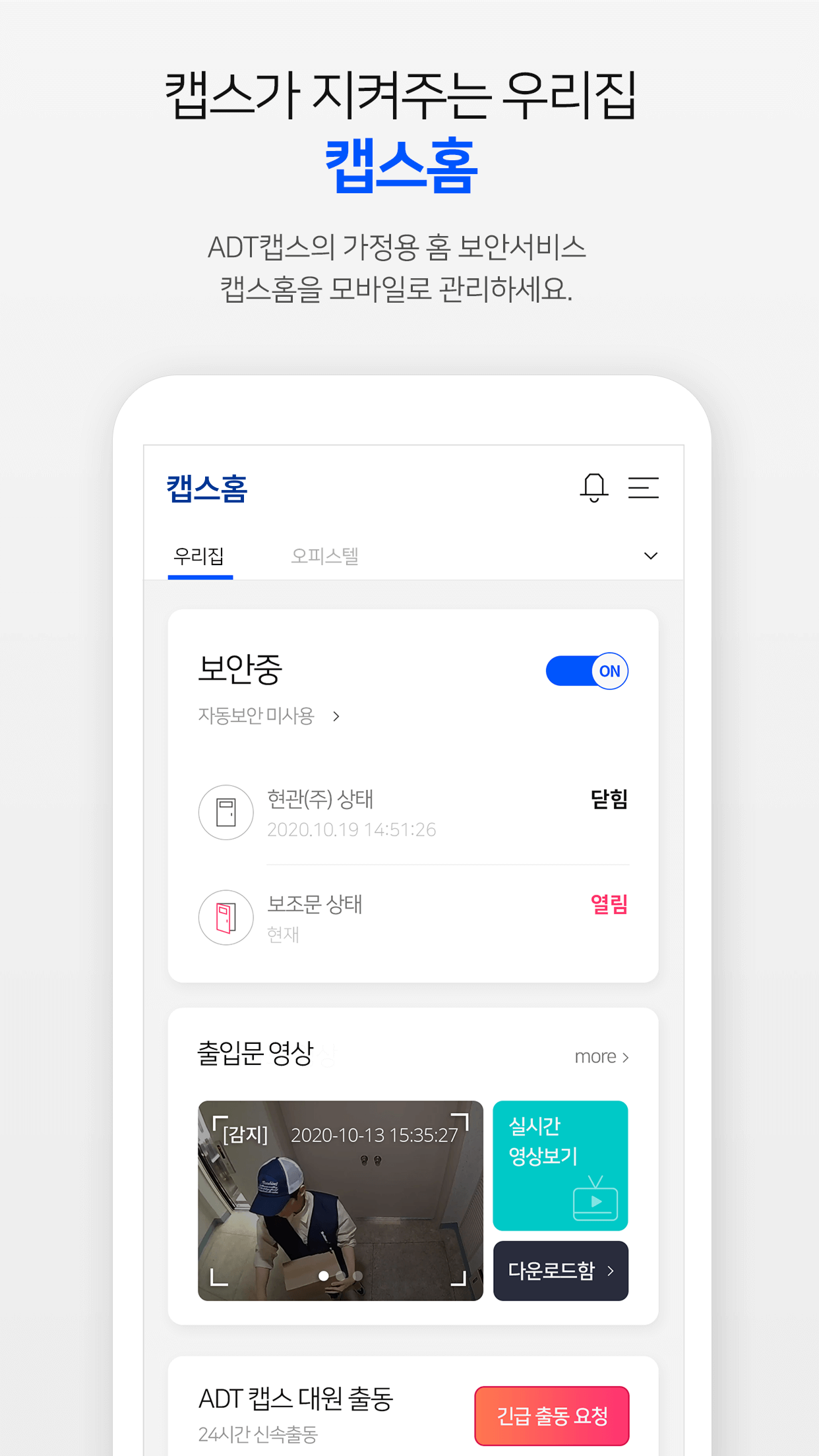 Der intelligente Türwächter unseres Hauses, der Türwächter von Caps Home! Umfassende Betreuung vom Fenster bis zur Haustür, Caps Home Light! [Caps Home Türschutz] ■ Hauptfunktion - Sofortige Erfassung der Bewegung vor der Haustür Es erkennt in Echtzeit die Bewegung vor der Haustür, beispielsweise einen Fremden, der vor die Tür geht, einen Lebensmittellieferanten und einen Kurierfahrer, und benachrichtigt Sie über die APP. Sehen Sie sich das hochauflösende Full-HD-Video ohne tote Winkel an und nehmen Sie es auch nachts klar auf. 24 Stunden Seelenfrieden - Einfache und sichere Installation Ein professioneller Installateur besucht Ihr Zuhause, überprüft den Sicherheitsstatus und stellt Sicherheitslösungen bereit. Einfache und schnelle Installation und hinterlässt keine Spuren am Eingang oder an den Wänden, sodass Sie es auch in Ihrem gemieteten Haus bedenkenlos verwenden können! - Notruf im Notfall Im Notfall oder wenn Sie sich beim Überprüfen des Echtzeitvideos unwohl fühlen, klicken Sie auf die Schaltfläche „Versand anfordern“. Die nächstgelegenen ADT Caps-Disponenten unterstützen den Notfallversand. - Zwei-Wege-Gesprächsfunktion Kommunizieren Sie mit Besuchern Ihres Zuhauses jederzeit und überall, bei der Arbeit oder auf Reisen! Wenn Ihnen das Gespräch unangenehm ist, können Sie die Leitstimme (männliche Stimme) auswählen und übertragen. - Verwaltung des Vordereingangs/-ausgangs Überprüfen Sie nicht nur die Bewegungen vor der Haustür in Echtzeit, sondern auch die Ein- und Ausgangsaufzeichnungen Ihres Hauses. Sie können den Ausflugsstatus Ihrer Familie über die APP überprüfen. - Umfassende Betreuung von der Kriminalprävention bis zur Nachentschädigung Es werden bis zu 10 Millionen Won im Falle eines Diebstahls, bis zu 5 Millionen Won im Falle eines Schadens und bis zu 100 Millionen Won im Falle eines Brandschadens (mein Haus 5.000, das des Nachbarn 5.000) entschädigt. Auch wenn Sie die Feuerversicherung nicht gesondert abschließen, reicht Caps Home aus. [Caps Home Light] ■ Hauptfunktion - Einbrucherkennung und Versandanforderung Ein Einbruch durch die Haustür oder das Fenster wird erkannt und über die APP gemeldet. Während sie mein Haus bewachen und im Falle eines Einbruchs die Situation im ADT Caps-Lageraum überprüfen, unterstützen die Disponenten die Notfallabwicklung. - Verwaltung des Eingangs und der Fensteröffnung/-schließung Sie können die Eingangs-/Ausgangsdaten der Vordertür und den Offen-/Geschlossen-Status der Fenster über die APP überprüfen. - Schnelle Erstreaktion mit Branderkennung in Echtzeit Ein Brandmelder, der zuerst Rauch erkennt, ermöglicht eine schnelle Erstreaktion im Brandfall. Sobald ein Brand erkannt wird, stellt der Lageraum von ADT Caps eine Verbindung zur 119 her, um die Reaktion vor Ort zu unterstützen. - Umfassende Betreuung von der Kriminalprävention bis zur Nachentschädigung Es werden bis zu 10 Millionen Won im Falle eines Diebstahls, bis zu 5 Millionen Won im Falle eines Schadens und bis zu 100 Millionen Won im Falle eines Brandschadens (mein Haus 5.000, das des Nachbarn 5.000) entschädigt. Auch wenn Sie die Feuerversicherung nicht gesondert abschließen, reicht Caps Home aus. ■ Informationen zu den von der App verwendeten Zugriffsrechten - Fotos und Videos (optional) Es wird verwendet, um das von Doorguard aufgenommene Video herunterzuladen. - Musik und Audio (optional) Wird für bidirektionale Sprachanrufe verwendet. - Geräte in der Nähe (optional) Für eine WLAN-Verbindung verwenden. - Mikrofon (optional) Für Konversationsfunktionen verwenden. - Standort optional) 1. Um auf den Standort dieses Geräts zuzugreifen, werden damit die WLAN-Einstellungen der im Haus installierten Geräte geändert. 2. Wird verwendet, um den Standort von Familienmitgliedern anzuzeigen, wenn der Standortabfragedienst genutzt wird. - Telefon optional) Für die Anbindung an das Kundencenter werden Anruf- und Verwaltungsrechte genutzt. - Kamera (optional) Für die Gesichtserkennung wird die Kameraerlaubnis verwendet. ※ Sie können den Dienst auch dann nutzen, wenn Sie dem optionalen Zugriffsrecht nicht zustimmen, die Nutzung von Funktionen, für die das Recht erforderlich ist, kann jedoch eingeschränkt sein. ※ Anfragen: ADT Caps Customer Center (1588-6400)