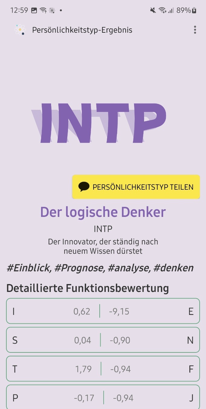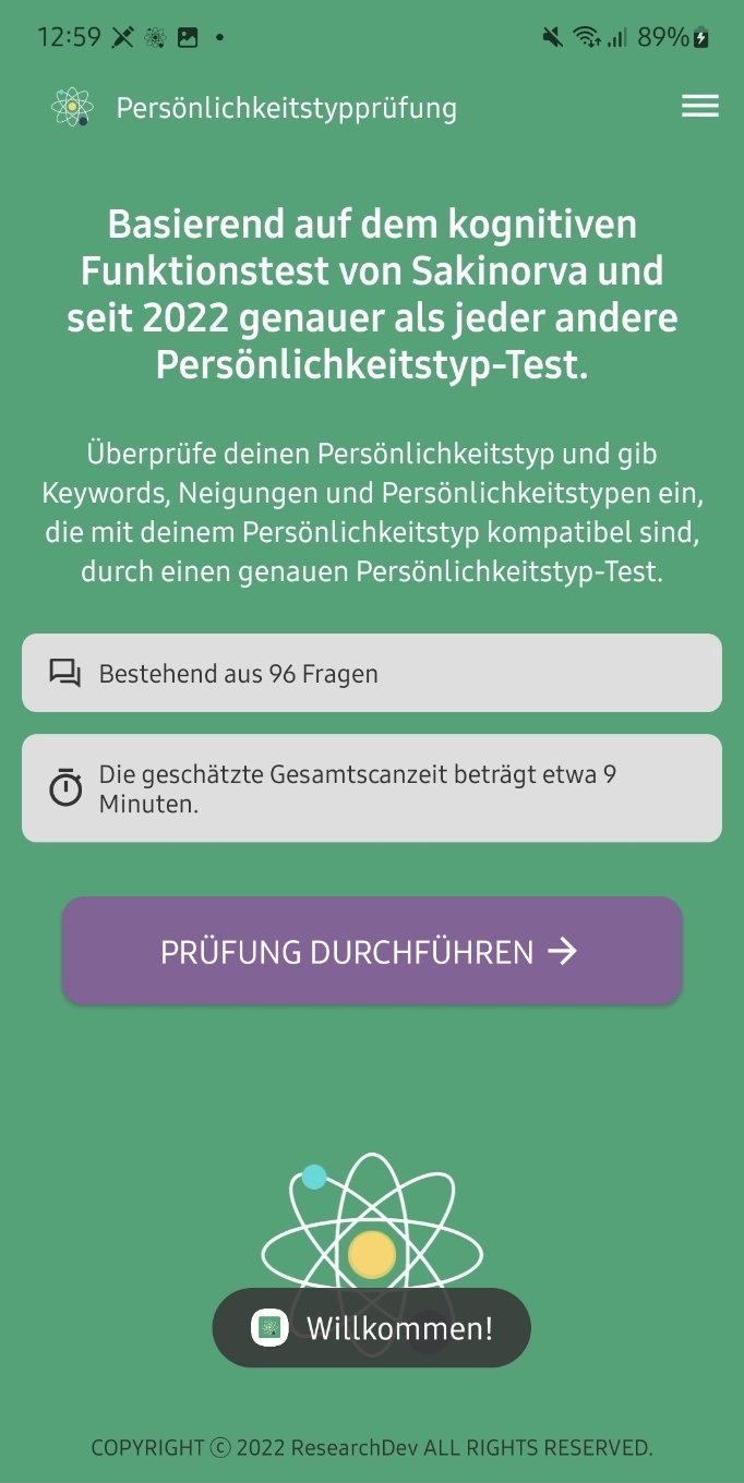 - Diese App basiert auf dem Sakinorva-Kognitionstest und ist laut Stand 2025 genauer als jeder andere MBTI-Test. - Sie wurde auf Grundlage des Myers-Briggs Type Indicator (MBTI) entwickelt. - Mit dem genauesten Persönlichkeitstest 2025 können Sie Ihren MBTI-Typ, Schlüsselbegriffe, persönliche Eigenschaften und kompatible Typen entdecken. - Es werden eigene Illustrationen der 16 MBTI-Persönlichkeitstypen von Redev verwendet. - Auf der Entwicklerseite von Redev kann zusätzlich ein Enneagramm-Test durchgeführt werden. - Ihre MBTI-Ergebnisse lassen sich einfach teilen. - Sie können Ihr heutiges Horoskop einsehen. - Weitere Persönlichkeitstests sind verfügbar. - Mit Mini-Tests können Sie z. B. Ihre Reaktionsgeschwindigkeit testen. - Ohne Anmeldung können Sie schnell und präzise Ihren MBTI-Typ und 8 Persönlichkeitsschlüsselbegriffe herausfinden.