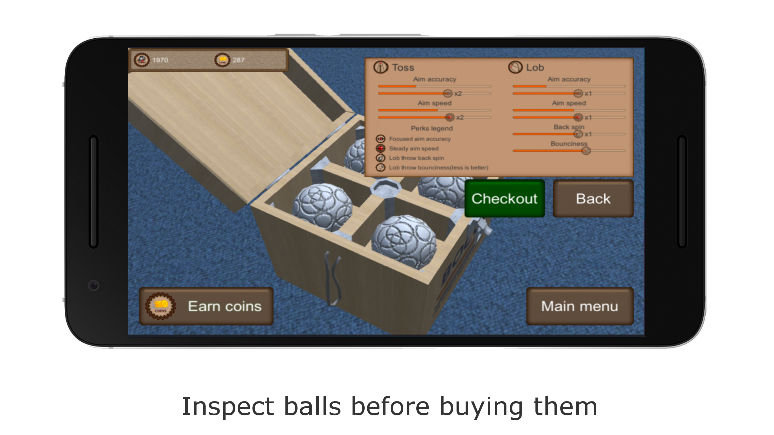✔ Powerups & Upgrades. Gewinn bringt Ihnen auch die Münzen. Die sind wichtig, weil Sie damit unterschiedliche Kugeln-Sets entsperren können. Jedes Set hat ein anderes Design, damit Sie ihre Kugeln von dennen deines Gegners unterschieden können, und auch verschiedene Eigenschaften (z.B. Wurfgenauigkeit, Geschwindigkeit und Abprallfaktor). Sie können auch verschiedene Power-Ups entsperren (z.B. Fokus, Zielsicher).