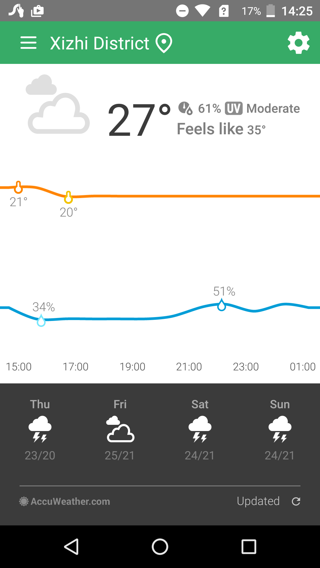 Weather and time details for cities. - Humidity and ultraviolet details - Daily forecast with weather data and humidity - Weekly weather forecast - Digital clock of your current location and of the selected location - Switch between Fahrenheit and Celsius