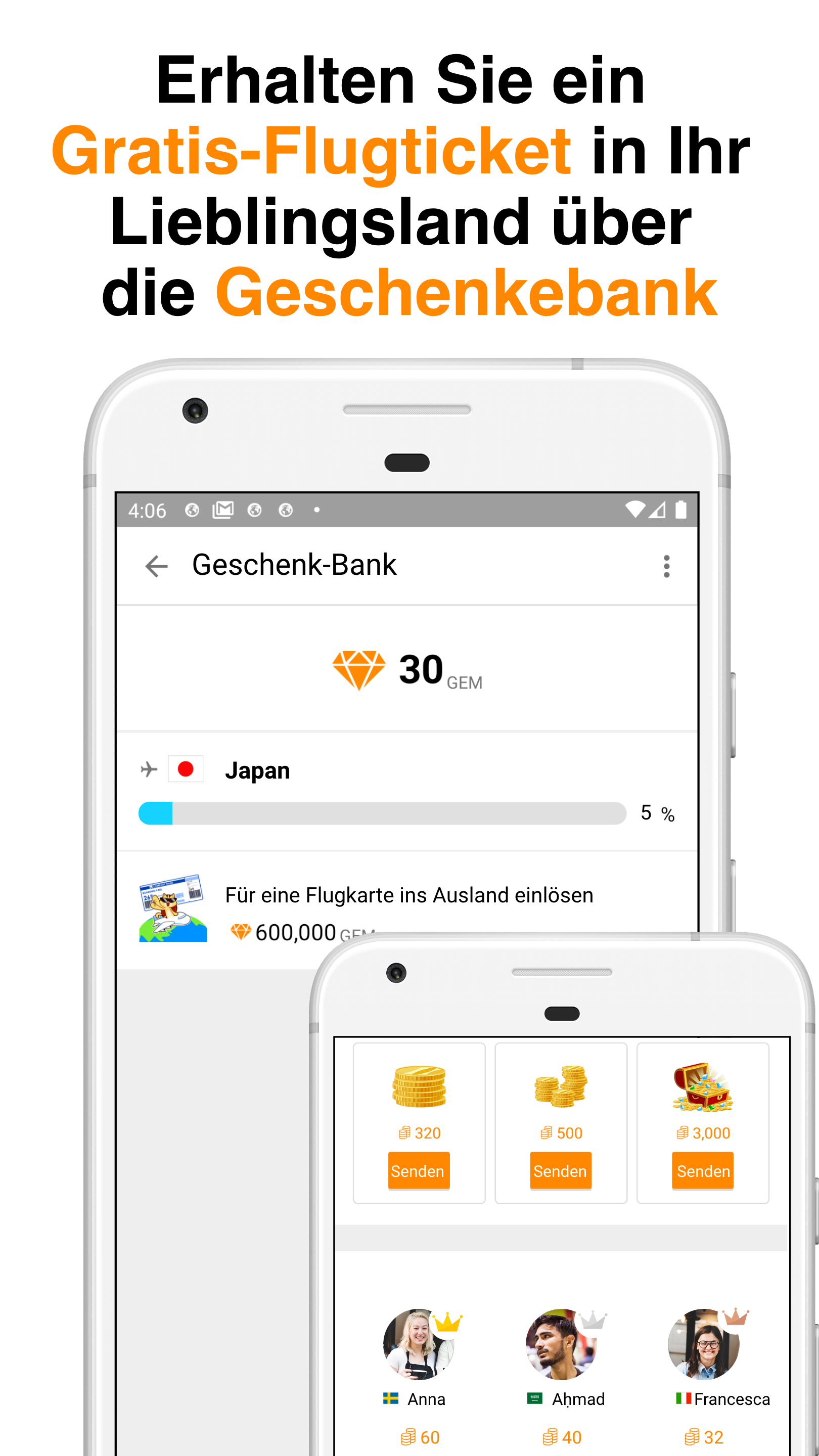 - Erhaltene Geschenke werden außerdem in der „Geschenk-Bank“ gesammelt und sobald Sie das Ziel erreicht haben, erhalten Sie ein Flugticket in ein Land Ihrer Wahl!