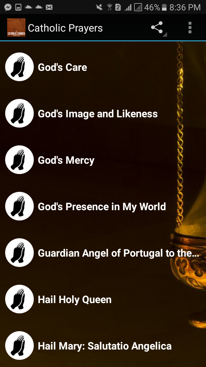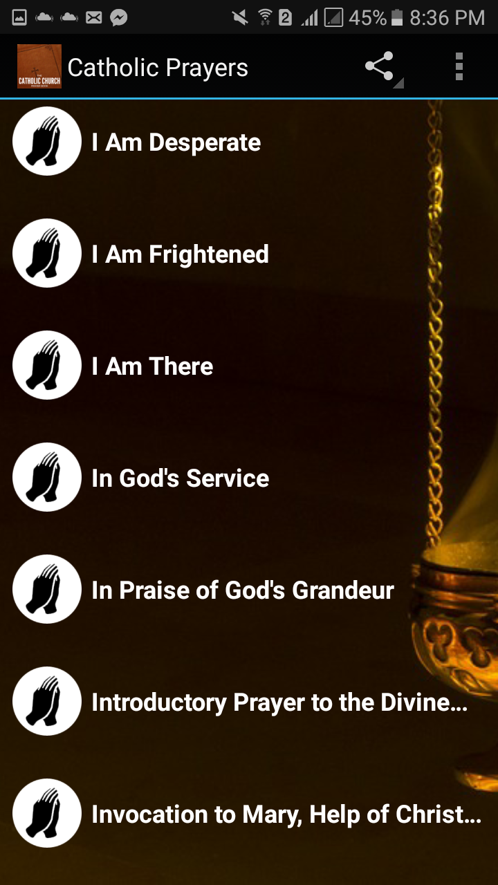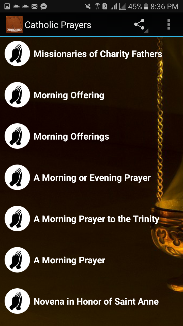 The All Catholic Prayers Offline is consist of all catholic prayers a catholic believer should know. From A-Z weve covered it all. Prayers for saints, Lords prayers, Mother Mary, Occasions, for Priest and many more. Download the app for the complete list and prayers. Below is just an overview of prayers inside. Heres the list : • Acceptance of Gods Will • Act of Consecration In the Universal Call to Holiness • Act of Love • Alma Redemptories Mater Loving Mother of the Redeemer • Angelus • Another Prayer for Priests • Apostles Creed • Ave Regina Caelorum Hail O Queen of Heaven • Beauty of Creation Bears Witness to God • Blessed Junipero Serra • Blessed Kateri Tekakwitha • Blessed Katharine Drexel • By Your Compassion • Canticle of Mary the Magnificat • Corpus Tuum Domine • Credo Ut Intelligam • Daily Intentions • God Be In My Head • God Speaking Through Events • Godly Meditation • Gods Blessings • Gods Care • Gods Image and Likeness • Gods Mercy • Gods Presence In My World • Guardian Angel of Portugal to the Fatima Seers • Hail Holy Queen • Hail Mary • How Good It Is to Love You • Invocation to Mary Help of Christians • Knowing Desiring Loving • Learning Christ • Let Me Be Free • Litany of Humility • Maria Mater Gratiae • Meditation On Death • Meditation • Meditations by Saint Francis De Sales • Memorare • Missionaries of Charity Fathers • Morning Offering • Morning Offerings • Morning Or Evening Prayer • Morning Prayer to the Trinity • Morning Prayer • Novena In Honor of Saint Anne • Praise the Lord • Quam Suavis Est • Prayer After Receiving Holy Communion • Prayer At Dawn • Prayer Before Holy Communion • Prayer Before Mass • Prayer Before Meditation • Prayer Before Preaching • Prayer for Eternal Life From A Kontakion of the Byzantine Rite • Prayer of Saint Bonaventure • Prayer of Saint Edmund of Abingdon • Prayer of Saint Ephrem the Syrian • Prayer of Saint Ephrem • Prayer of Thanksgiving After Confession • Prayer of Thanksgiving After Holy Communion • Prayer of Thanksgiving for Priestly Ordination • Prayer of Thomas A Kempis • Prayer of Trust In Gods Will • Prayer of Trust • Prayer to Ones Guardian Angel • Prayer to the Holy Spirit • Prayer to the Infant Jesus of Prague • Prayer to the Most Blessed Virgin Mary • Prayer to the Most Holy Redeemer 2 • Prayer to the Most Holy Redeemer • Prayer to the Mother of Consolation • Prayer to the Sacred Heart of Jesus • Prayers and Hymns by John Henry Cardinal Newman • Prayers for the Church • Psalm 51 Miserere • Receiving the Sinner • Reflecting Your Brightness • Regina Caeli Queen of Heaven • Responsory for All the Faithful Departed • Responsory for the Dead • Retribuere Dignare Domine • Saint Catherine of Siena • Saint Charles Borromeo • Saint Elizabeth Ann Bayley Seton • Saint Frances Xavier Cabrini • Saint John Vianney • Saint Patricks Breastplate • Saint Philip Neri • Saint Rose Philippine Duchesne • Saint Therese of Lisieux • Saint Thomas Aquinas • Salve Regina Hail Holy Queen • Sanda Maria Succurre Miseris • Saturated In His Love • Searching for God • Seed of Love • Sequence for the Solemnity of Pentecost • Serenity Prayer • Serpent and Dove • Seven Penitential Psalms • Ship of Life • Sonnet to Our Lord On the Cross • Sub Tuum Praesidium We Fly to Thy Protection • Suffering As Discipline • Suscipe • We Cannot Deceive You • Who Will Help Me • You Are Fair O Mary • You Were In Me