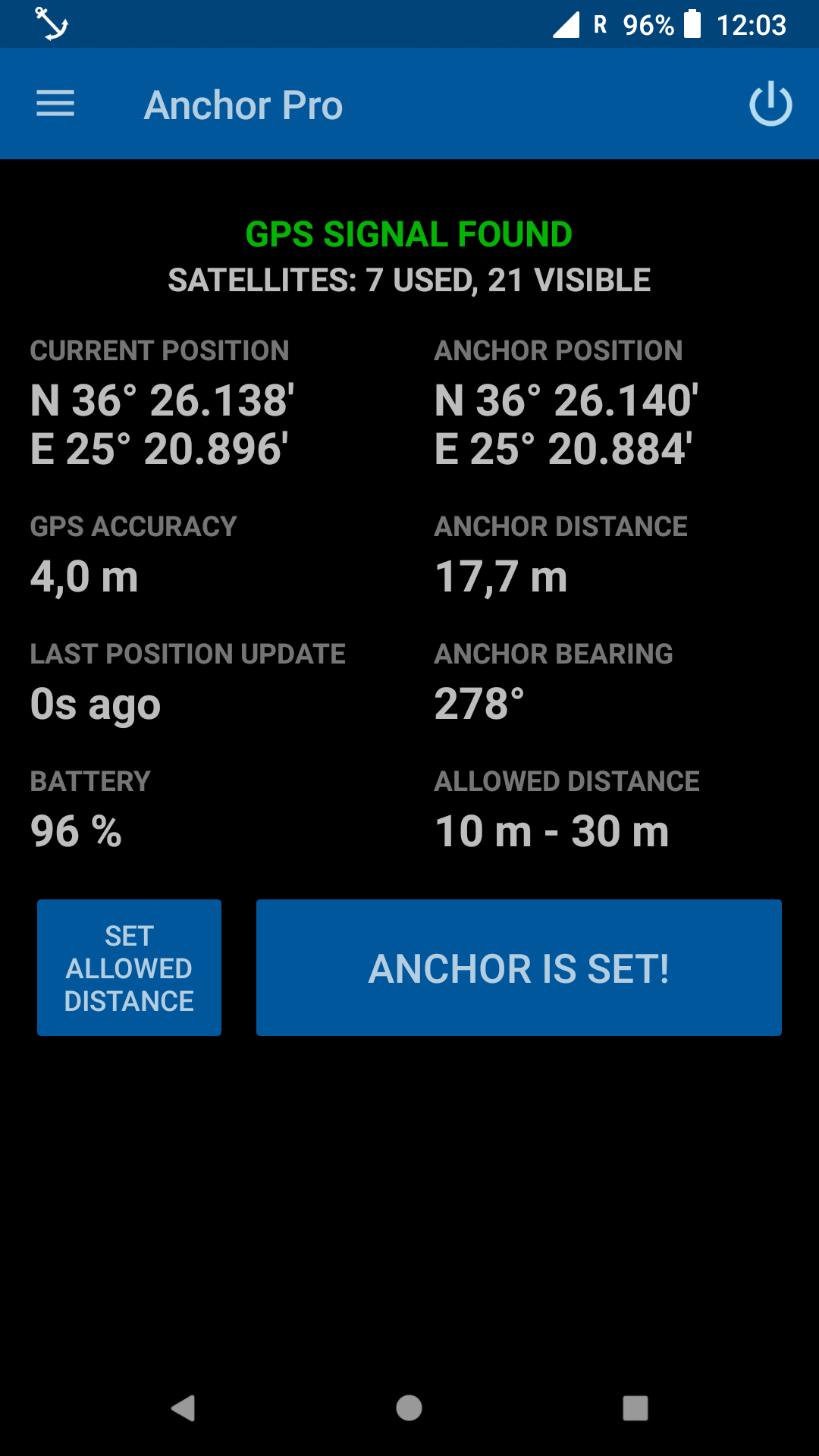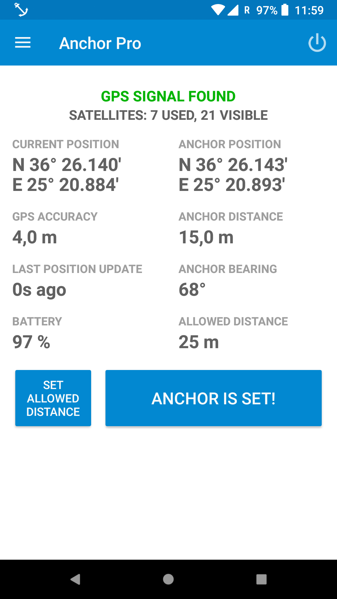 Anchor Watch PRO ist ein Positionslogger, eine Fern-Sofortnachricht oder ein E-Mail-Alarm und ein akustischer Alarm, der den aktuellen Standort des Geräts überwacht und Sie informiert, wenn sich der Standort des Geräts zu weit vom gesetzten Anker entfernt. In diesem Fall wird ein Alarm ausgelöst und optional eine Nachricht per Instant Messaging oder E-Mail an ein anderes Telefon gesendet.