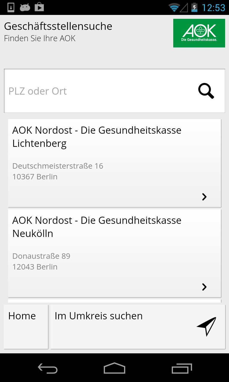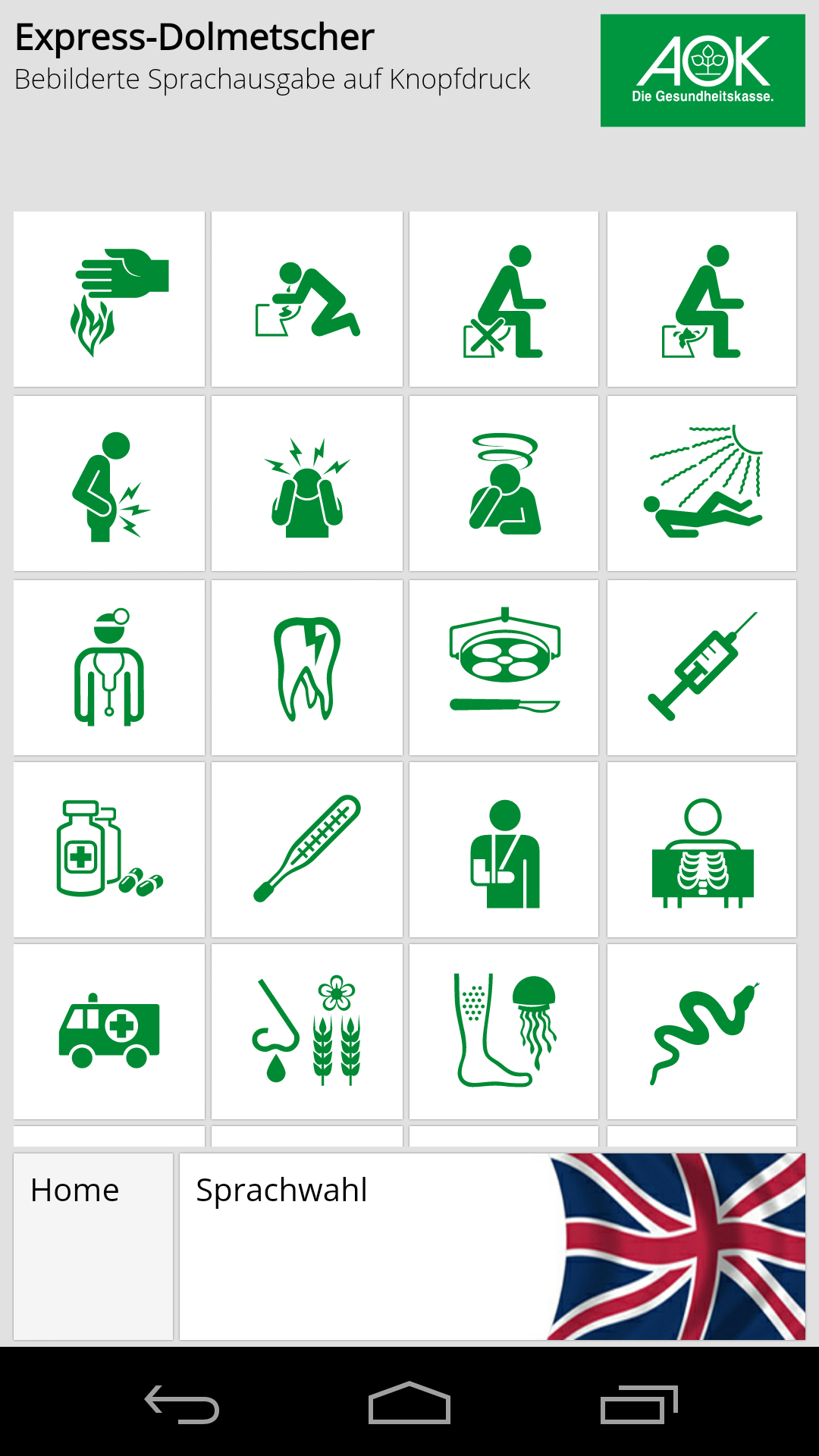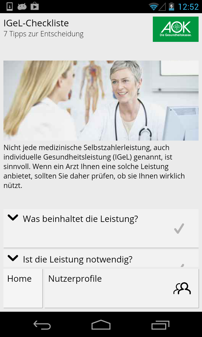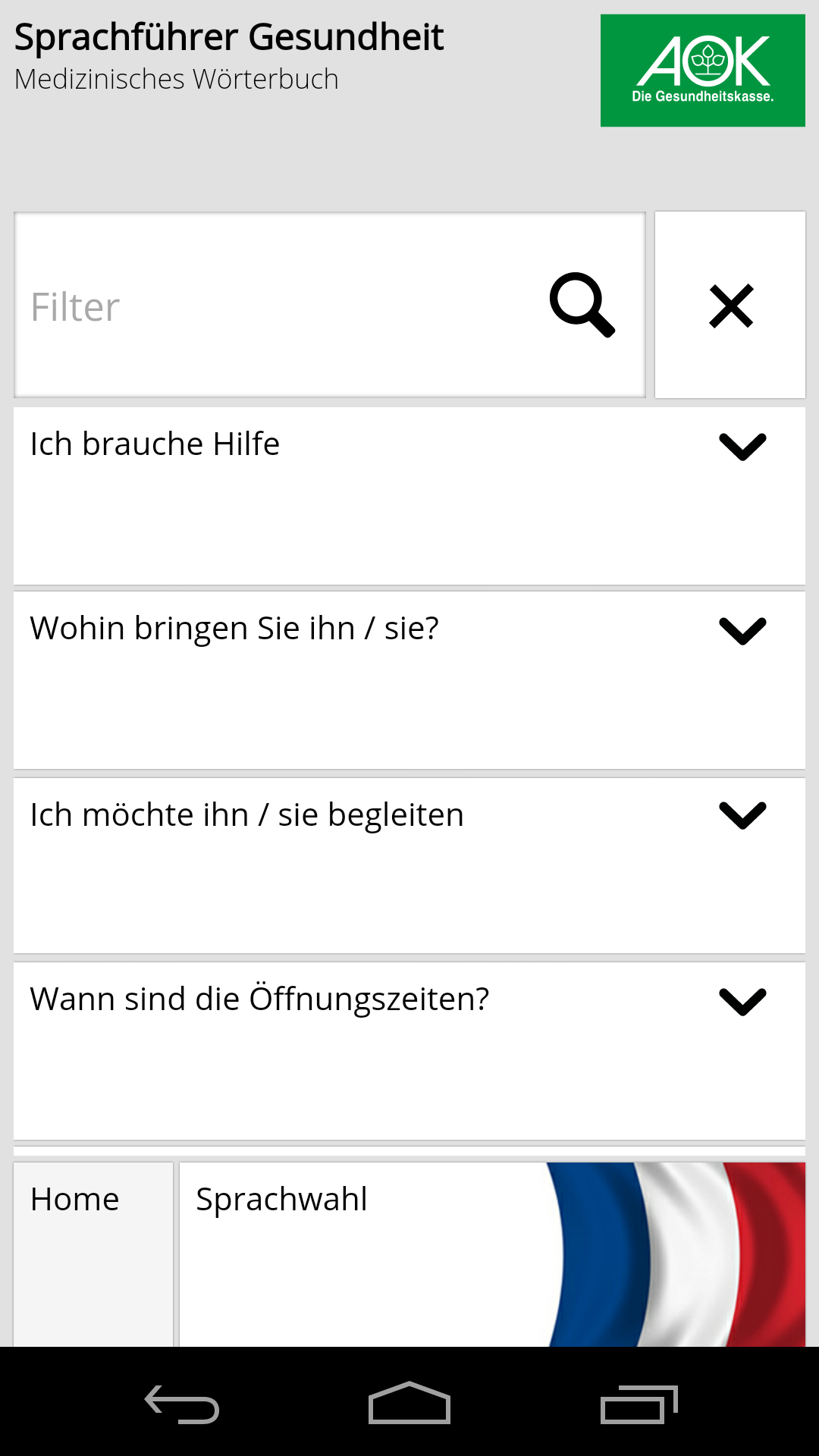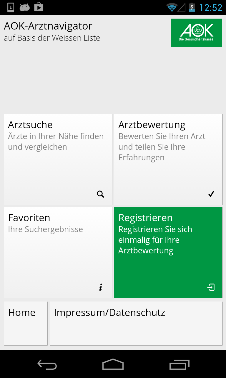 Die AOK-Arztapp richtet sich an gesetzlich versicherte Patienten und bietet ihnen umfassende Informationen rund um den Arztbesuch. Der Express-Dolmetscher Medizin bildet in 25 Piktogrammen die wichtigsten medizinischen Themen ab, mit denen Urlauber zu tun haben – von Durchfall bis zum Zeckenbiss. Auf Knopfdruck übersetzt der „Express-Dolmetscher“ diese Begriffe in sieben Sprachen und bietet so eine schnelle Hilfe für die erste Verständigung bei medizinischen Problemen. Neben Englisch und Französisch gibt es aktuell eine Übersetzung in Griechisch, Italienisch, Niederländisch, Polnisch und Spanisch. Wesentlich umfassender ist der „Sprachführer Gesundheit“: Dieses medizinische Wörterbuch umfasst insgesamt über 600 Begriffe pro Sprache. Darunter sind auch kurze Sätze wie „Rufen Sie schnell einen Arzt!“ und Fragen, die beim Arztbesuch eine Rolle spielen. Der „Sprachführer Gesundheit“ bietet genau wie der „Express-Dolmetscher“ eine Übersetzung in sieben Sprachen und ermöglicht so im Falle des Falles eine Verständigung im Ausland. Über den AOK-Arztnavigator können die Nutzer der App Ärzte suchen und bewerten. Sie können sich Haus- und Fachärzte in der Umgebung anzeigen lassen – auf Wunsch auch auf einer Karte. Außerdem haben sie die Möglichkeit, ihre Erfahrungen beim Arztbesuch mit anderen Patienten zu teilen: Nach einer Registrierung können sie ihre Ärzte bewerten – anonym und fair für die beurteilten Ärzte. Der Vorsorgeplaner hilft, die Termine für Vorsorgeuntersuchungen im Griff zu behalten: Er informiert über Untersuchungen zur Früherkennung, Zahnvorsorge, Impfungen, Schwangerschaftsvorsorge und U-Untersuchungen für Kinder. Mit der AOK-Arztapp kann sich der Nutzer ein persönliches Profil erstellen – für sich selbst oder für die ganze Familie. Auf Wunsch werden die Untersuchungstermine direkt in den Smartphone-Kalender eingetragen. Eine IGeL-Checkliste bietet Wissenswertes zu Selbstzahlerleistungen. Denn nicht jede dieser Leistungen, die Patienten in der Arztpraxis angeboten wird, ist sinnvoll. Patienten sollten daher prüfen, ob „individuelle Gesundheitsleistungen“ (IGeL), die sie selbst bezahlen sollen, ihnen auch wirklich nützen. Worauf sie dabei achten sollten, erklärt die IGeL-Checkliste. Eine AOK-Geschäftsstellensuche hilft, auch unterwegs schnell und einfach die nächste Filiale der AOK zu finden und Kontakt aufzunehmen. Kurzbeschreibung der Funktionen: - Ärzte in der Umgebung suchen – mit eigener Position als Ausgangspunkt - Ergebnisse sortieren – nach Entfernung oder Weiterempfehlung anderer Patienten - Ärzte vergleichen – durch direkte Gegenüberstellung der Ergebnisse - Einfache Arztbewertung direkt in der App - Praxen in der Umgebung auf einer Karte anzeigen lassen - Suchläufe speichern, Ärzte merken und in Merkliste verwalten - Anfahrt zur Praxis planen – mit Routendarstellung auf der Karte - Praxis aus der App heraus anrufen - Termine für Vorsorgeuntersuchungen und Impfungen verwalten - Persönliche Profile zu Vorsorgeuntersuchungen für verschiedene Nutzer anlegen - Vorsorgetermine aus der App heraus in den Kalender eintragen - Checkliste zum Thema IGeL - AOK-Geschäftsstellen suchen – mit eigener Position als Ausgangspunkt - AOK-Geschäftsstellen aus der App heraus anrufen - Schnelle Übersetzung von medizinischen Begriffen mittels Piktogrammen - Medizinischen Wörterbuch in aktuell 8 Sprachen inkl. Filterfunktion