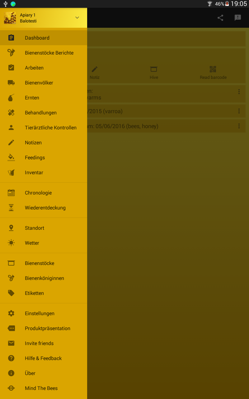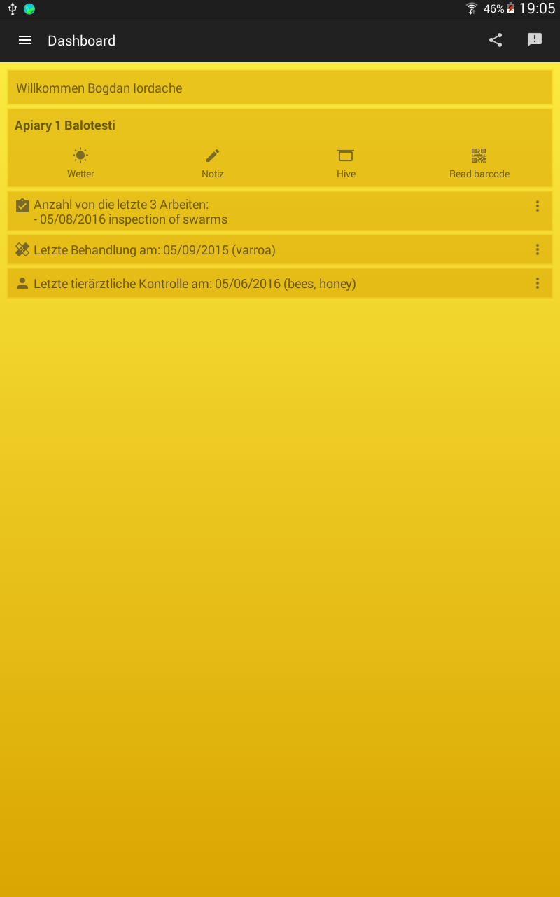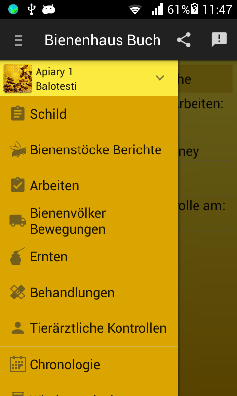 Mittels einer freundlichen Oberfläche kann der Bienenzüchter mehrere Bienenhäuser (Stände) eintragen, die fälligen Arbeiten, Wachs- und Honiggewinnung, Wanderungen oder Tierarztbesuche.