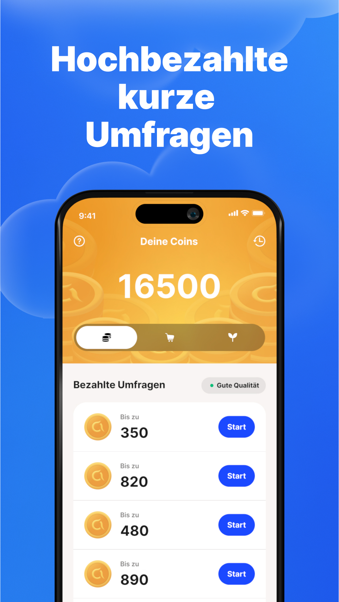 - Verdiene Appinio Coins und tausche sie gegen Gutscheine, spende sie an wohltätige Organisationen oder lasse sie direkt auf dein Konto auszahlen.