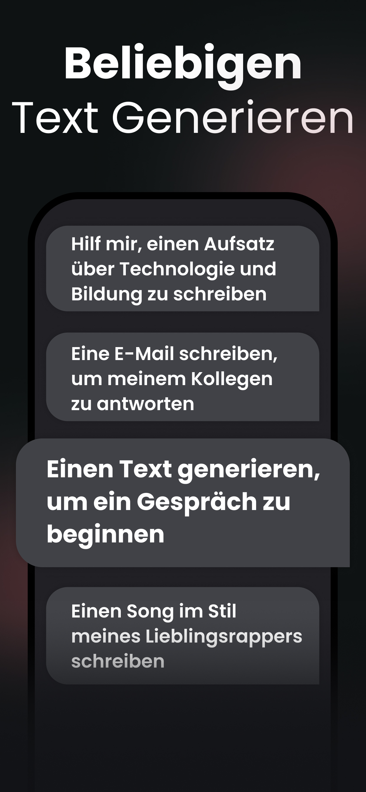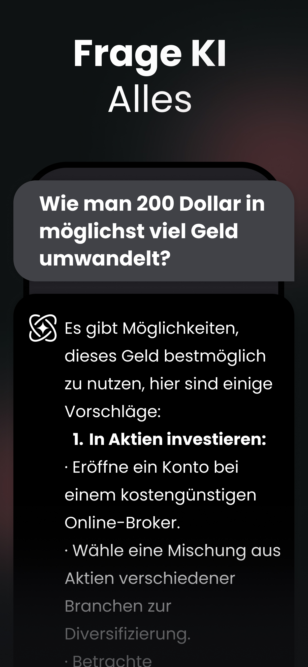 Willkommen bei Chat AI – Entdecken Sie jeden Tag unendliche Möglichkeiten! Erleben Sie Gespräche mit einer KI, die Sie versteht, sich an Ihre Stimmung anpasst und Gespräche personalisiert, sodass jede Interaktion einzigartig ist. FRAGEN SIE ALLES, JEDERZEIT: Neugierig, wie es wäre, mit historischen Persönlichkeiten oder Business-Gurus zu sprechen? Chat AI macht diese faszinierenden Gespräche direkt von Ihrem Telefon aus möglich. Sie können nach Empfehlungen fragen, sich inspirieren lassen oder etwas Neues lernen. KI-ASSISTENTEN FÜR JEDE AUFGABE: Brauchen Sie Expertenunterstützung? Die App umfasst eine Vielzahl intelligenter KI-Assistenten, die auf verschiedene Bereiche spezialisiert sind — von kreativen Autoren und Logo-Designern bis hin zu Business-Planern, Fitness-Coaches und mehr. Was auch immer Sie vorhaben, ein Assistent steht bereit, Sie zu unterstützen. BILDERZEUGUNG UND -ERKUNDUNG: Werden Sie Ihr Eigener Künstler: Nutzen Sie die KI-Bilderzeugung, um eine Szene zu visualisieren oder einen Ort zu beschreiben, an dem Sie noch nie waren. Unsere KI verwandelt Ihre Ideen in schöne Bilder. Erstellen Sie Buchcover, Social-Media-Posts, Postkarten und mehr. Lernen Sie Ihre Welt Durch Bilder Kennen: Machen Sie ein Foto von allem um Sie herum — Gebäuden, Kunst oder Landschaften — und erhalten Sie sofortige Informationen mithilfe der Bildeingabe-Technologie. VERBESSERTER TEXTGENERATOR FÜR EINFACHE SCHREIBHILFE: Unser KI-gestützter Schreibassistent kann Ihnen helfen, Ideen zu generieren, Gliederungen zu schreiben und sogar ganze Absätze zu verfassen. Bewältigen Sie jede Schreibaufgabe mit Leichtigkeit. Werden Sie kreativ, egal ob Sie ein Lied komponieren, eine Geschichte für Ihre Kinder schreiben, einen Blogbeitrag oder eine E-Mail verfassen. EINFACHE WEB-SUCHE: Sagen Sie unserer KI, woran Sie interessiert sind, ob es sich um die neueste Technologie, Modetrends oder Gesundheitstipps handelt, und erhalten Sie alle aktuellen Informationen, die Sie benötigen. SPASSIGES SPRACHENLERNEN UND HAUSAUFGABENHILFE: Sprachpraxis: Lernen Sie Japanisch durch ein Samurai-Abenteuer oder Spanisch, während Sie ein virtuelles Restaurant führen. Die KI macht das Lernen neuer Sprachen spannend und praktisch. Akademische Unterstützung: Bei einem Problem hängengeblieben? Verwenden Sie Chat AI als Ihren Hausaufgabenhelfer, um Sie durch Schulaufgaben in jedem Fach zu führen. INTELLIGENTER ZUSAMMENFASSUNGSASSISTENT: Schnelle Zusammenfassungen: Erhalten Sie die Kernpunkte langer Videos oder komplexer Dokumente auf unterhaltsame und interaktive Weise. Stellen Sie Fragen: Laden Sie ein Dokument hoch, fügen Sie einen Weblink zu einem Artikel oder Video ein, stellen Sie dann Fragen und erhalten Sie sofort Antworten. Chat AI ist nicht nur eine App — es ist Ihr Tor zu einem informierteren, fantasievolleren und interaktiveren Leben. Laden Sie Chat AI jetzt herunter und beginnen Sie, eine Welt voller Möglichkeiten zu erkunden! Datenschutzrichtlinie: https://static.askaichat.app/privacy-en.html Nutzungsbedingungen: https://static.askaichat.app/terms-conditions-en.html