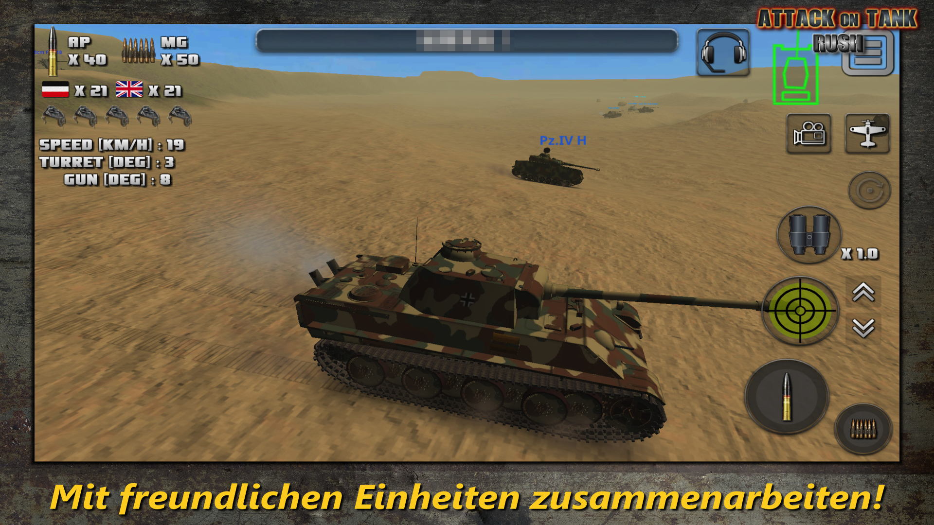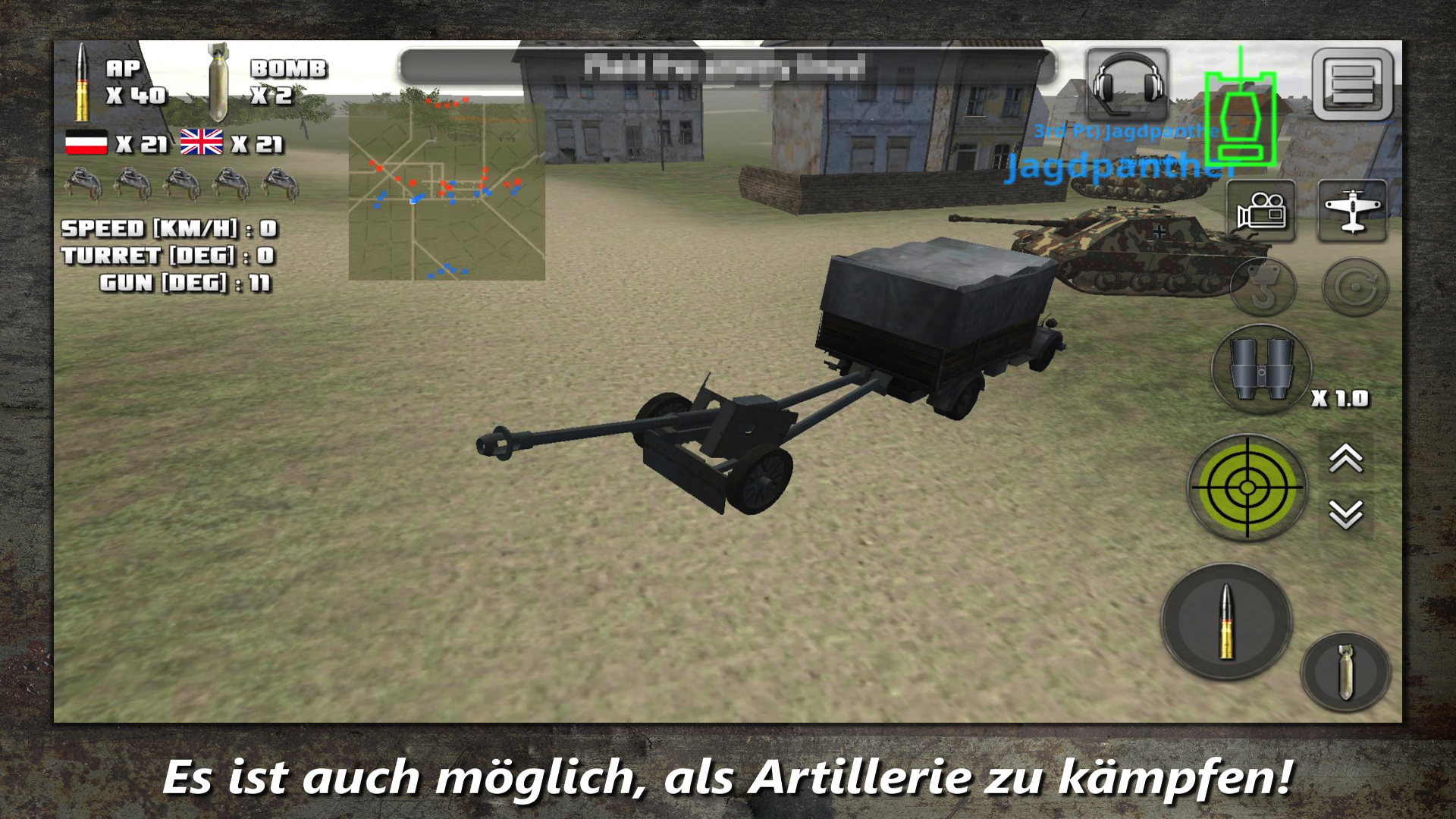 Das verlorene Hardcore- und immersive Erlebnis ist da! Warum erleben Sie nicht auch einen echten, vergessenen Kampf? Dieses Spiel wurde insgesamt mehr als 1 Million Mal heruntergeladen, dank Ihnen. Als Mitglied eines Panzerzuges übernehmen Sie eine Vielzahl von Aufgaben! Ein heftiger Kampf zwischen Panzern auf einem immersiven Schlachtfeld! Die Zusammenarbeit mit Verbündeten ist unerlässlich, um den Kampf zu Ihrem Vorteil voranzubringen. Nutzen Sie Ihre Taktik, um das Machtgefälle zwischen Ihnen und den mächtigen feindlichen Kräften zu überwinden! Können Sie überleben und ein Held auf diesem wilden Schlachtfeld werden? Es ist jetzt kostenlos zum Herunterladen und Spielen! Merkmale : - Sie können gegen Spieler aus der ganzen Welt im Online-Mehrspielermodus (PvP-Match) spielen. - Kostenlose 3D-Action- und Simulator-Panzerspiel-App zum Kampf mit echten Panzern. - Sie können sich auf dem riesigen Schlachtfeld der offenen Welt frei bewegen. - Auf dem Feld der Insel werden Schlachtschiffe und Kreuzer den Bodenkampf unterstützen! - Indirektes Feuer von schweren Kanonenhaubitzen erhöht die Spannung der Schlacht. - Es gibt eine Vielzahl von Missionen, darunter Aufklärung, Hinterhalte, Überfälle und Blitzangriffe. - Die realistische Inszenierung und der Sound lassen Sie auf dem Schlachtfeld ein Gefühl der Dringlichkeit erleben, das mehr als nur ein Panzerspiel ist. - Realistisches Schadenssystem mit komplexen physikalischen Berechnungen. - KI-Panzereinheiten kämpfen mit präzisen Bewegungen und ausgefeilten Taktiken. - Es ist auch möglich, die Kampfsituation zu ändern, indem man zu Luftangriffen und Unterstützungsfeuer aufruft. - Eine mächtige Luftschlacht des berühmten Gegenjägers wird nachgestellt. - Es ist möglich, Panzerabwehrminen zu legen und die Raupe des gegnerischen Panzers zu zerstören. - Als Visiereinrichtung kann ein koaxiales Maschinengewehr verwendet werden. - Realistisches Tankverhalten wird durch einfache Touch-Bedienung erreicht. - Sie können zwischen der First-Person- (FPS) und Third-Person-Sicht (TPS) wechseln. - Wir empfehlen dieses Spiel für diejenigen, die klassische Panzerspiele mögen, weil es die Panzerschlachten des getreu wiedergibt. - Berühmte Panzer aus großen Ländern erscheinen nacheinander (z.B. Sowjetunion, Deutschland, Vereinigte Staaten von Amerika, Empire of Japan, Britisches Empire, Königreich Italien) FAQ : Q. Wie bekomme ich Münzen in das Spiel? A. Goldmünzen können durch In-App-Käufe erworben werden. Silbermünzen können durch das Ansehen von Prämienanzeigen verdient werden. Q. Wie entsperre ich Panzer? A. Freie Panzer können durch Vorrücken der Missionen freigeschaltet werden. Andere Panzer können mit Goldmünzen gekauft werden. Q. Ich möchte ein Flugzeug betreiben. A. Rufen Sie zunächst ein befreundetes Flugzeug mit der Subwaffentaste aus und drücken Sie dann die Flugzeug-Taste in der oberen rechten Ecke. Q. Wo ist der "Tiger II"-Panzer? A. Die "Tiger II"-Panzer sind vorübergehend nicht erhältlich, werden aber in Zukunft wieder eingeführt. Q. Haben feindliche und freundliche A.I. unterschiedliche Fähigkeiten? A. Wenn es sich um den gleichen Panzer oder das gleiche Flugzeug handelt, sind die Fähigkeiten für Freund und Feind genau gleich. Vorsicht : - Diese App erfordert eine Internetverbindung. - Es wird empfohlen, gekaufte Münzen und Gegenstände mit Hilfe von Betriebssystemfunktionen oder anderen Sicherungsanwendungen wiederherzustellen. Die Wiederherstellung der Daten erfolgt auf eigene Gefahr. - Je nach Leistung des Geräts kann es beim ersten Start etwas dauern, bis es geladen ist. - Wenn eine weitere App-Benachrichtigung erfolgt, kann der Ton des Spiels angehalten werden. In diesem Fall starten Sie bitte die App neu. Offizielles Twitter : https://twitter.com/LNG_Apps Der Spielinhalt wird auch in Zukunft weiter aktualisiert werden! Viel Spaß!!