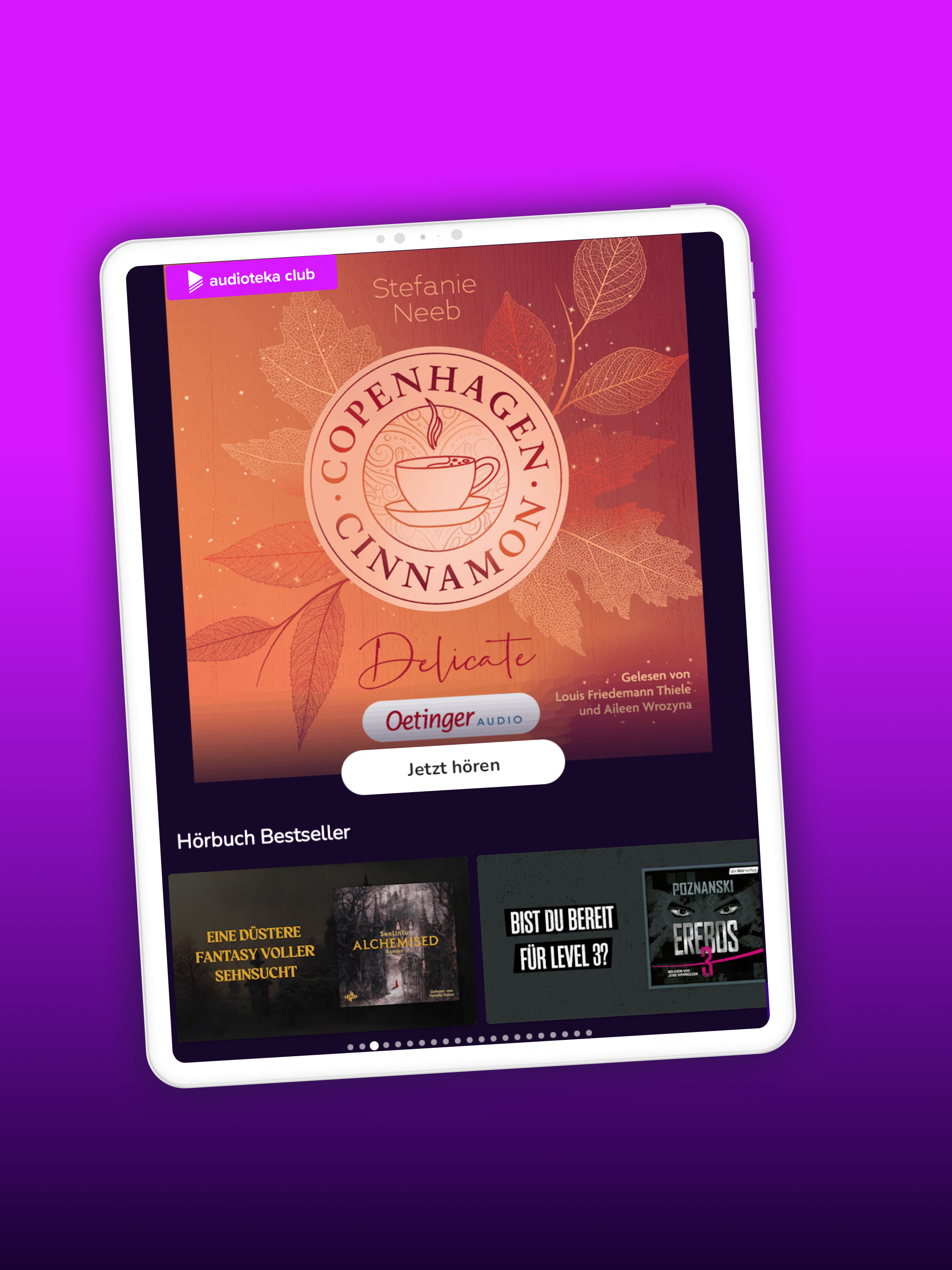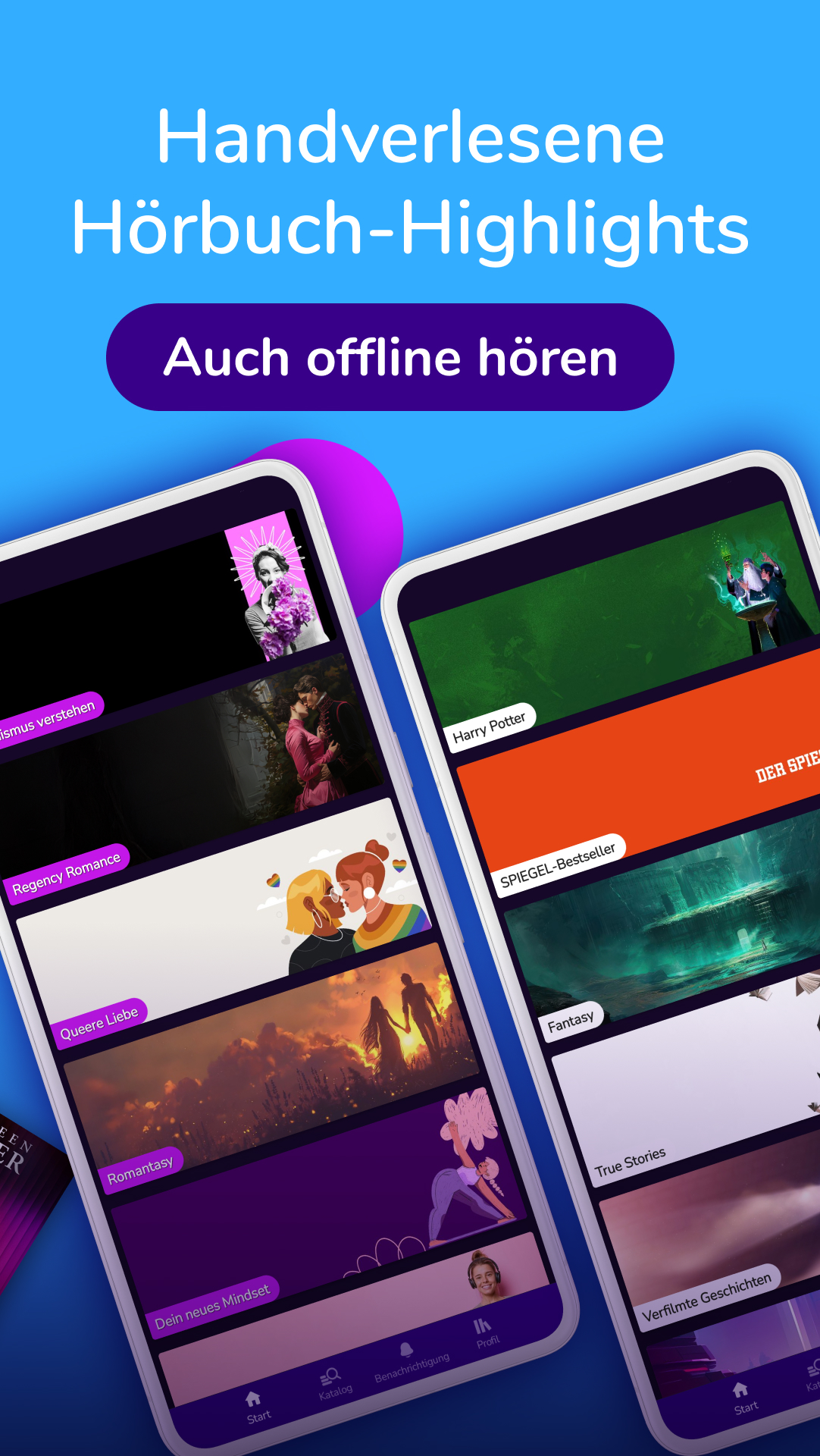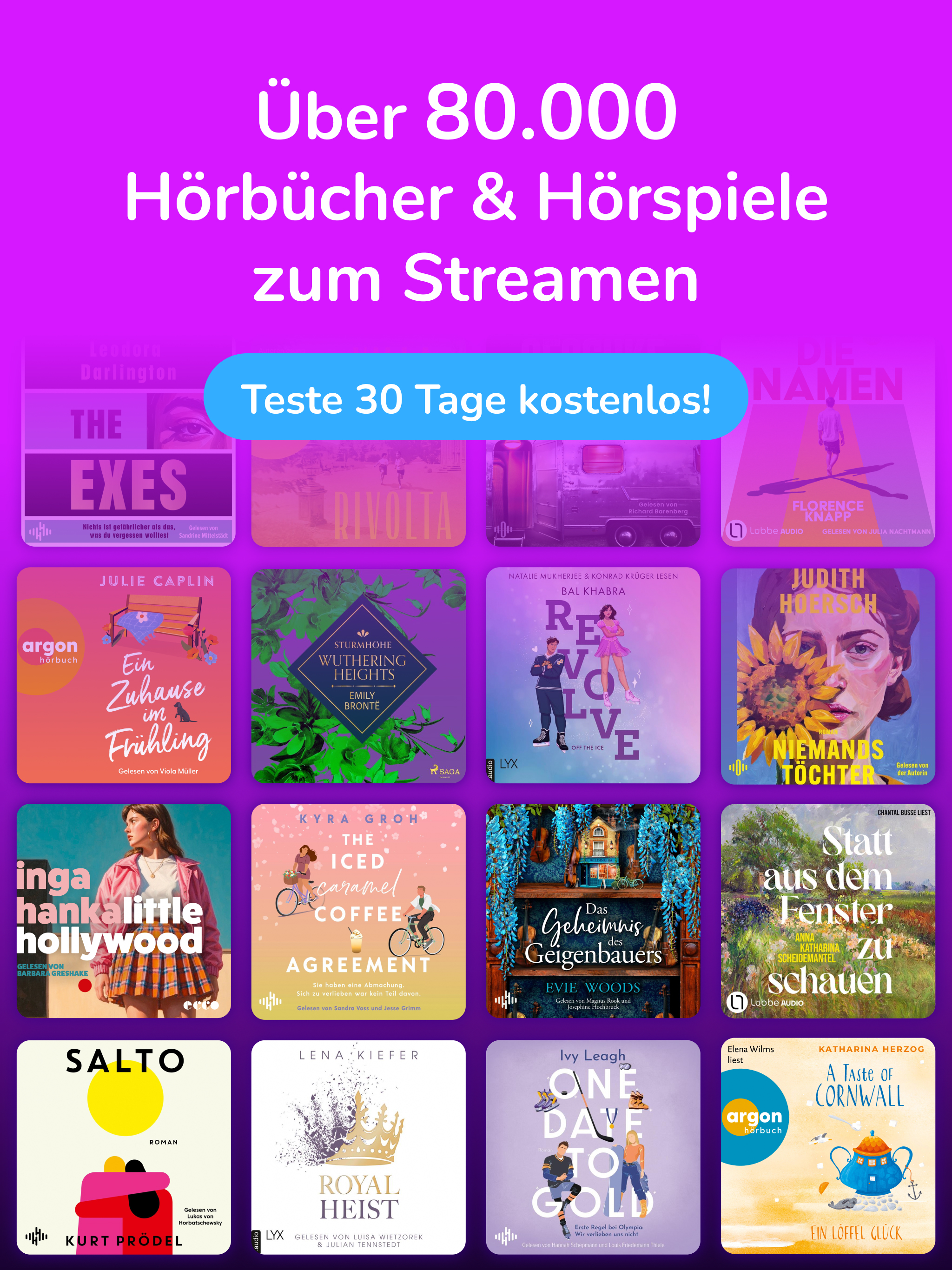 Lass dich von erstklassigen Stimmen durch deinen Alltag begleiten. Tauche ein in spannende Krimis, große Liebesgeschichten oder magische Fantasy-Welten. Lerne Neues mit starken Sachhörbüchern, finde Inspiration für ein besseres Leben oder begleite dein Workout, deinen Spaziergang oder deine Reise mit dem perfekten Hörbuch. Auch für Kinder gibt es jede Menge zu entdecken – von Hörspielen bis zu liebevoll erzählten Geschichten. Unsere Hörbücher sind die perfekte Playlist für jeden Moment.