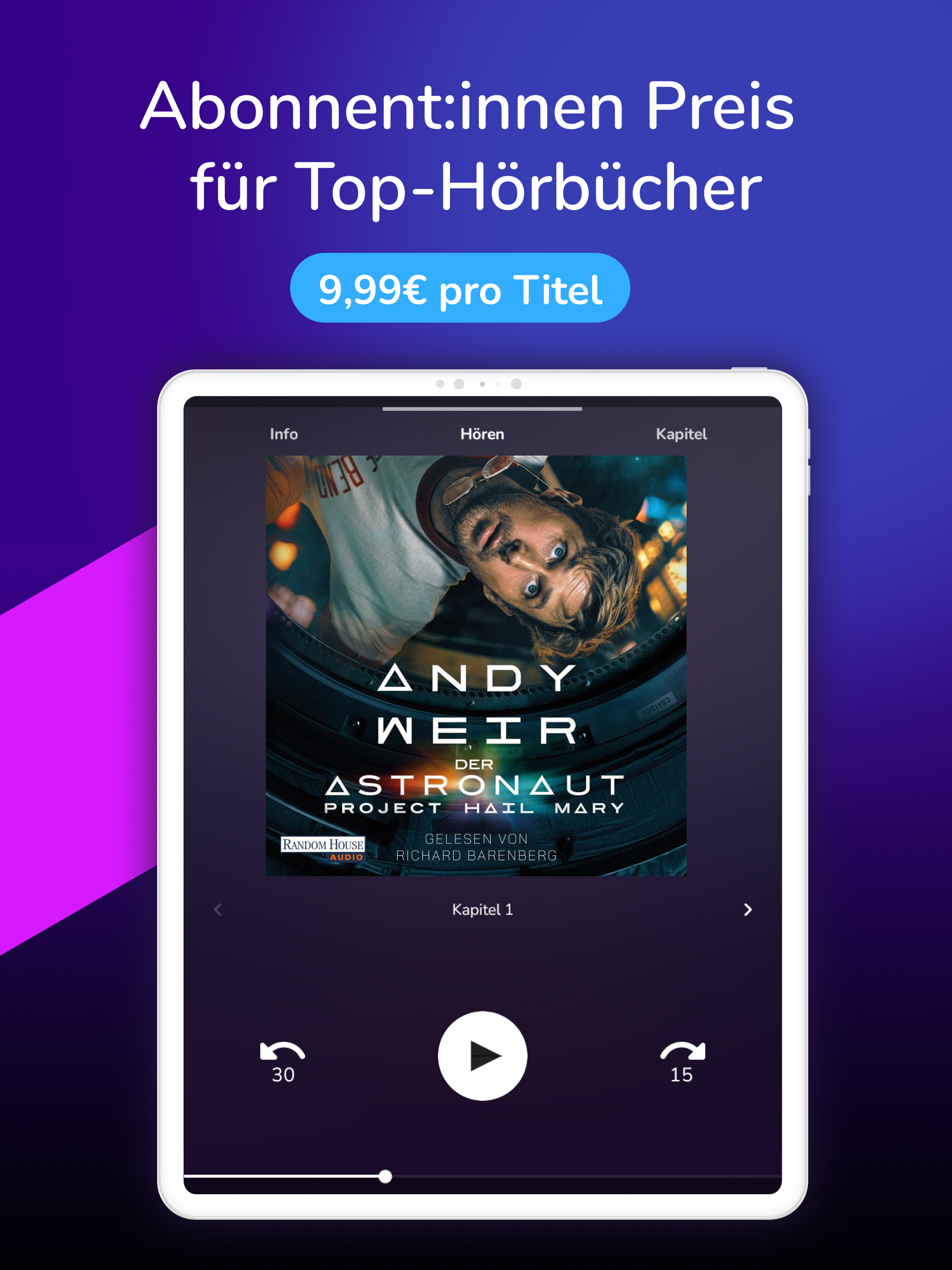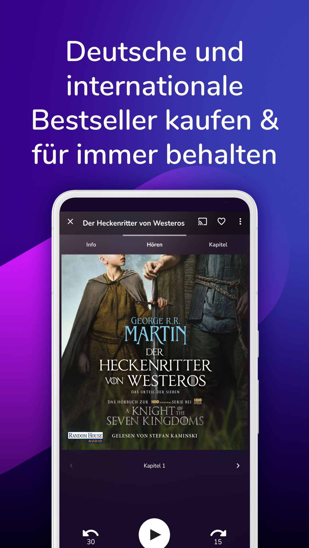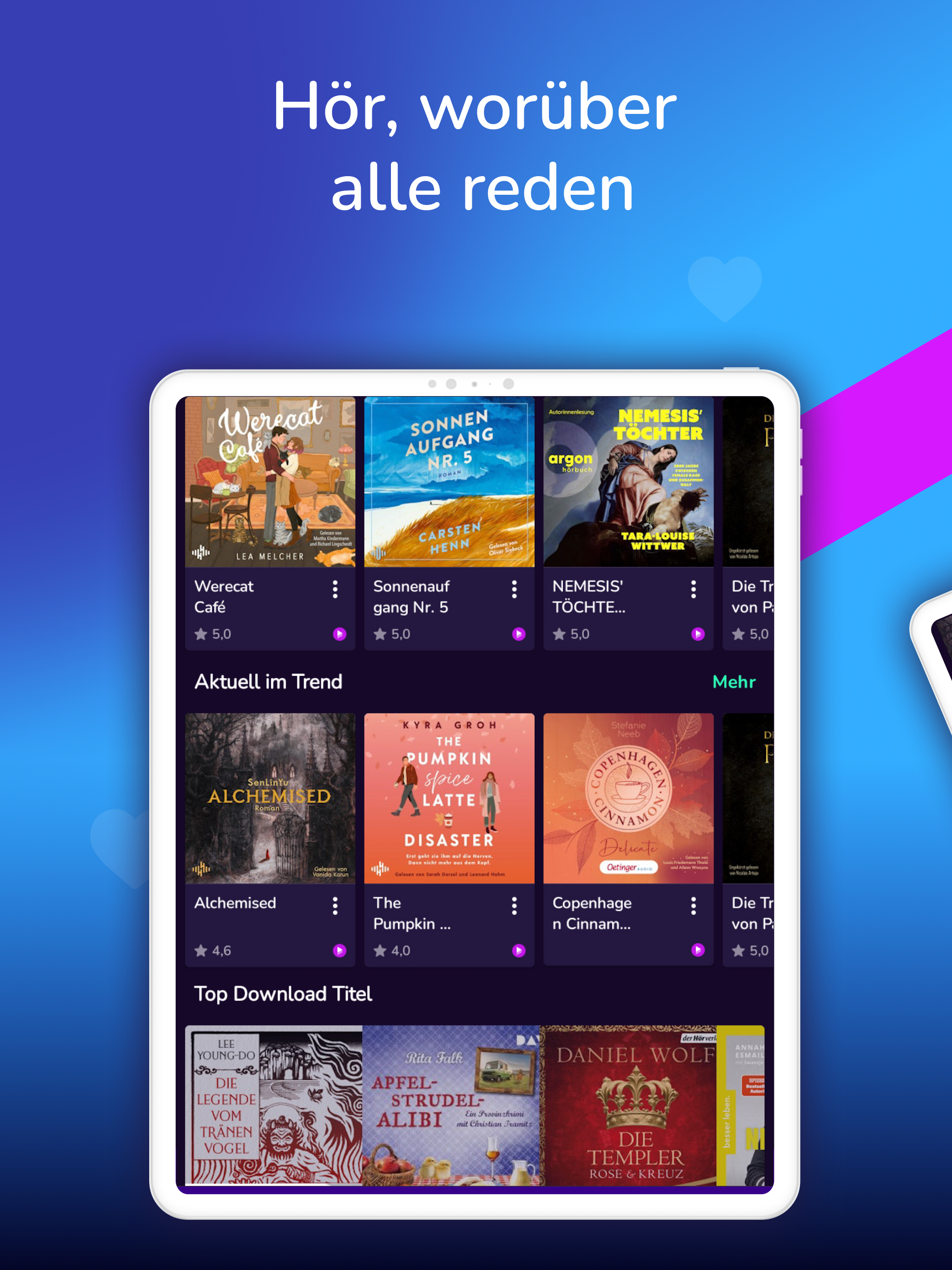 Lass dich von erstklassigen Stimmen durch deinen Alltag begleiten. Tauche ein in spannende Krimis, große Liebesgeschichten oder magische Fantasy-Welten. Lerne Neues mit starken Sachhörbüchern, finde Inspiration für ein besseres Leben oder begleite dein Workout, deinen Spaziergang oder deine Reise mit dem perfekten Hörbuch. Auch für Kinder gibt es jede Menge zu entdecken – von Hörspielen bis zu liebevoll erzählten Geschichten. Unsere Hörbücher sind die perfekte Playlist für jeden Moment.