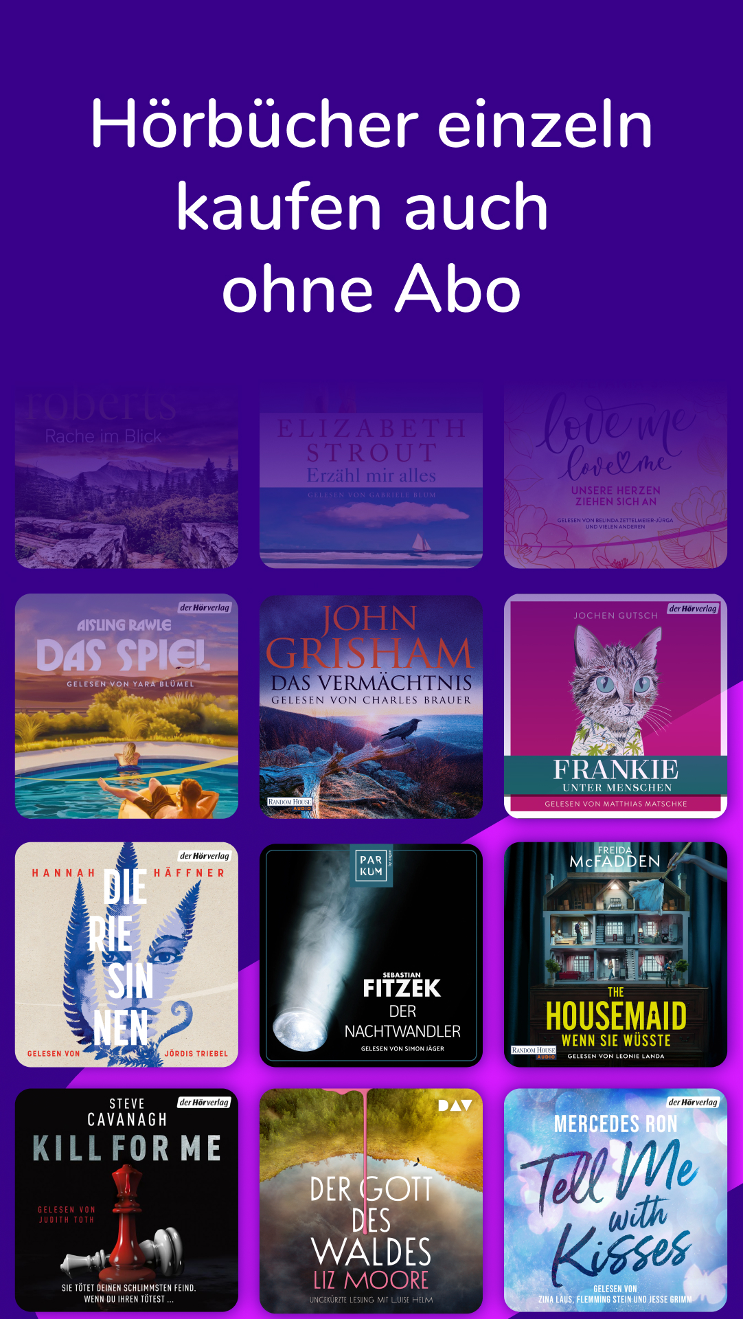 Kein Abo nötig: Kaufe Hörbücher ganz flexibel einzeln und baue dir deine eigene Bibliothek auf. Von Bestsellern über Klassiker bis hin zu exklusiven Inhalten – hier findest du genau das, worauf du Lust hast: Romance, Krimi, Thriller, Sachhörbücher, Booktok-Faves, Romantasy, Meditationen und Entspannungsaufnahmen.