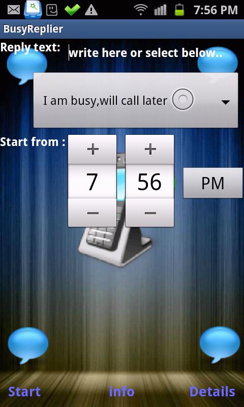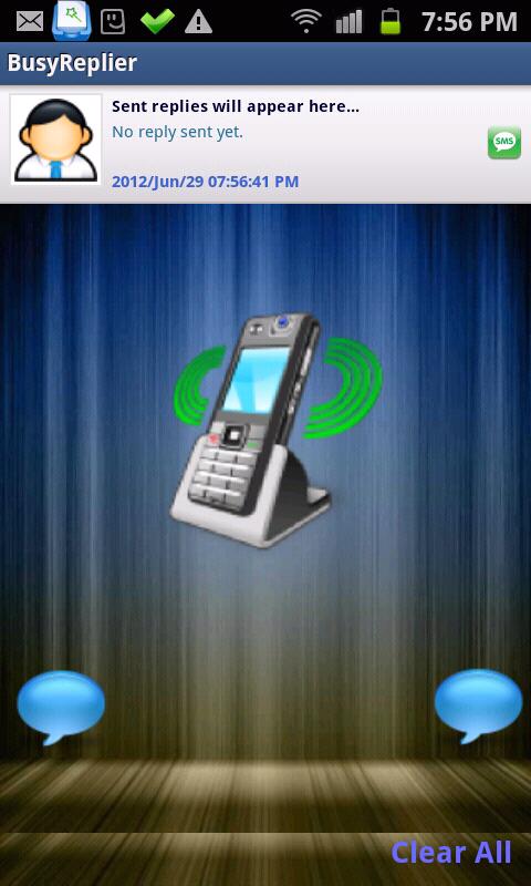 Automatic Busy Replier sends busy SMS messages when to the caller when you are busy and don't have time to reply.Automatic Busy Replier should be started to keep sending busy sms messages. Just type or select message form available messages list and click on start. Automatic Busy Replier will show the list of people and sms messages sent to them. Its usefull when you are driving , having lunch , in meeting , meditating and dont want any disturbance but want other people updated. example: I am busy,will call later. I am having lunch ,please call later. I am driving ,will call you later. I am writing exam,will be free at 2PM and much more messages you can write. You can also provide alternate number in messge if you want caller to call you on other number. Automatic Busy Replier is autoresponder to the incomming calls.