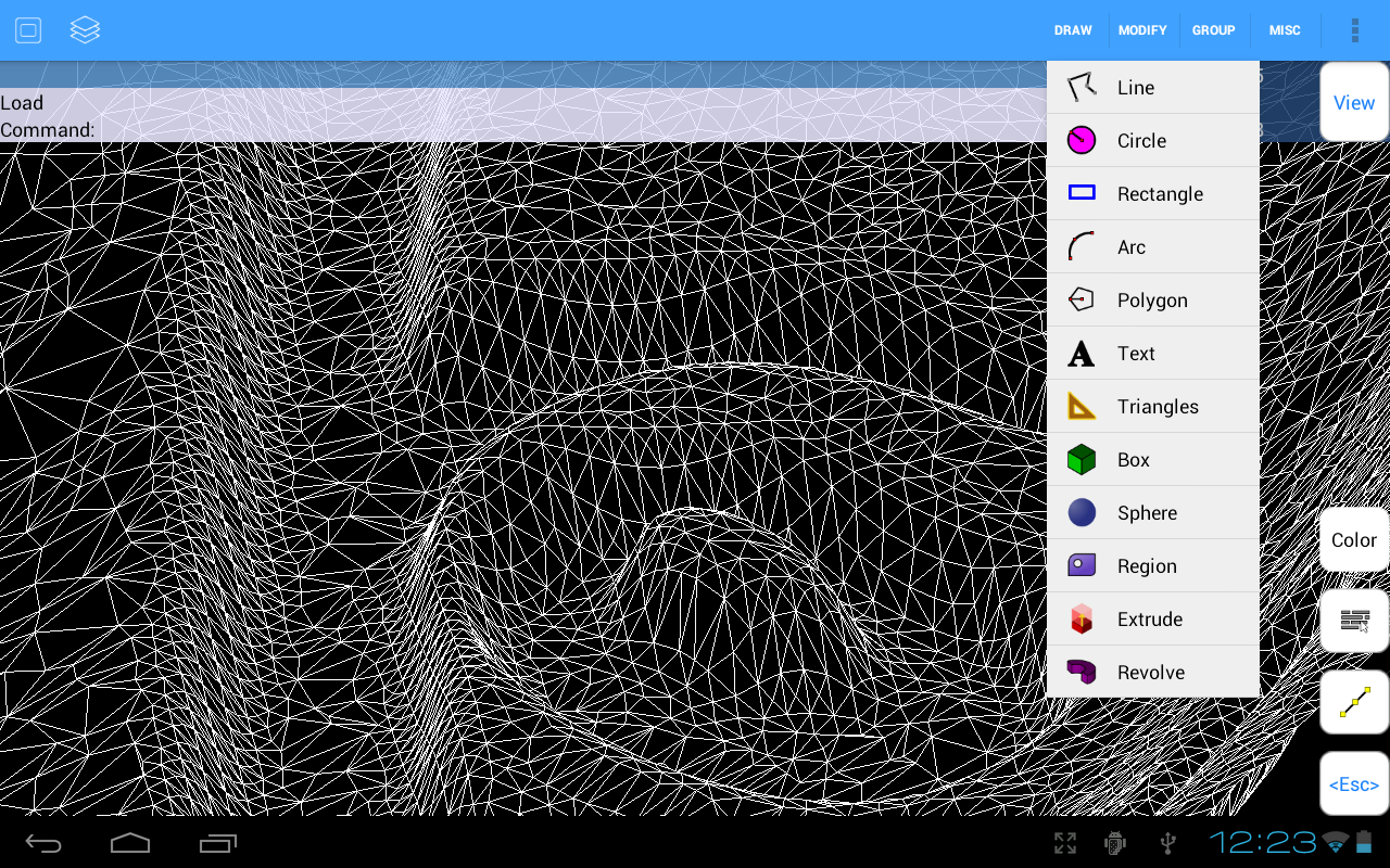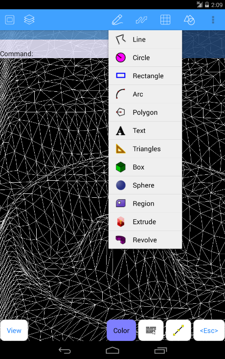 ・Tools: line, circle, rectangle, arc, polygon, text, triangles, box, sphere, region, extrude, revolve.