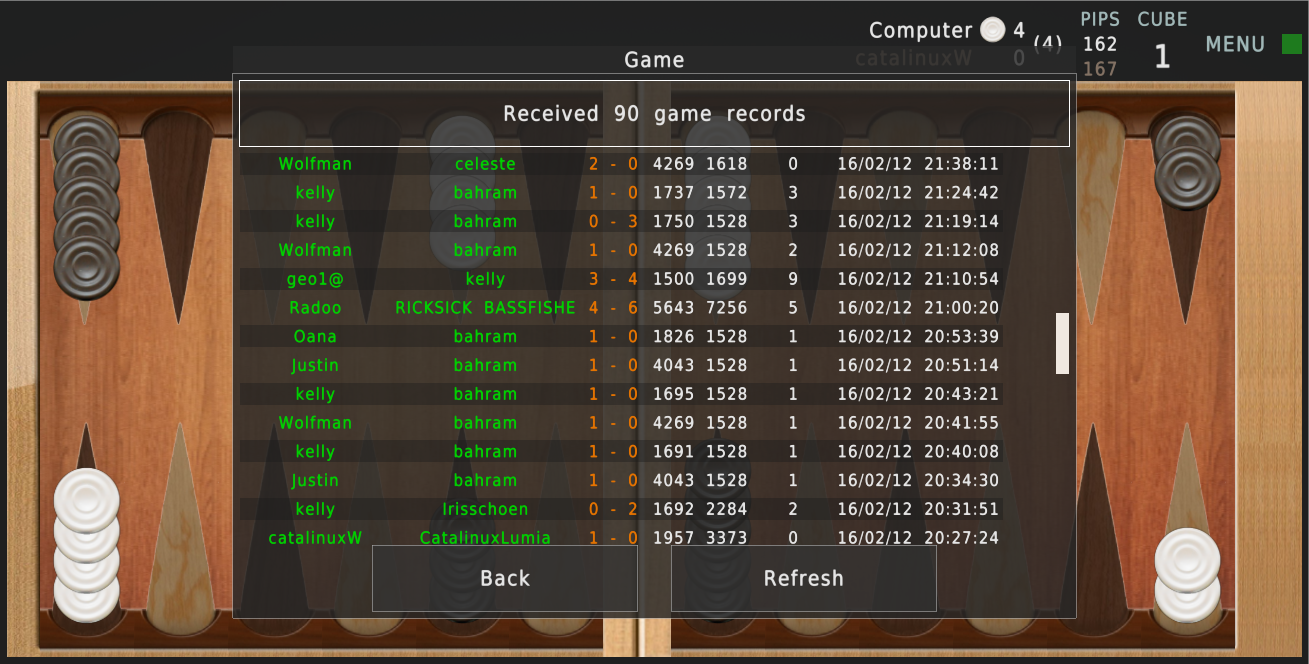 Das ist Backgammon Reloaded. Spiele im Offline-Modus gegen künstliche neuronale Netze, die für Tausende von Spielen im gemischten und Kaskadenmodus trainiert wurden. Spiele im Online-Modus gegen hochqualifizierte Spieler auf der ganzen Welt. Dies ist der Höhepunkt der Technik in Bezug auf Grafik und Netzwerkkommunikation. Geschrieben in C++ mit SDL2-Bibliothek als Abstraktionsschicht. Die Benutzeroberfläche wurde mit OpenGL ES 2.0 von Grund auf neu erstellt, sodass sie auf jedem Betriebssystem, sogar im Browser, ausgeführt werden kann. Animationen sind auf 60 Bilder pro Sekunde festgelegt. Die Netzwerkkommunikation verwendet nicht-blockierende TCP-Sockets mit Select-Pooling für einen hohen Durchsatz, sodass die App Spiele fortsetzen kann, während der Client die IP-Adressen ändert. Sie werden fast viele mindestens 70 Spieler finden, die mit dem Server verbunden sind. Im Laufe der Zeit wird es FIBS ersetzen, indem mehrere Clients auf verschiedenen Geräten (Desktop, Telefone, Smart-TVs) erstellt werden. Im Gegensatz zu anderen Spielen auf dem Markt wird jedes Spiel fortgesetzt, wenn die Verbindung aus verschiedenen Gründen wie IP-Änderungen unterbrochen wird. Keine Notwendigkeit, Google Play Services zu installieren. Alles wird über den Tellerrand hinaus funktionieren, während der Benutzer keine besonderen Berechtigungen erfragt. Spielen Sie Swing-, Sit&Go-Turniere. Die Benutzeroberfläche ist jetzt stark auf Geschwindigkeit und Akkuschonung optimiert. Angst, es zu installieren? Probiere es direkt in deinem Browser aus unter http://www.catalinux.eu/bg/em Spieler können laufende Spiele in Echtzeit verfolgen. Um ein Spiel anzusehen, gehe zur Option Online spielen -> Lobby -> Spiele -> Ansehen neben dem Spiel. Um das Spiel zu beenden, klicken Sie oben links in der Anwendung auf die Menüleiste und wählen Sie die Option Verlassen. Jeder Spieler kann den Spielstand jederzeit während des Spiels verdoppeln. Die Punktzahl, die Pip-Zahl und der Würfelwert werden auf der Oberseite angezeigt. Die Tabelle kann umgedreht werden, wenn der Benutzer es gewohnt ist. Die Farbe des Schachbretts kann von Schwarz auf Weiß geändert werden. Die Anzahl der Spiele kann von 1 bis 9 Spielen zugewiesen werden. Die Töne können stummgeschaltet werden. Im Auto-Match-Modus wird die Spielanfrage an alle Benutzer gesendet, die nicht spielen. Im Freundesmodus ist es möglich, Spieler nach Namen zu filtern (Groß-/Kleinschreibung beachten), mit ihnen zu chatten und das Spielen eines Spiels anzufordern. Spiel-Timer werden verwendet, um zu vermeiden, zu lange auf den Zug des Gegners oder die doppelte Bestätigung zu warten. Auf der rechten Seite des Spielbretts wurden zwei grüne Pfeile hinzugefügt, um den aktuellen Spielzug anzuzeigen. Chat-Unterstützung wurde ebenfalls hinzugefügt, dort können Spieler miteinander sprechen. Unicode-Zeichen werden nicht unterstützt. Verfügbar für Windows 10 und Android. Planung unter Windows 8 und IOS... Spielen Sie Backgammon Reloaded von überall mit jedem. Es gibt eine Reset-Taste in den Menüoptionen für den Panikmodus. Was bedeutet dies, um die Verbindung zum Server zu trennen und das Board zurückzusetzen. Video: https://www.youtube.com/watch?v=qyb0R71MxTk Viel Spaß ;)