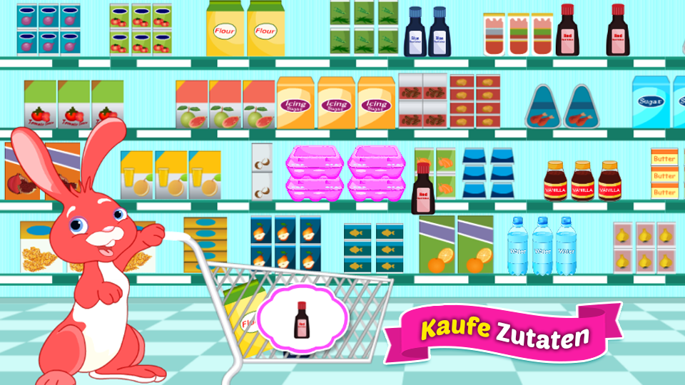 Beginnen Sie dieses Spiel in einem Geschäft, wo Sie die Zutaten auswählen müssen, die Sie benötigen, um Karamell-Cupcakes zuzubereiten.