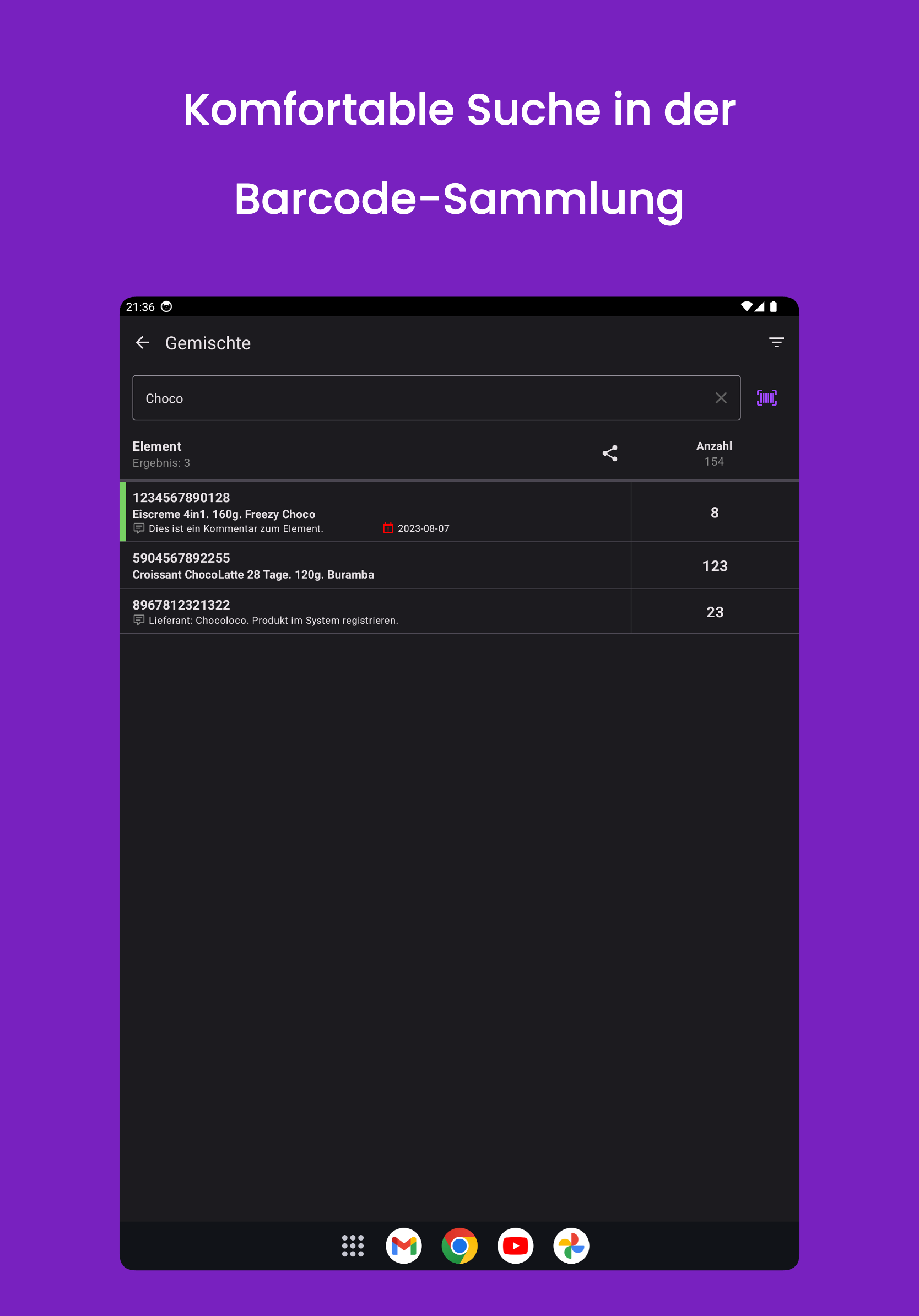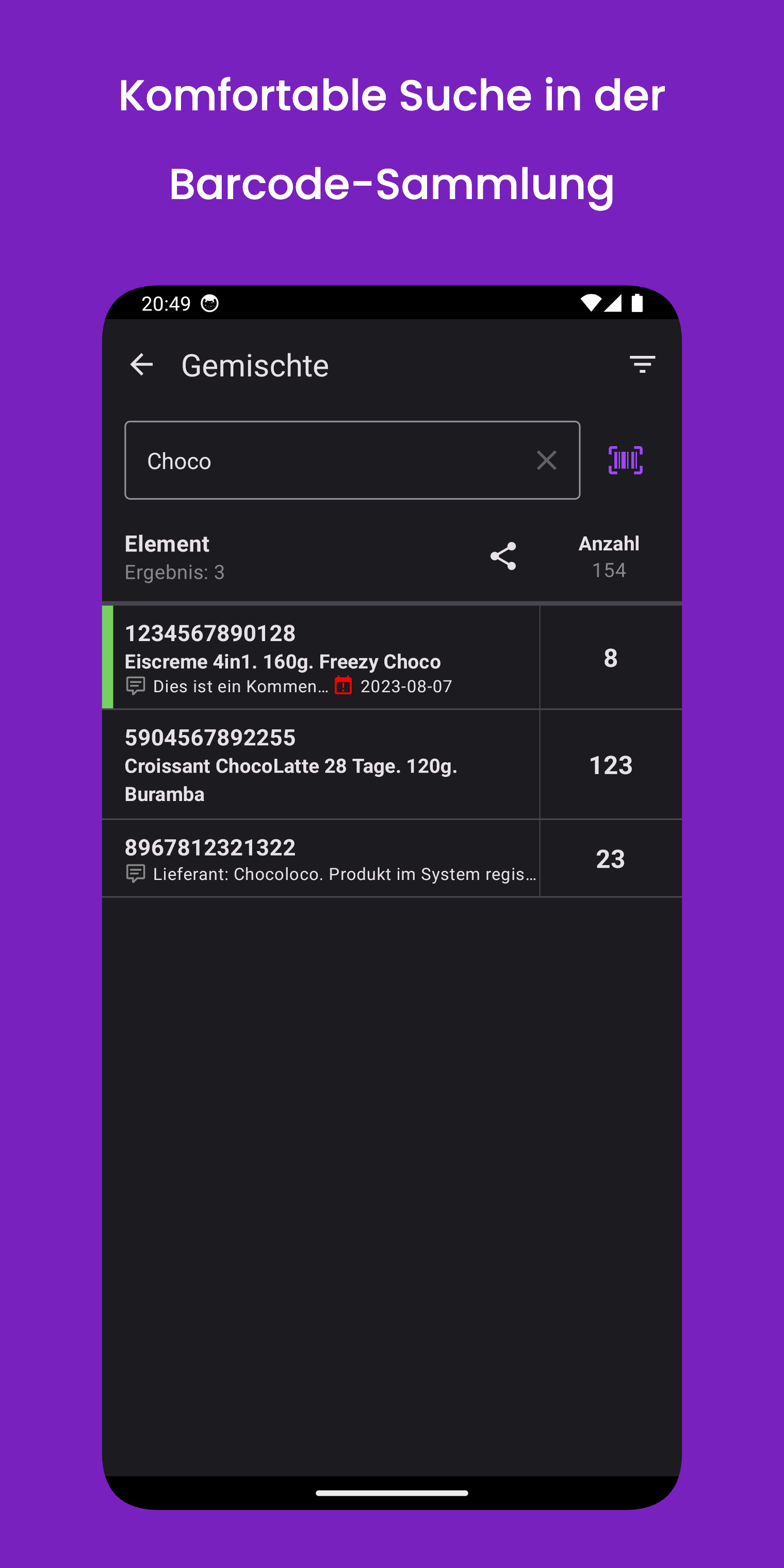 Finden Sie den Barcode oder das Produkt schnell mithilfe der Suchfunktion.