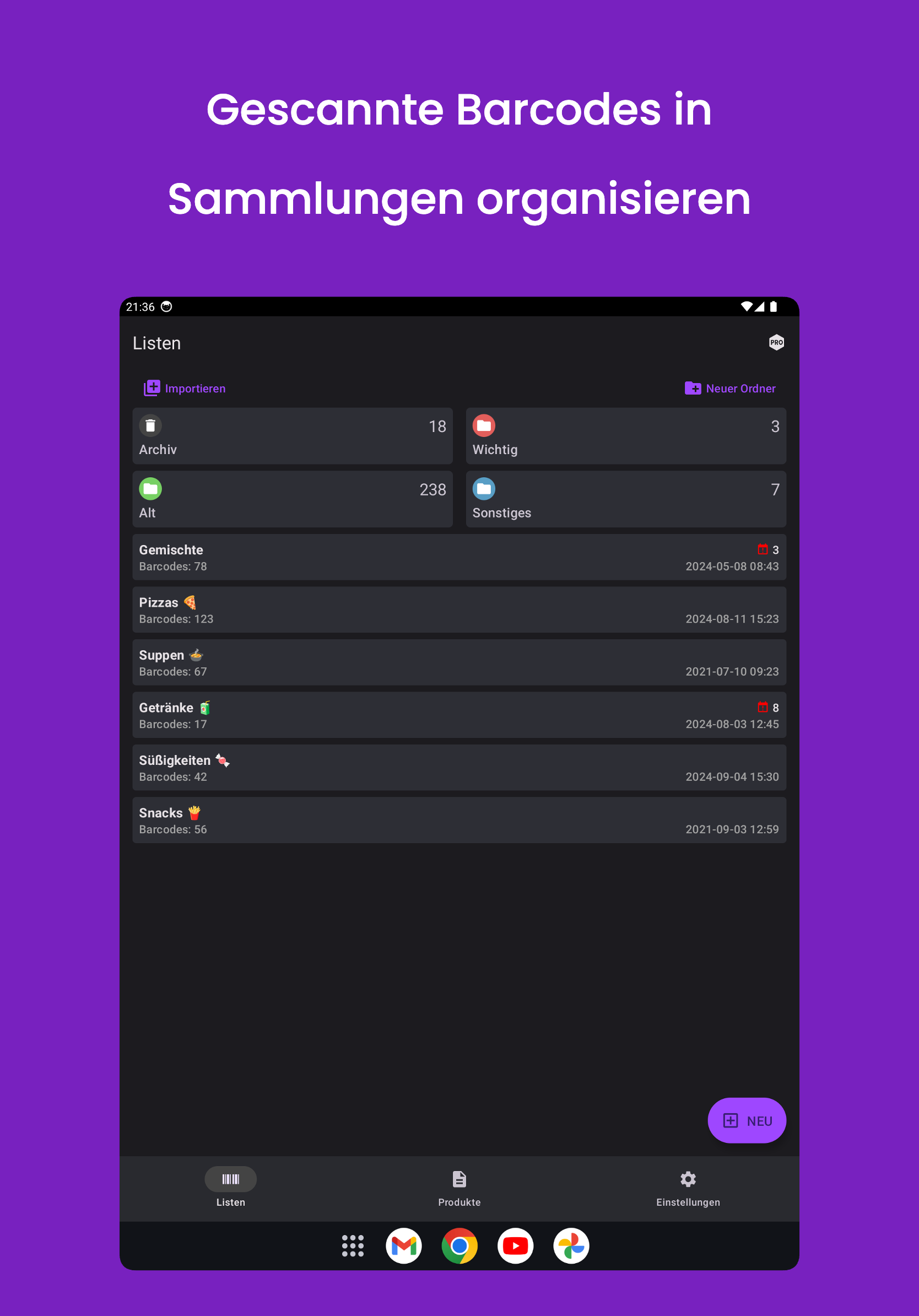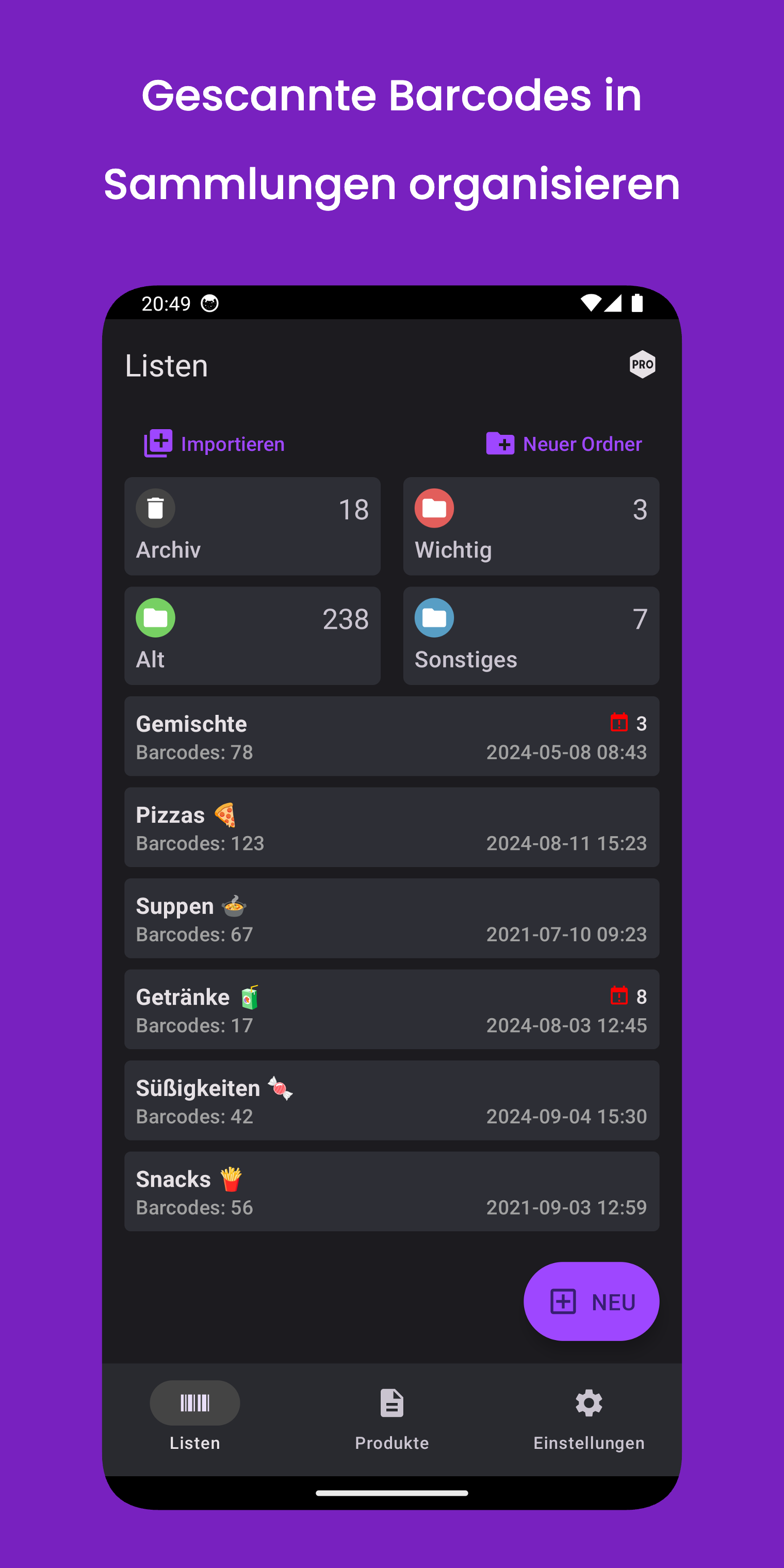 Teilen Sie eine Liste gescannter Barcodes oder importieren Sie Ihre Liste in die App.