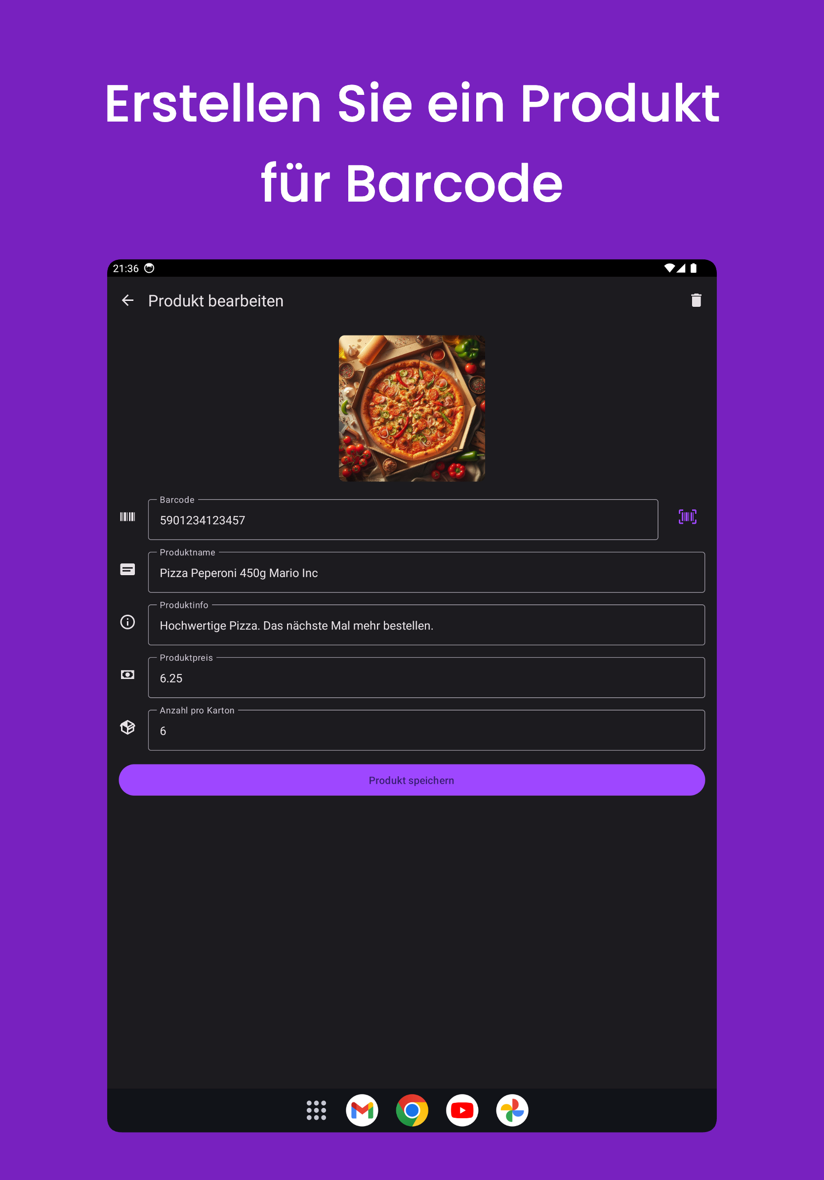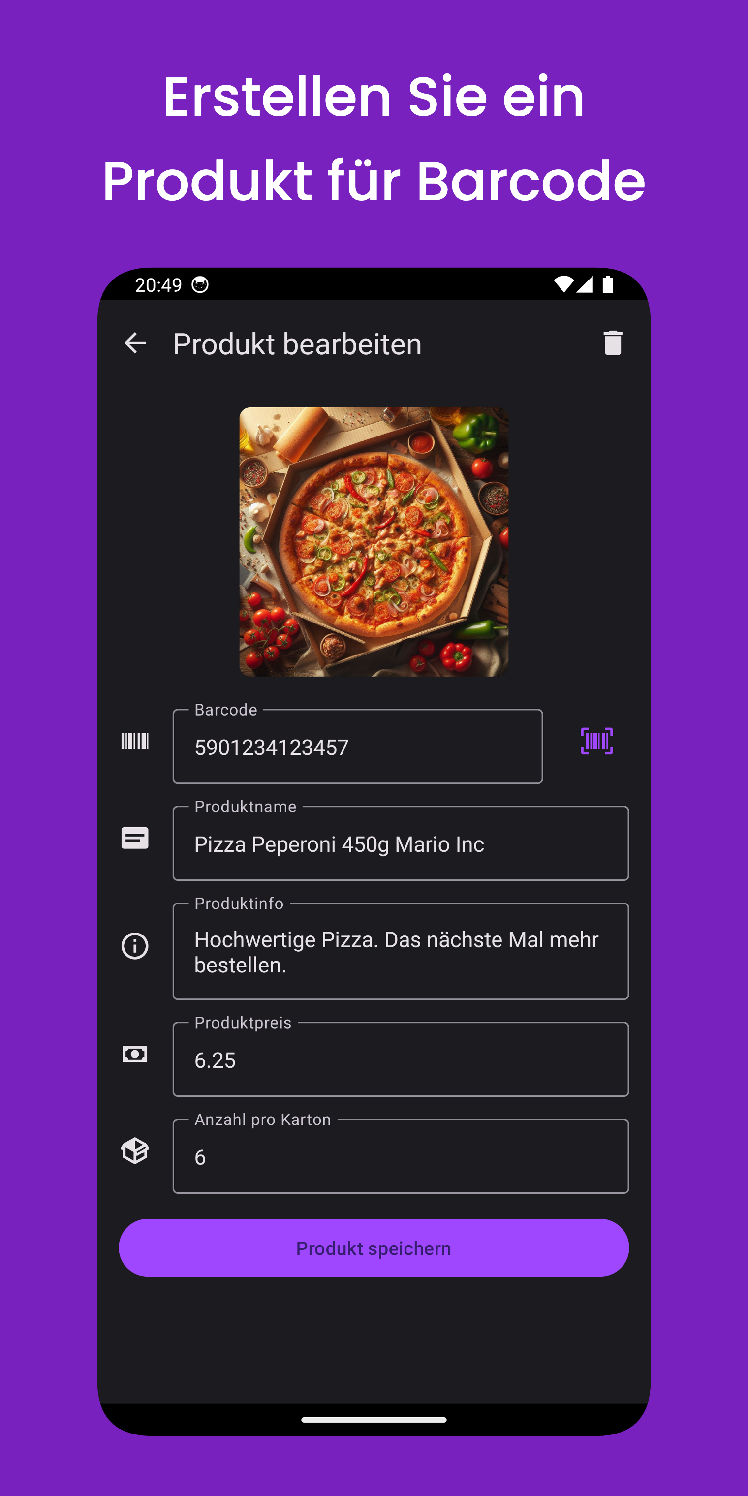 Durch Scannen des Barcodes werden die gespeicherten Produktdetails angezeigt, einschließlich Name, Preis und Bilder.