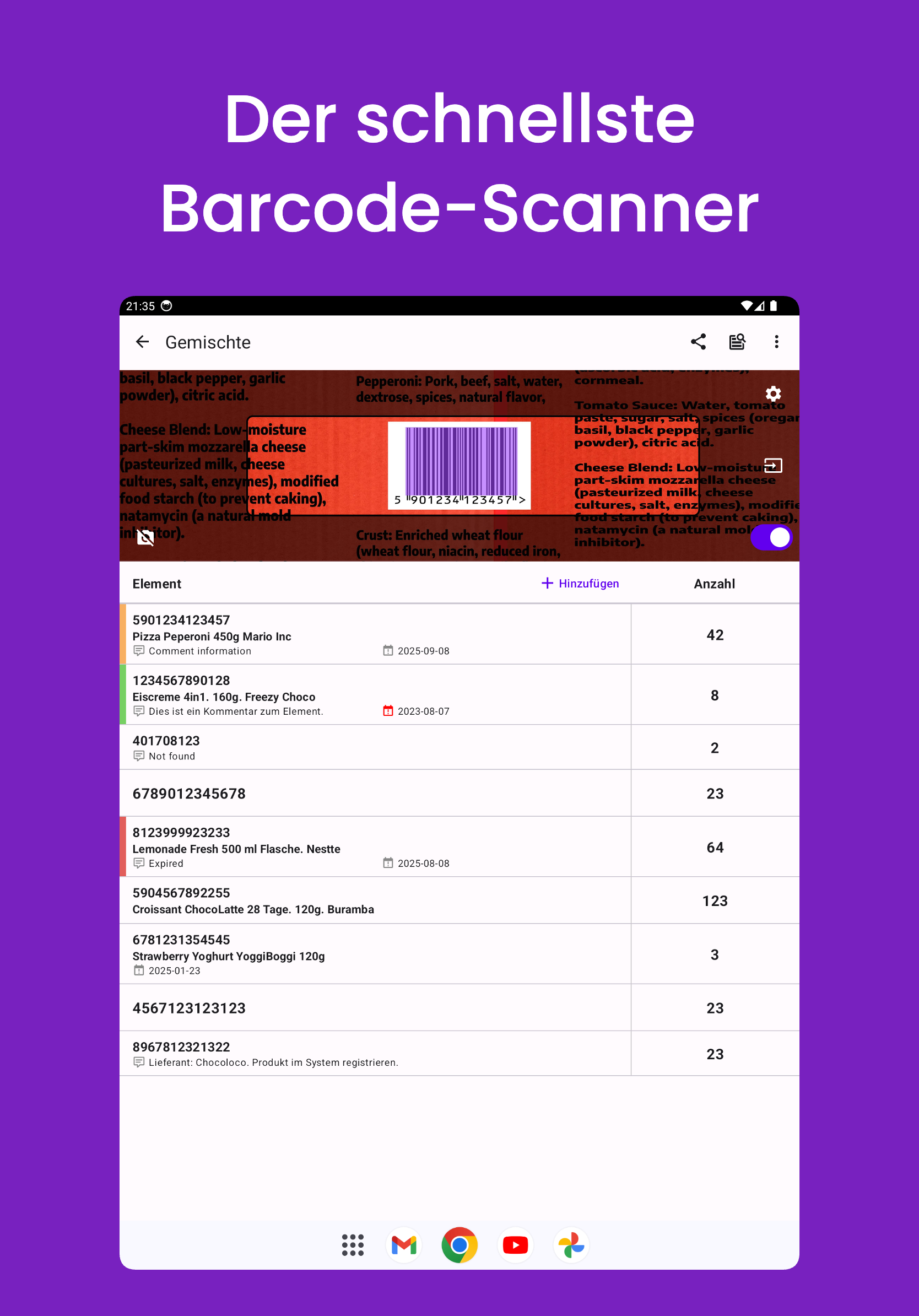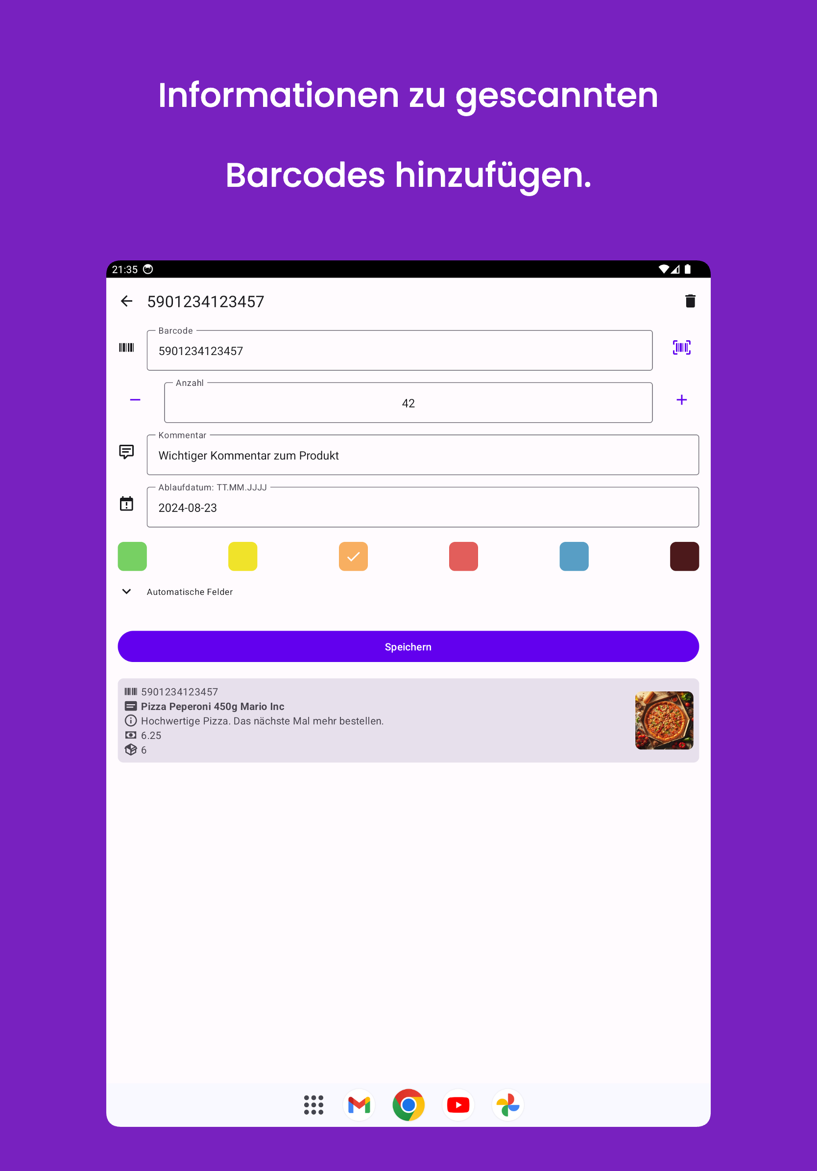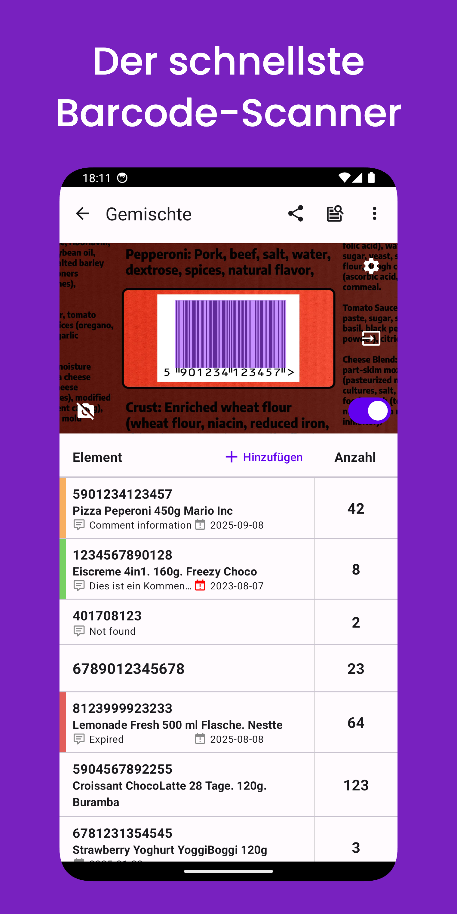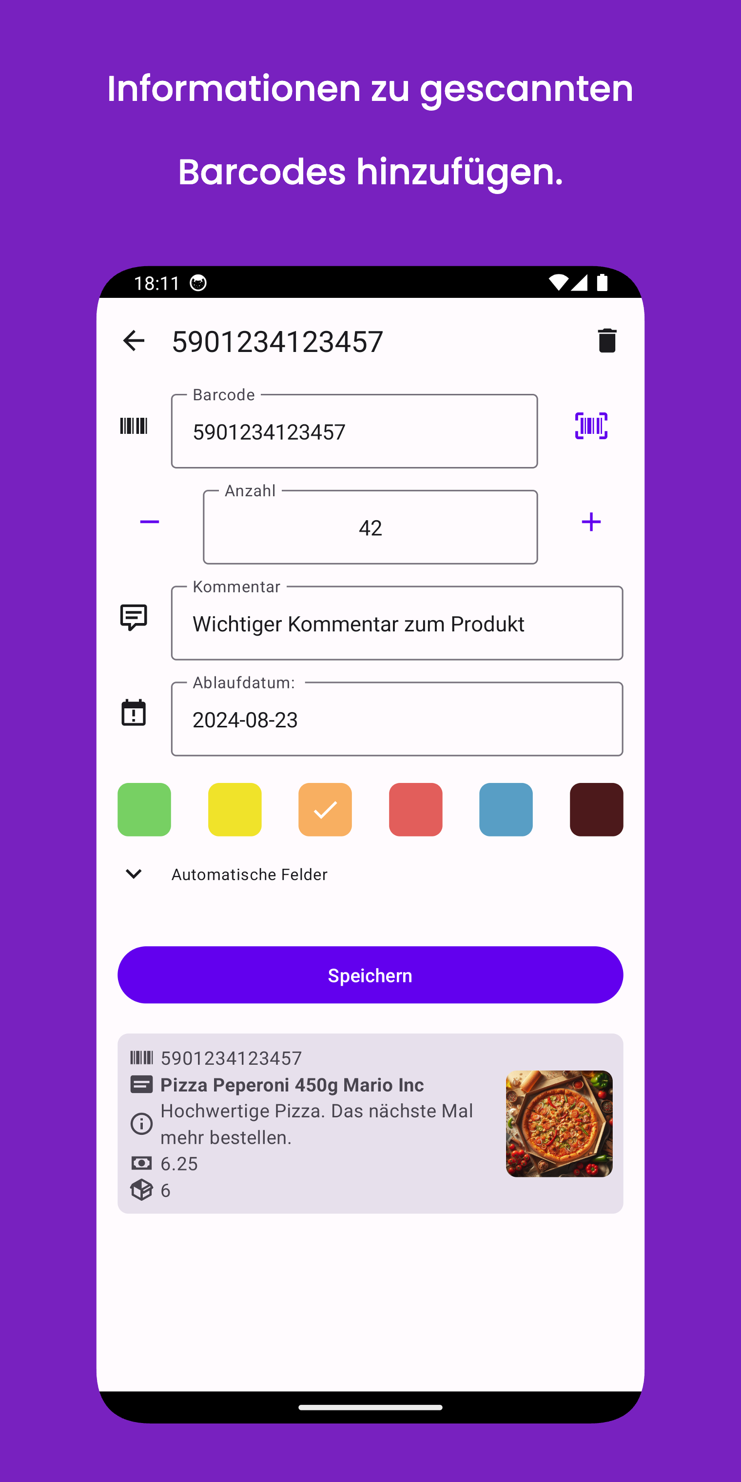 Sie können dem gescannten Barcode auch zusätzliche Daten hinzufügen, wie z. B. Menge, Kommentar, Ablaufdatum oder ihn zur Unterscheidung mit einer bestimmten Farbe markieren. Wenn das nicht ausreicht, können Sie Produkte aus Ihrem Inventarsystem erstellen oder importieren – jedes Mal, wenn Sie den entsprechenden Barcode scannen, erhalten Sie sofort die relevanten Daten dazu.