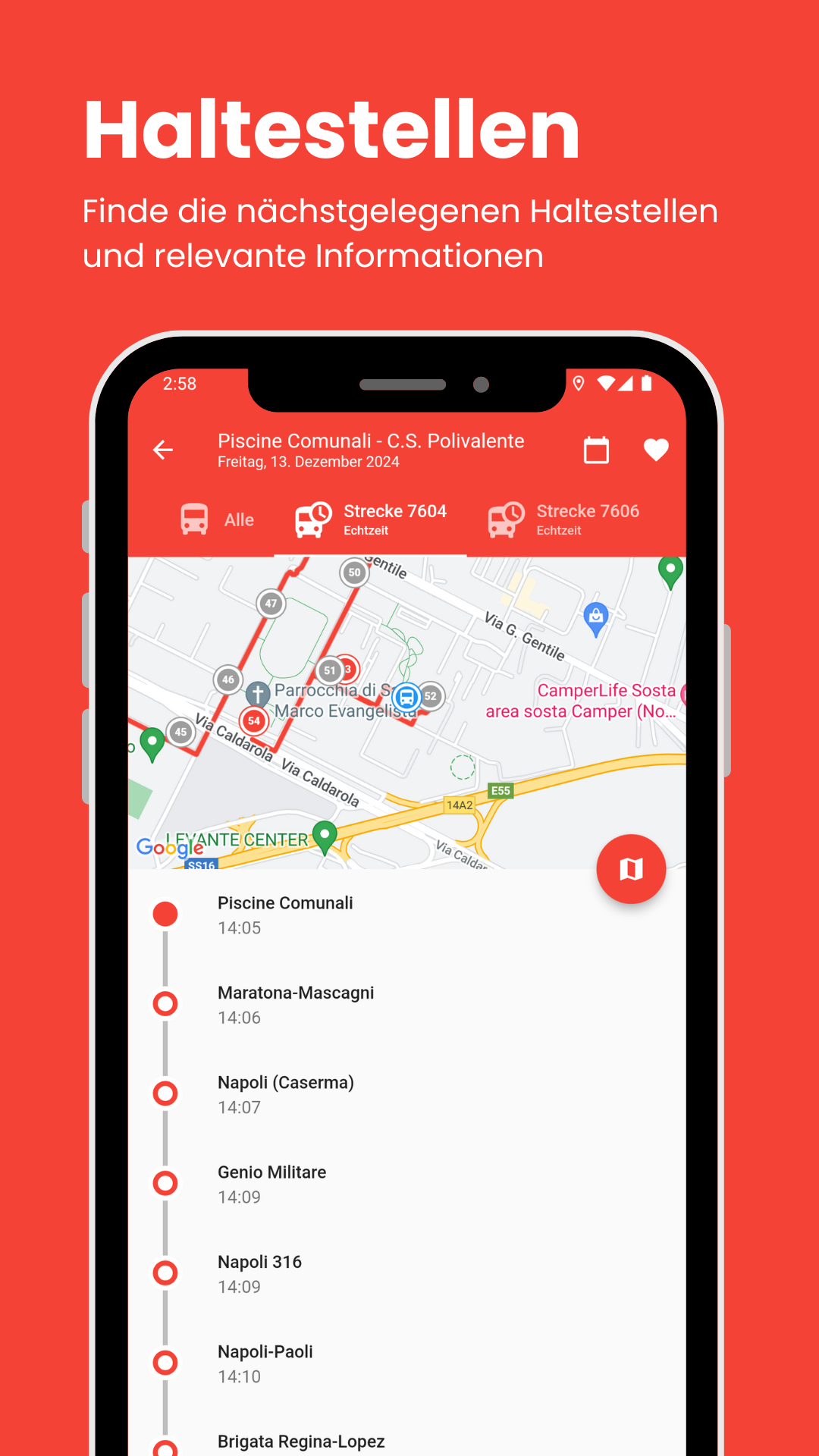 Mit der integrierten Geolokalisierung kannst du nahegelegene Bushaltestellen direkt auf der Karte sehen. Egal wo du bist, du weißt immer, wo du den nächsten Bus nehmen kannst.