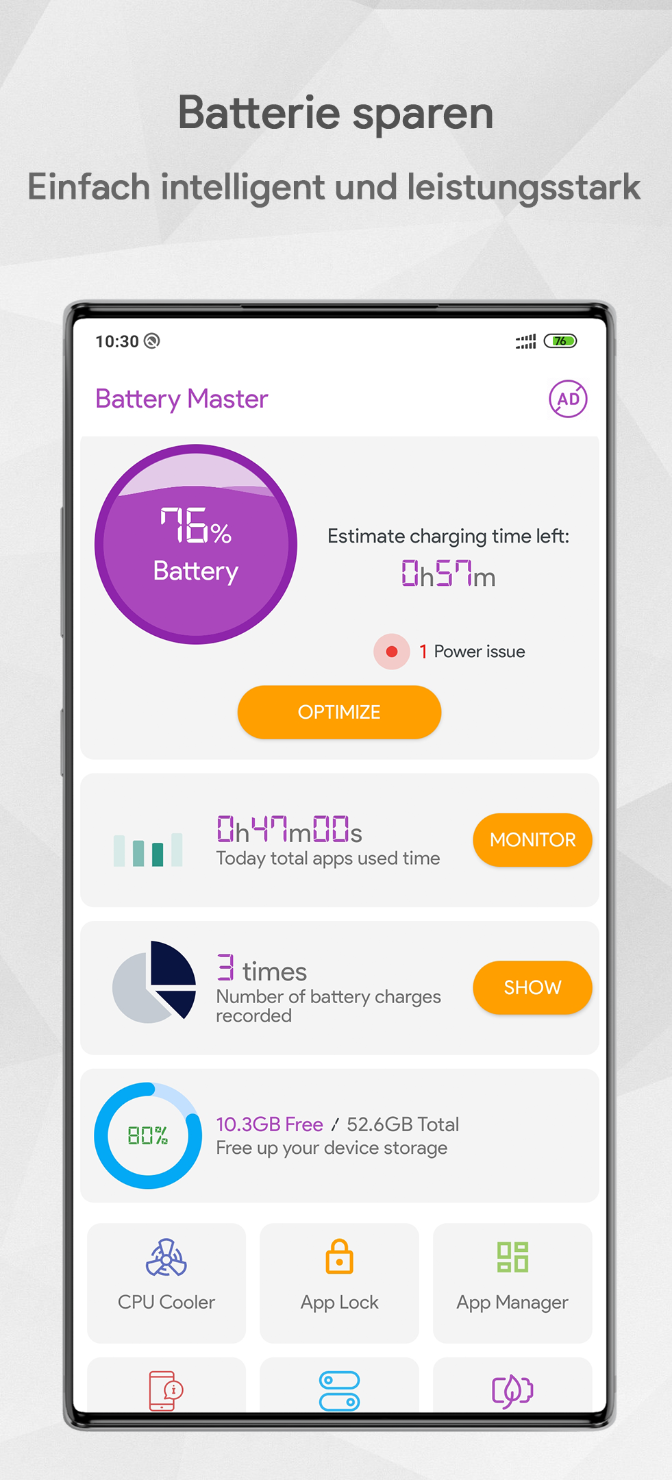 Batterie sparmodus (Paketname: researchcenter.batterysaver.fastcharger.powerdoctor.batterydoctor) wird von Power Research Center entwickelt und die neueste Version von Battery Saver Akku-Sparer, App Lock Super Sauberer 1.1.4 wurde am 29. Oktober 2021 aktualisiert. Battery Saver Akku-Sparer, App Lock Super Sauberer liegt in der Kategorie von Tools. Sie können alle Apps von dem Entwickler der Battery Saver Akku-Sparer, App Lock Super Sauberer durchsuchen und 102 alternative Apps zu Battery Saver Akku-Sparer, App Lock Super Sauberer auf Android finden. Derzeit ist diese APP kostenlos. Diese App kann auf Android 4.1+ auf APKFab oder Google Play heruntergeladen werden. Alle APK/XAPK Dateien auf APKFab.com sind original und 100% sicher, schnell herunterzuladen.
