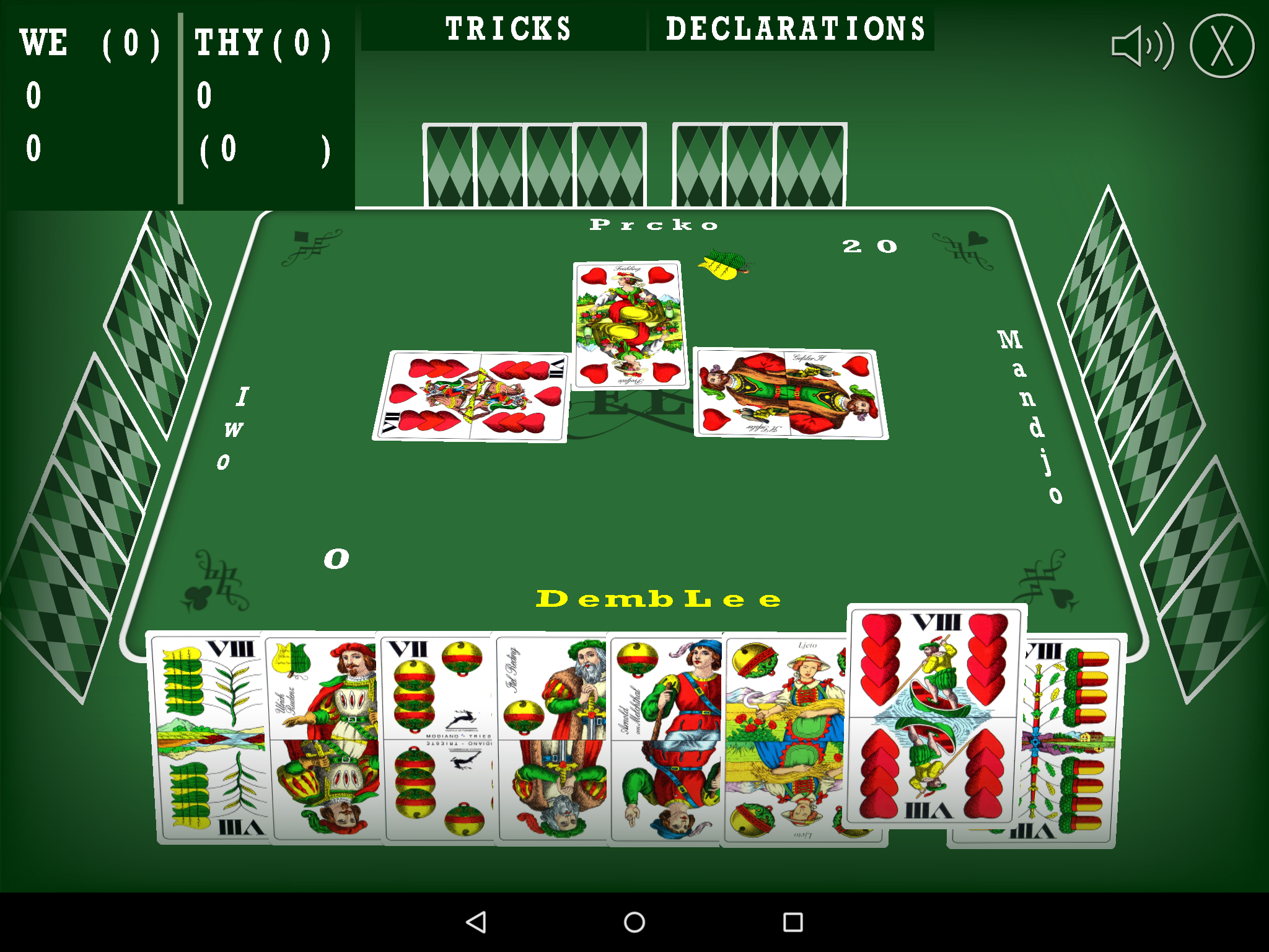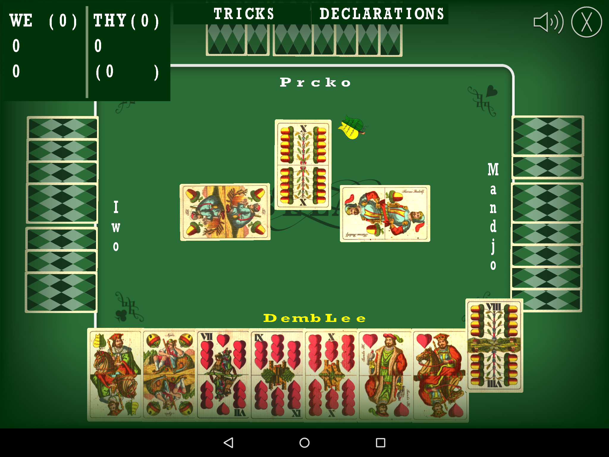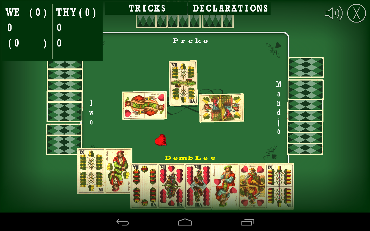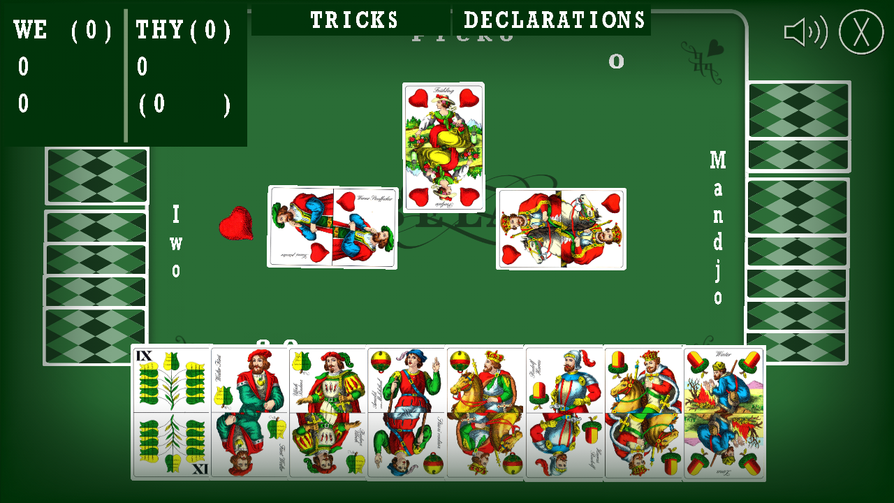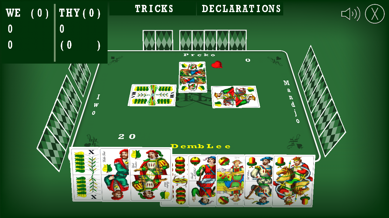 Bela (oder Belot), eine Simulation eines beliebten Kartenspiels. Das Spiel wird mit 32 Karten im ungarischen Stil gespielt. Dieses Kartenspiel wird hauptsächlich auf dem Balkan und vielleicht in einigen anderen Teilen der Welt gespielt. Du spielst ein Vier-Spieler-Spiel, bei dem dein Team gegen ein Team von (so genannten) Spielern der künstlichen Intelligenz spielt. Hoffentlich wirst du es genießen..
